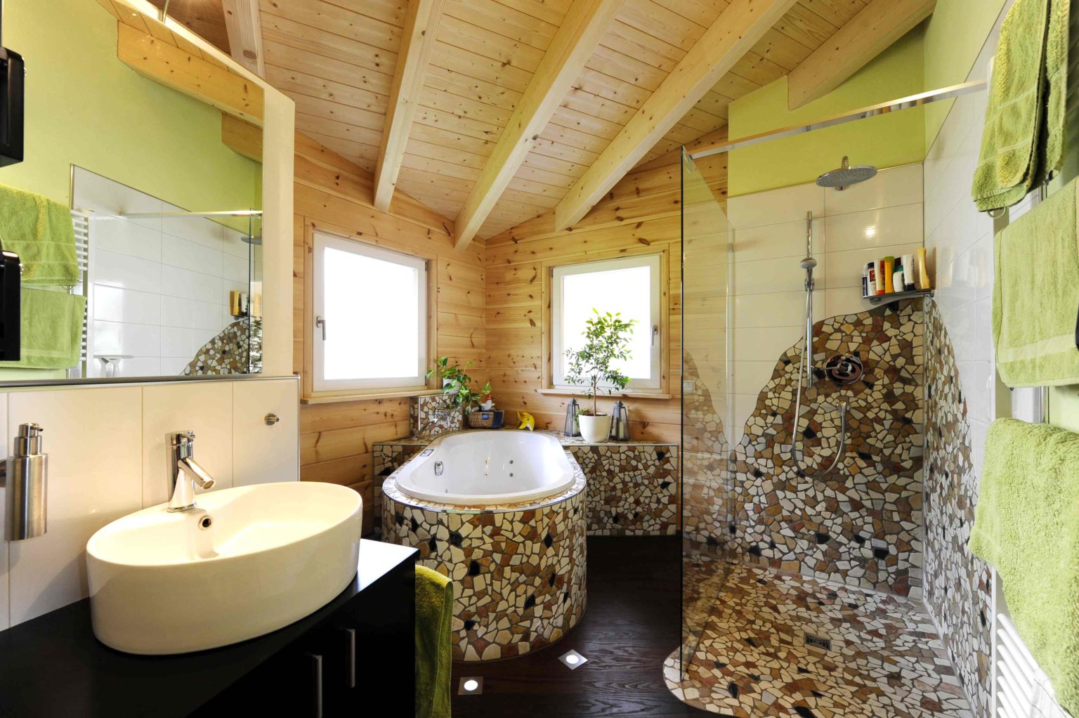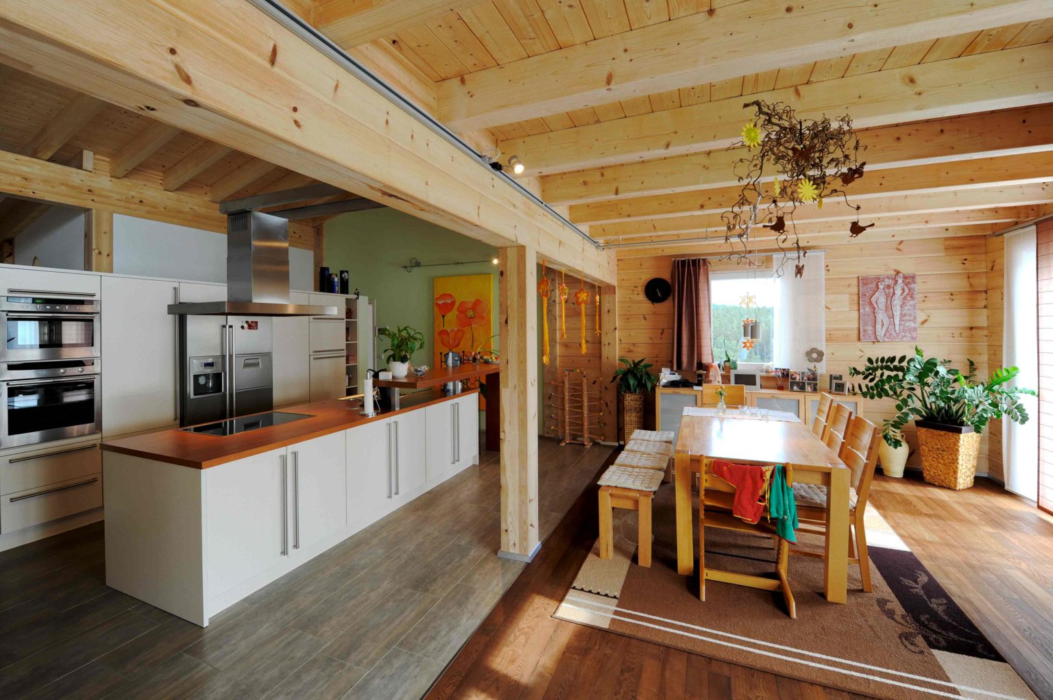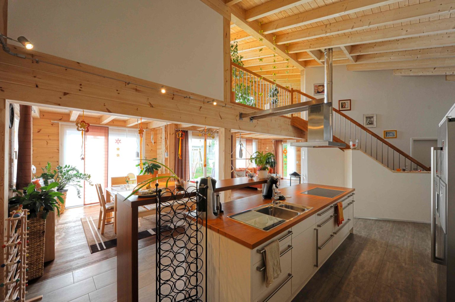 Der weitläufige offene Wohnbereich des Holzhaus ist gegliedert in Eingangshalle, Flur, Küche, Essbereich und Sofaecke. Eine großzügige Galerie unterbricht teilweise die enorme Raumhöhe. In der geschickt separierten aber offenen Sofaecke unter der Galerie, also mit deutlich verminderter Raumhöhe, macht es sich die Familie gerne vor dem Kaminofen gemütlich. Bodentiefe Fenster lassen auch hier viel Tageslicht herein, das von der den Fenstern gegenüber liegenden weißgestrichenen Wand reflektiert wird. In der Raummitte befindet sich die offene Küche. Rückendeckung bekommt sie von der hellgrün gestrichenen Trennwand zum Flur hin. Ein gliederndes Raumelement, das Küchenschränke und –geräte allseits umschließt und lediglich eine glatte Fläche in Weiß und Edelstahl zur Küchenseite hin hinterlässt. Ein paar Schritte nur, und das Essen kann auf dem großen Esstisch serviert werden. Durch diese Offenheit im gesamten Holzhaus hat die junge Mutter immer alles im Blick. Auch was die Kinder gerade draußen im Garten anstellen bleibt ihr, dank der bodentiefen Fenster gegenüber Küche und Essbereich, nicht verborgen. Die gesamte Wand der Blockhaus Villa wird von großen Fenstern unterbrochen, auch oben auf der Galerie. Eine Holztreppe führt hinauf. Oben befindet sich eine weitere gemütliche Sofaecke unter der heimeligen Schräges des Pultdaches. Links geht es über die großzügige, durch Tageslicht erhellte Galerie zum dritten Kinderzimmer des Hauses. Weite Ausblicke durch große Glasflächen hinaus genießen die Bewohner in der „Galerieetage“. Ebenso hat man von hier oben den Überblick über den gesamten Wohnbereich des Erdgeschosses.