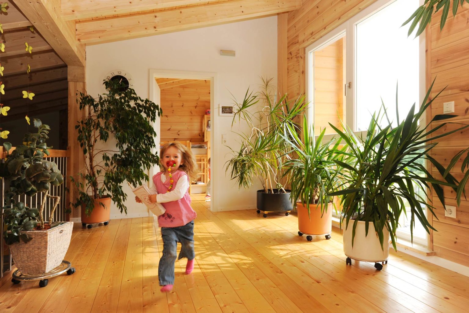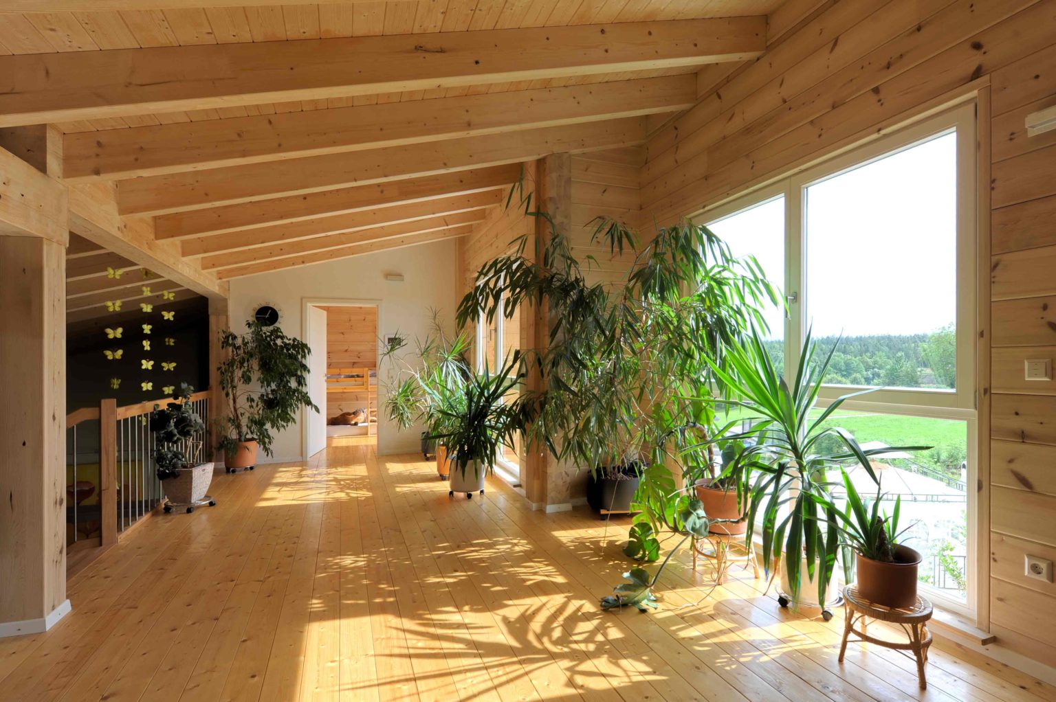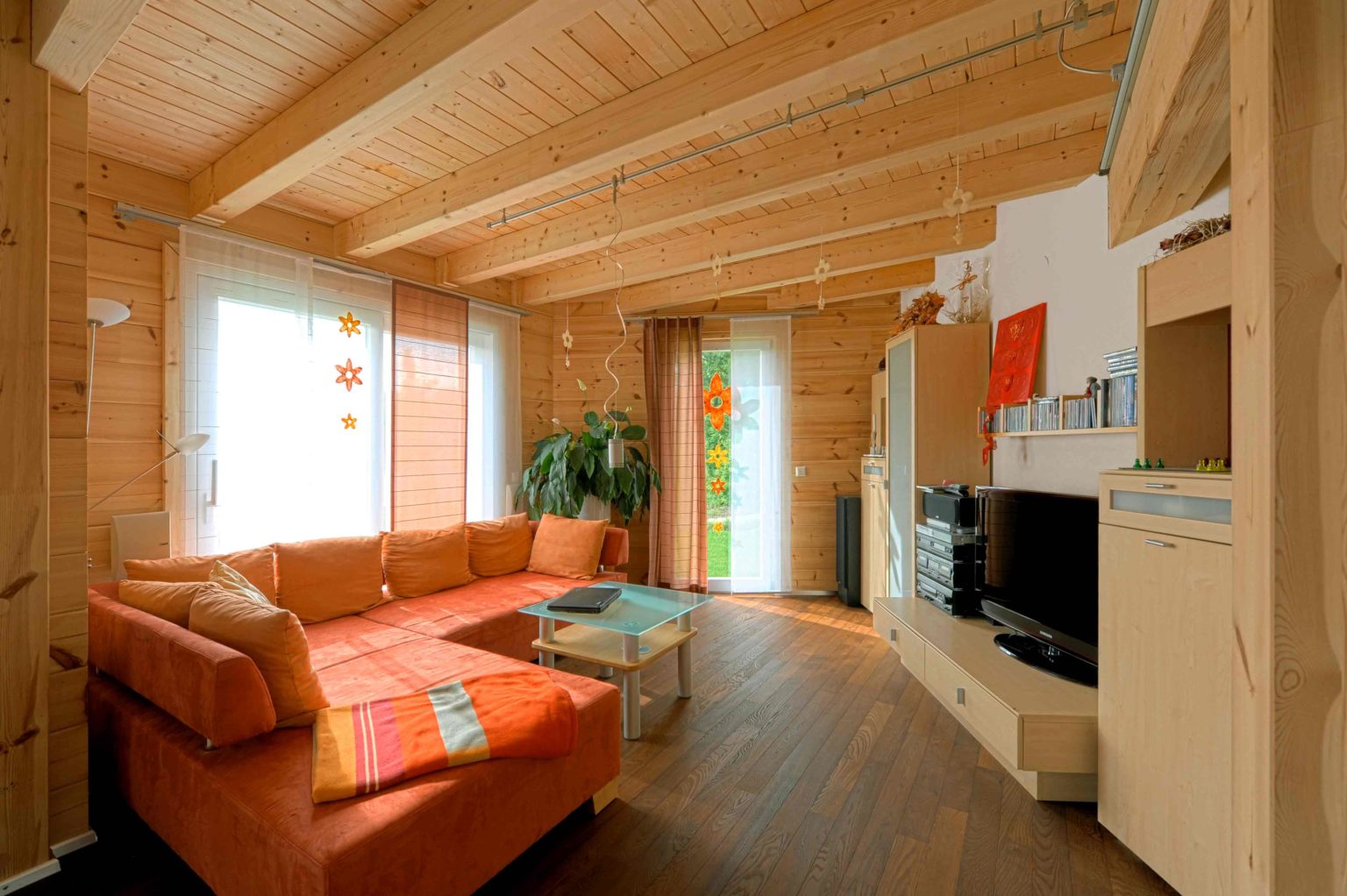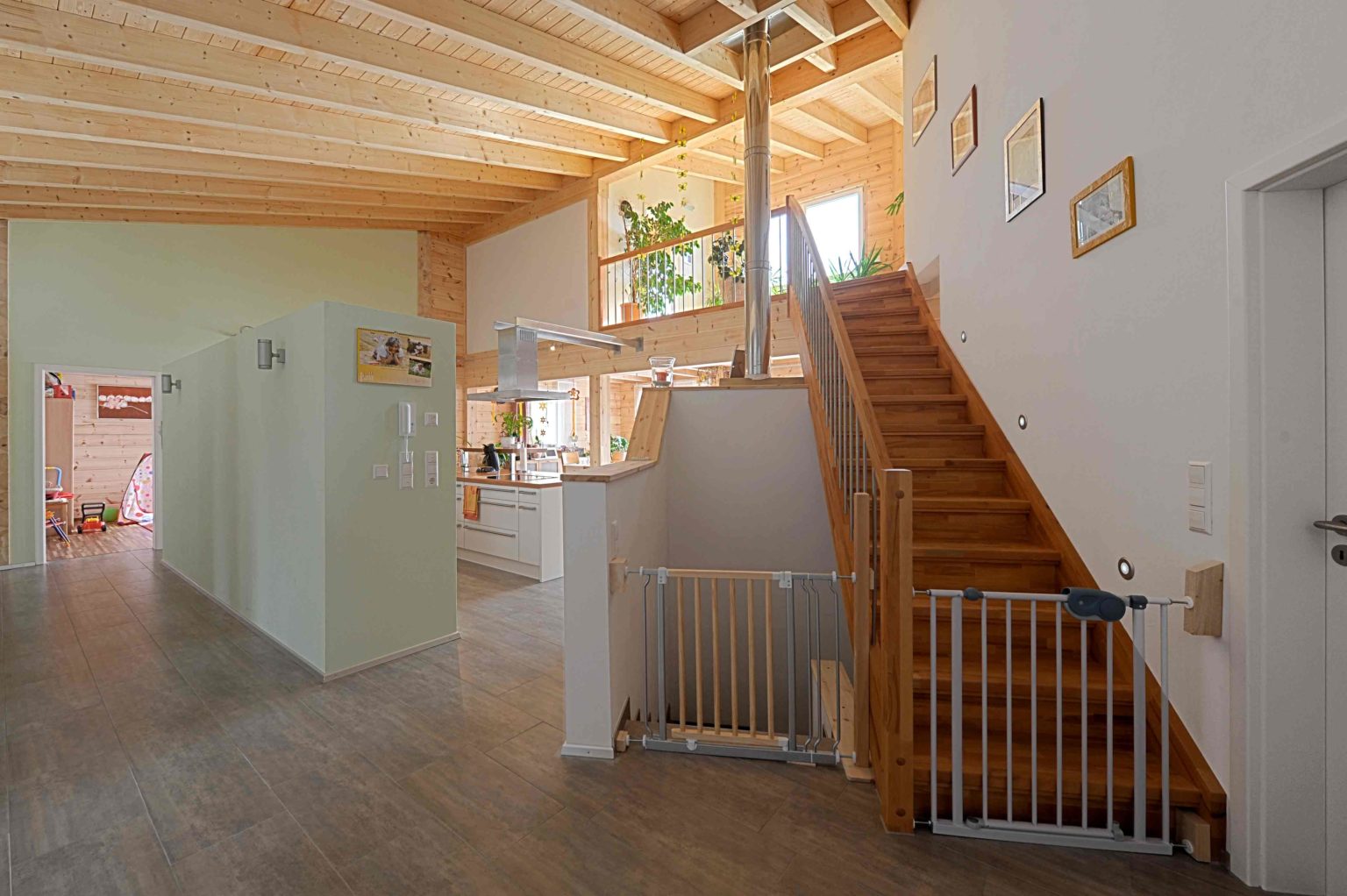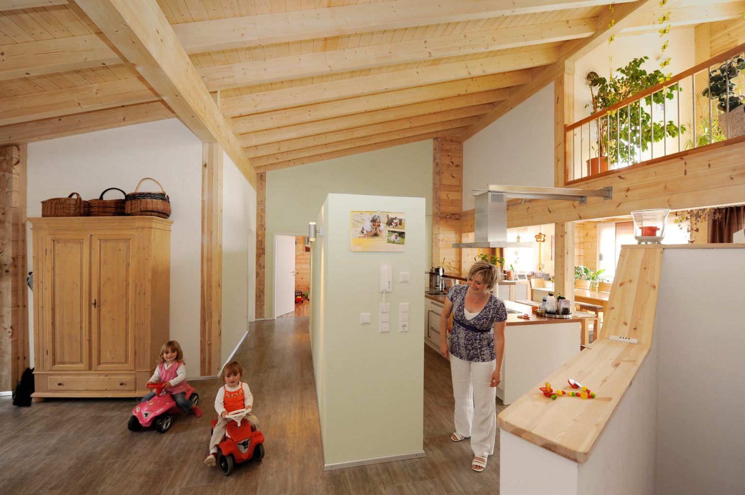 Wichtig war dem jungen Baupaar auch auf einer Ebene mit viel Freiraum und Helligkeit zu wohnen. Das erklärt die enorme Raumhöhe im Holzhaus, offen bis unter das Pultdach, und die offene Wohnsituation, bei der lediglich die Schlafzimmer und das Bad separiert sind. Große Fensterflächen und viele hell gestrichenen Wände unterstreichen den Eindruck. Die dunkler gehaltenen Böden bilden einen schönen Kontrast und erden die Bewohner. In den Kinderzimmern und dem Elternschlafzimmer herrschen massive Holzwände und –decken vor, um diesen Räumen ein großes Maß an Geborgenheit zu verleihen: so ist es dort trotz der hohen Decken gemütlich und intim.