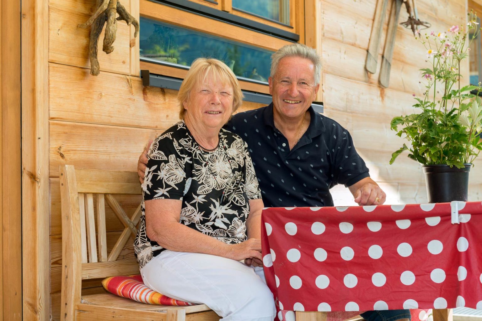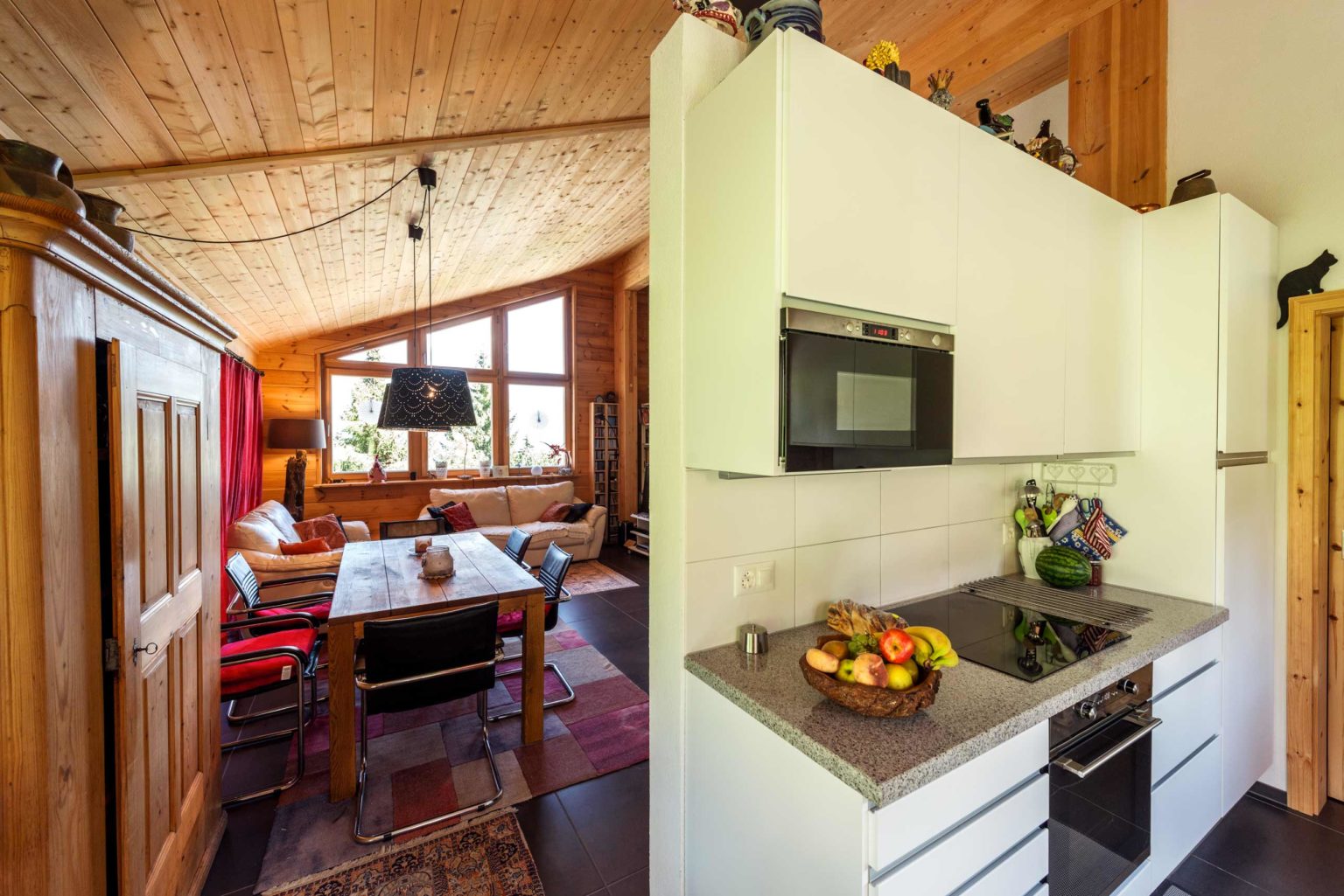 ​Die Hanglage von Holzhaus „Rothornblick“ ermöglicht ein zum Tal offenes, bewohnbares Kellergeschoss, in dem sich auch eine Garage und ein Technikraum befinden. Dank der Setzungsfreiheit der robusten Holzwände ist deren Kombination mit den Betonsteinen des Kellers problemlos möglich. „Wir nutzen hauptsächlich das Erdgeschoss und beherbergen Gäste (Familie) im Untergeschoss.“, erklärt Sonja Rüber. Da sich das Holzhaus in einem beliebten Wander- und Familienskigebiet befindet, kommen die Kinder der Rübers gerne samt Nachwuchs zu Besuch. Die Schneelast des Daches musste entsprechend aufwändig berechnet werden. Von der Straße kommend, betritt man das Gebäude durch den Keller, gelangt vom Windfang in den Flur und steigt über eine Geschosstreppe hinauf. Unten stehen Gästen ein Schlafzimmer, eine großzügige Sauna, eine Gäste-Dusche/WC und eine Wohnküche zur Verfügung. Im Erdgeschoss gibt es einen langgestreckten offenen Wohn/Ess/Kochbereich, ein Schlafzimmer mit angeschlossener Ankleide und Zugang zum Badezimmer, eine Garderobe und ein Gäste-WC. Die Geschosstreppe befindet sich mittig im Haus und führt in den Wohnbereich, von dem die restlichen genannten Räume zu erreichen sind. Die Küche wurde mittels einer leichten, weiß verputzten Trennwand optisch vom Wohn/Essbereich getrennt, ist diesem aber dennoch offen zugewandt. Ein Abstellraum (zwischen Küche und Schlafzimmer) schließt sich der Küche praktischerweise an. „Dank der vielen, großen, teils bodentiefen Fenster haben wir von überall einen herrlichen Blick auf die Berglandschaft. Und natürlich reichlich natürliches Licht im Haus.“, freut sich Theodor Rüber. Bei schönem Wetter sitzt das Paar am liebsten mit Freunden und Familie auf der großen Sonnenterrasse. Diese erreicht man direkt von der Küche aus – hat also einen kurzen Weg um Essen und Getränke zu tragen.