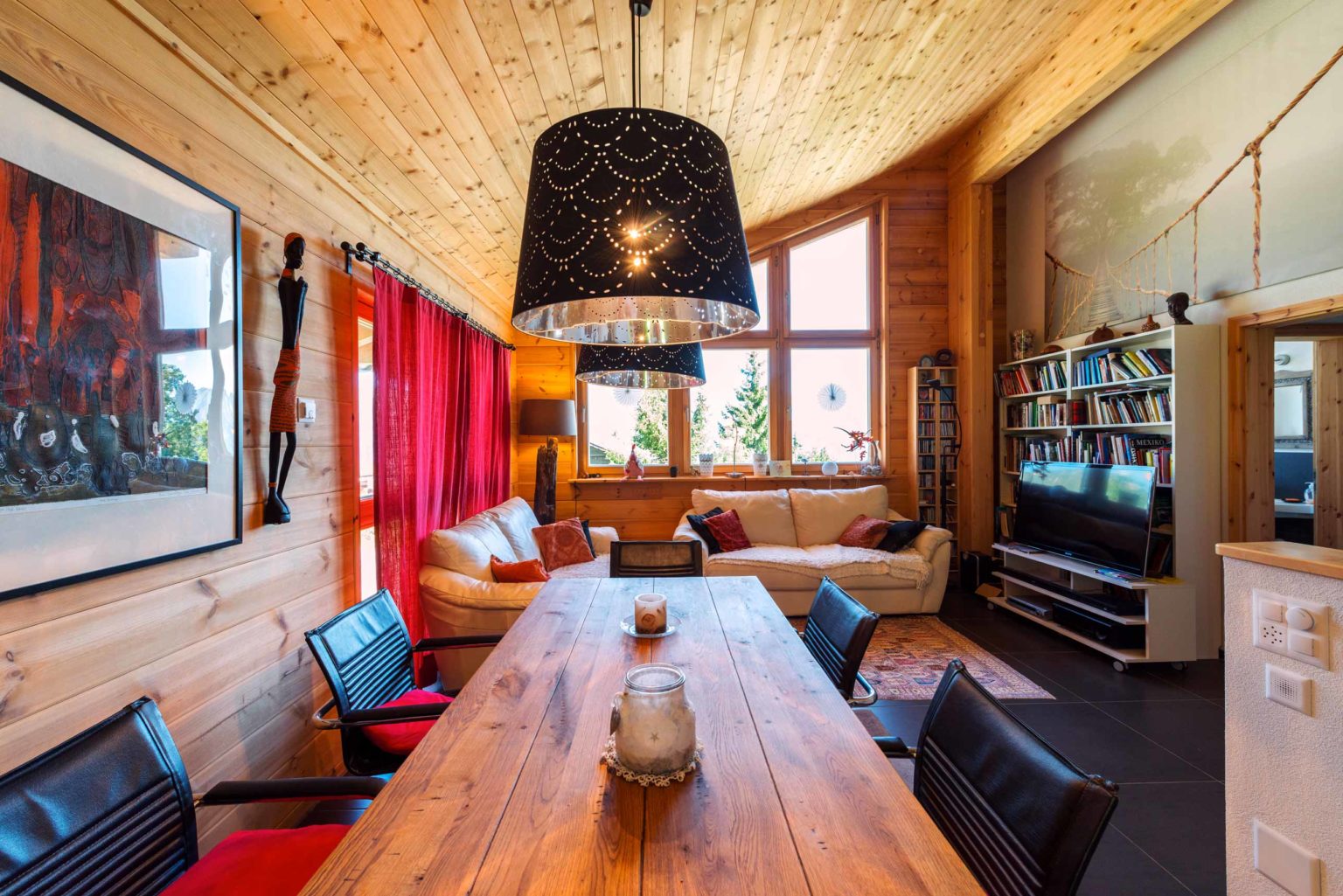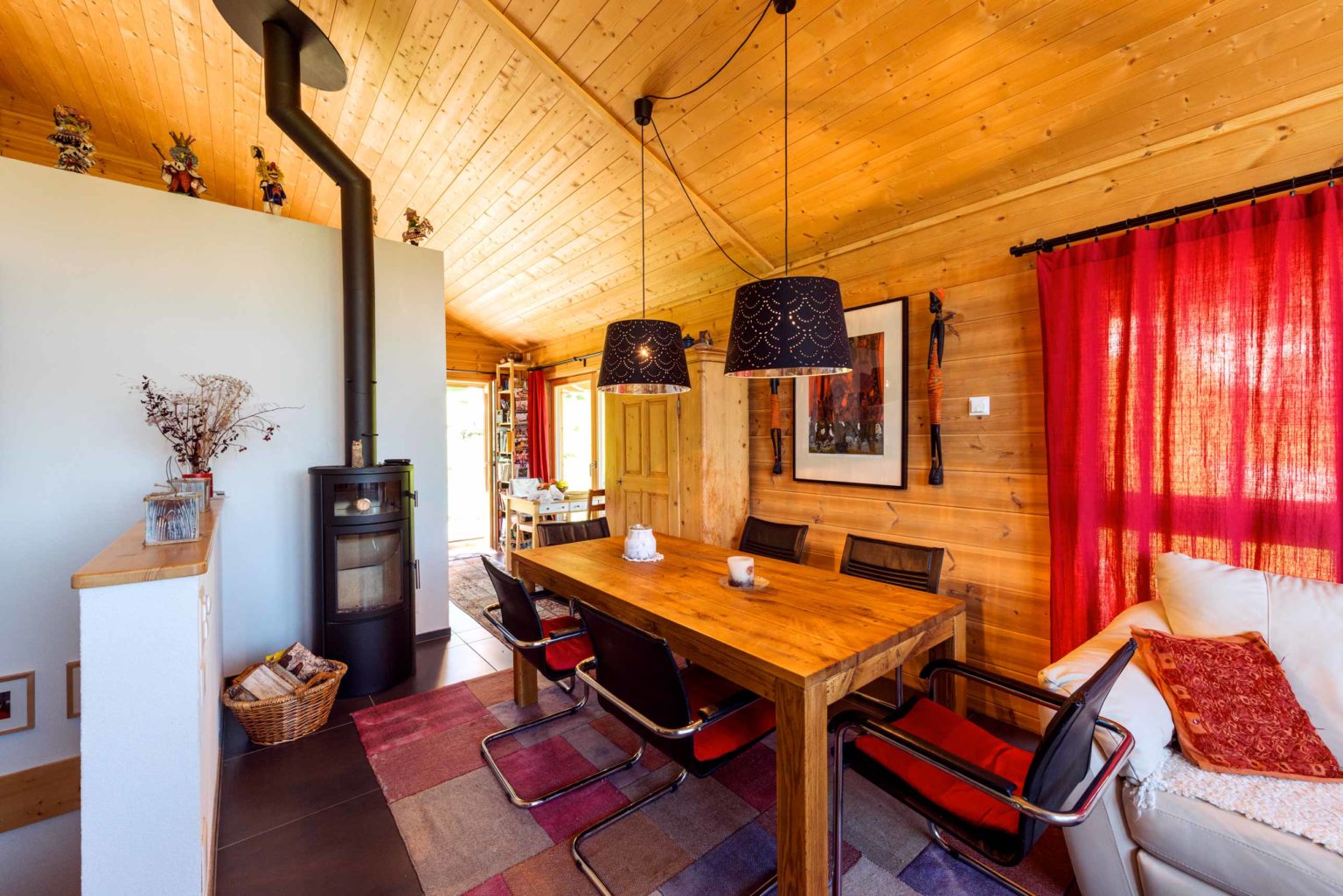 „Hinsichtlich Klimaschutz gibt es heute nichts Besseres als ein modernes Holzhaus, dessen Holz aus nachhaltiger Forstwirtschaft besteht!“, ist Theodor Rüber überzeugt. Um den strengen Energiesparverordnungen in der Schweiz gerecht zu werden, wählte er die 27 cm dicke „Luxuswand“ von Fullwood. Dank der modernen Fertigungstechnik einzelner Wandelemente im Werk, ist sie setzungsfrei und absolut winddicht und lässt sich termingetreu und schnell vor Ort montieren. „Zum Heizen nutzen wir eine Luft-Wärmepumpe für unsere Fußbodenheizung. Den Wohnbereich erwärmen wir aber am liebsten mit unserem Kaminofen. Die Strahlungswärme ist besonders gemütlich und es wird sehr rasch warm.“, sagt Sonja Rüber. Überhaupt liebt das Ehepaar die exklusive Behaglichkeit und das ganz besondere Raumklima in seinem wohngesunden Holzhaus. „Die massiven Holzwände strahlen immer eine gewisse Wärme und Nahbarkeit aus.“, schwärmt die Hausherrin über die hellen, glatten Vollholzwände aus Polarkiefernholz. Die Eigentemperatur von Holz ist höher als beispielsweise von Stein und unterliegt sommers wie winters deutlich kleineren Schwankungen. Deshalb ist Holz eine Art natürliche Klimaanlage, die im Sommer Hitze draußen lässt und im Winter Wärme drinnen. „Neben der guten Dämmeigenschaft unserer einschaligen Blockwände sind eine gute Dachdämmung und moderne Wärmeschutzfenster natürlich ebenfalls ein Muss um niedrige Energiekosten zu erzielen.“, sagt der Hausherr.