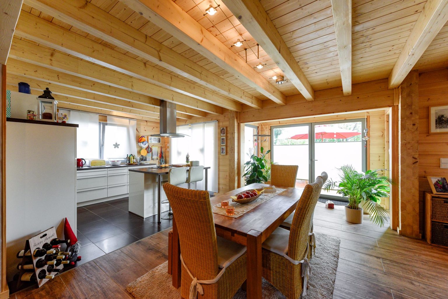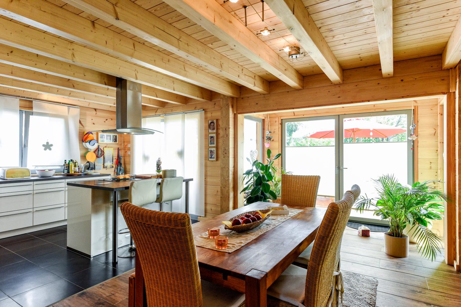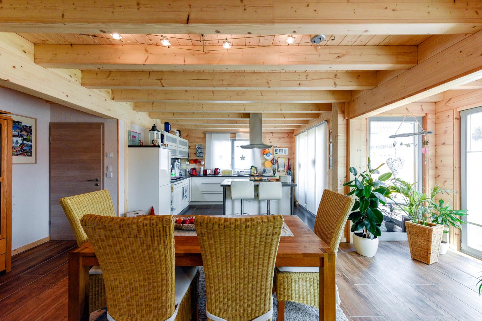 Familie König wohnte vorher in einem Steinhaus und genießt jetzt ganz besonders das angenehme Wohnklima in ihrem Holzhaus. Den zarten Kiefernduft der Wände nehmen sie zwar nur noch nach längerer Abwesenheit wahr, aber das generelle Wohlgefühl im Hausinnern ist ständig präsent. „Wir müssen viel weniger heizen als vorher. Die 20cm dicken Massivholzwände dämmen nicht nur sehr gut, sie bewirken auch eine permanente Behaglichkeit.“, schwärmt Kerstin König. Geheizt wird konventionell mit Gas (Fußbodenheizung) und dem Kaminofen im Wohnbereich. Unterstützend wirkt eine solare Warmwasserbereitung. Reichlich natürliches Licht gelangt durch viele, teils bodentiefe Fenster ins Haus, besonders der Wohnbereich bekommt sehr viel Licht von draußen. Um die naturhellen Kiefernwände vor dem Nachdunkeln zu bewahren, wurden sie und die offenen Balkendecken mit UV-Schutz behandelt. Dazu kombinierten die Königs Trennwände in leichter Ständerbauweise, die sie in hellen Kaffeefarben und sonnigem gelb tapezierte. Dadurch wirken die Räume noch moderner und dank der warmen Abtönung sehr harmonisch. Die Fensterrahmen und Haustüre sind hellgrau – das betont die moderne Optik -, dazu passt das mit dunkelgrauen Tonziegeln gedeckte Satteldach perfekt. Pflegeleichte Fliesen erstrecken sich überall im Haus, lediglich in den Kinderzimmern und im Schlafzimmer wurde fußwarmes Laminat verlegt. Der Wohnbereich und der Flur sind einheitlich in dunkelbrauner Holzdielenoptik gefliest, die Küche mit dunkelgrauen Rechteckfliesen ausgestattet und die Bäder mit sandfarbenen Bodenfliesen verkleidet. Oben sind die Dachschrägen teils weiß verkleidet (Kinderzimmer) oder mit hellem Holz verschalt (Bad). „Für mich ist mit unserem Holzhaus ein lang gehegter Traum in Erfüllung gegangen von dem nun auch meine Familie überzeugt ist!“, strahlt der Hausherr.