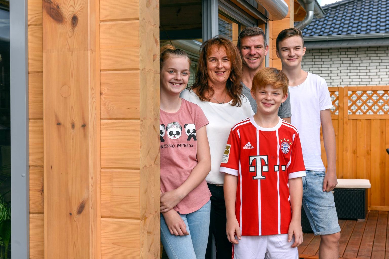 Nachdem Fullwood durch Ausschlussverfahren als passender Baupartner ausgesucht wurde, begann die Hausplanung. „Zusammen mit unserem Fullwood-Berater konnten wir unser ganz individuelles Wunschhaus planen. Eigene Vorstellungen und (Wohn-) Bedürfnisse wurden ganz selbstverständlich berücksichtigt. Es gab keinerlei Zeitdruck, und wir konnten immer wieder Änderungen vornehmen, bis alles perfekt war.“, freut sich die Hausherrin. Dabei flossen auch die Erfahrungen aus der Zeit im alten Haus mit ein. Als Ausbaustufe nahm man das Angebot einer „Richtmeistermontage“ (Bausatz inklusive Richtmeister) gerne an, um eigene Ressourcen voll auszuschöpfen. „Der Richtmeister war 14 Tage vor Ort und hat mit mir zusammen das Holzhaus samt Dachstuhl aufgestellt. Die wenigen Wandelemente wurden vom Kran an Ort und Stelle gehievt.“, beschreibt Ralf König die Bauphase. Im Anschluss erledigte er mit der Unterstützung von Freunden den gesamten Innenausbau selbst, lediglich Elektrik und Heizung überließ er ortsnahen Fachfirmen. „Nach nur drei Monaten ab Hauslieferung konnten wir schon einziehen!“, sagt er stolz. Selbstverständlich hat Familie König auch die Außenanlage selbst angelegt. „Durch unsere Eigenleistung konnten wir viel Geld sparen.“, freut sich der Hausherr.
