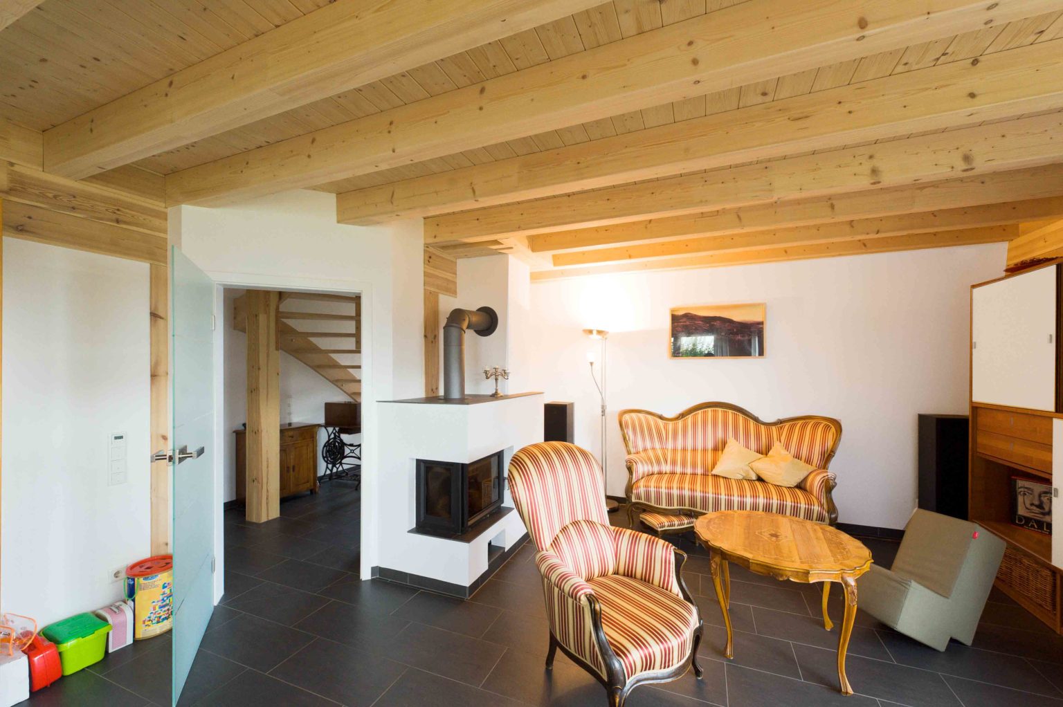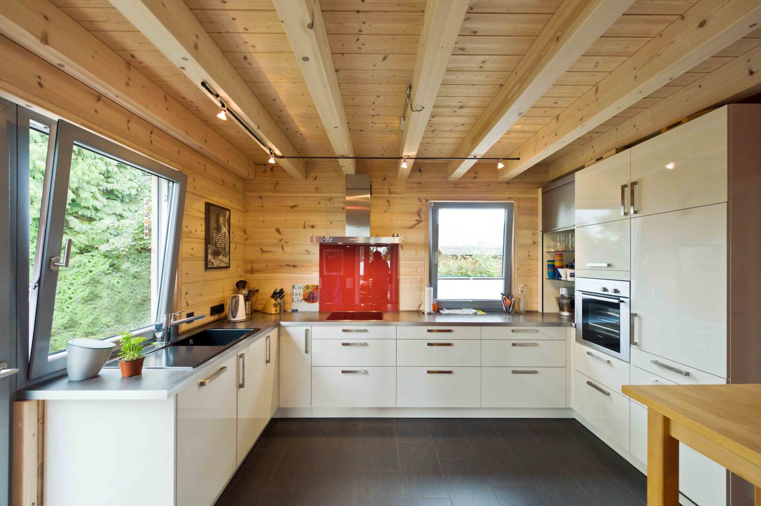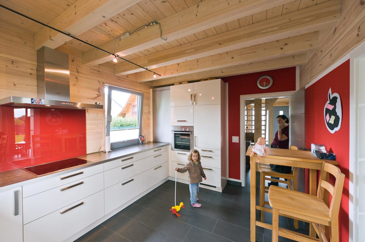 An jedes kleine Detail im Wohnalltag dachten die Hauseigentümer in der intensiven Planungsphase und profitierten von der Professionalität der Baufirma. Um die lokalen Bauvorschriften zu erfüllen und trotzdem mehr Platz im Dachgeschoss zu haben, „verkürzte“ man das vorgeschriebene Satteldach auf der Gartenseite und baute dort einen extrem hohen Kniestock, so dass die zum Garten ausgerichteten Räume echte Vollgeschosse sind. Auf Platz raubende Offenheit bis zum First verzichtete man zugunsten eines begehbaren, aufgeteilten Spitzbodens, der zu einem Drittel Stauraum bietet und dessen restliche Teile jeweils von den beiden Kinderzimmern erreichbar und als Schlafplatz nutzbar sind. Eine in Holzhaus „Schartnberg“ integrierte Sauganlage erleichtert die Hausreinigung, und die im Erdgeschoss verlegten Bodenfliesen in Schieferoptik sind pflegeleicht. Fußwarme Korkböden schmeicheln nackten (Kinder-) Sohlen im Obergeschoss. Zum Thema „offenes Wohnen“ einigte sich das Eigentümerpaar mit einem klaren „Jein“, und entschied sich für einen fließenden Übergang zwischen Wohnzimmer und Esszimmer, während die angeschlossene Küche mit einer circa 1,20 m breiten Schiebetüre aus Milchglas verschließbar ist. Gerüche, Geräusche und unaufgeräumtes Kochgeschirr verschwinden auf diese Weise sofort, ohne dass die Kommunikation während des Kochens und der kurze Transportweg zwischen Küche und Esstisch leiden.