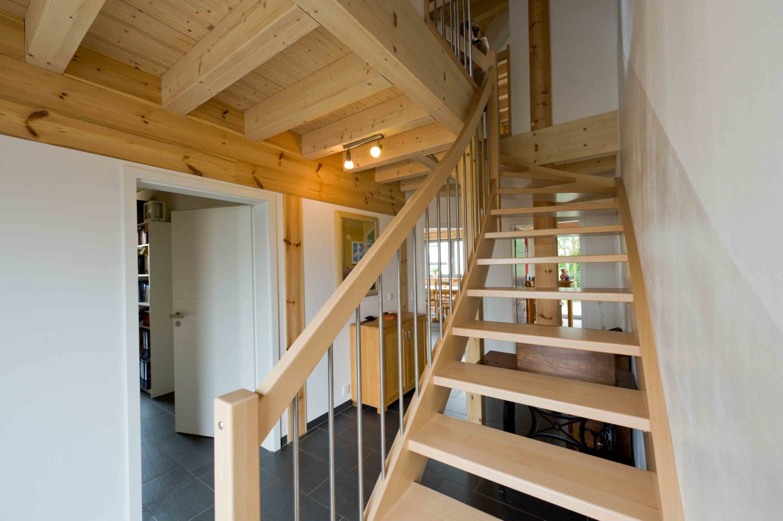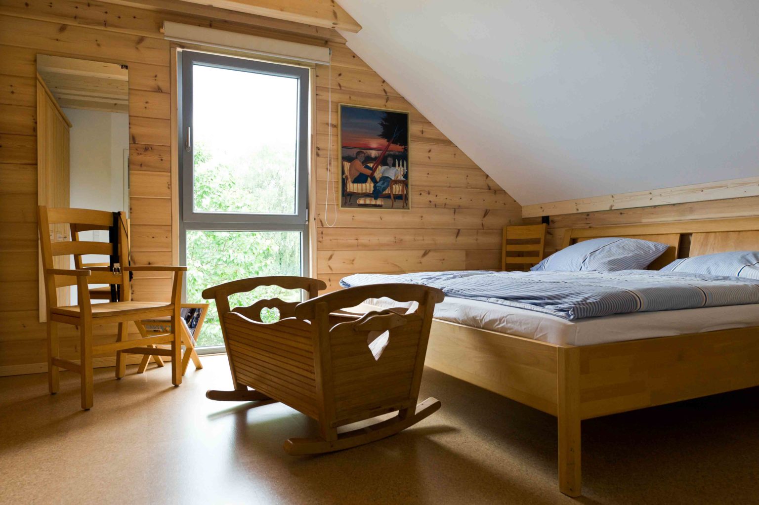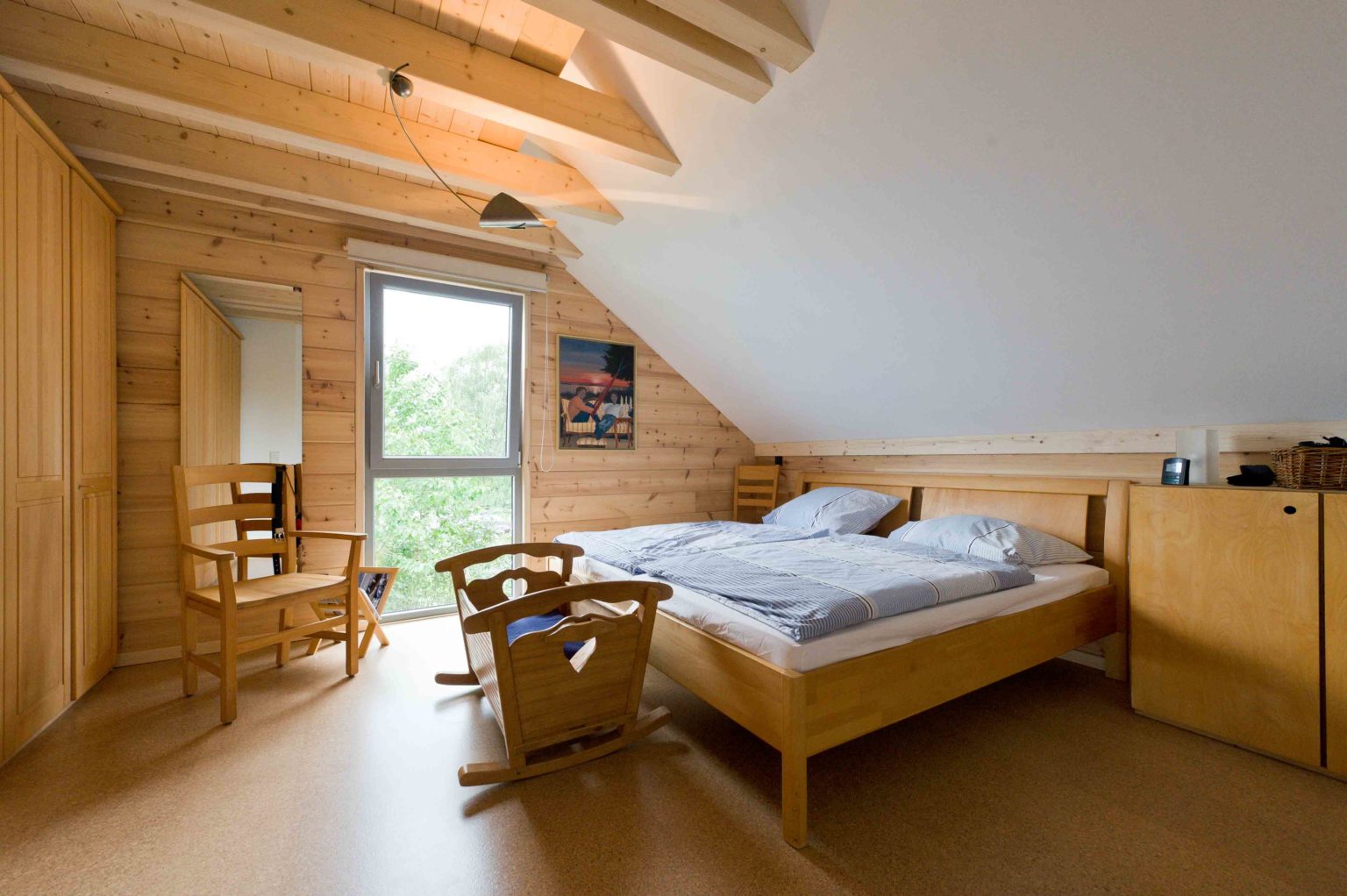 An jedes kleine Detail im Wohnalltag dachten die Hauseigentümer in der intensiven Planungsphase und profitierten von der Professionalität der Baufirma. Um die lokalen Bauvorschriften zu erfüllen und trotzdem mehr Platz im Dachgeschoss zu haben, „verkürzte“ man das vorgeschriebene Satteldach auf der Gartenseite und baute dort einen extrem hohen Kniestock, so dass die zum Garten ausgerichteten Räume echte Vollgeschosse sind. Auf Platz raubende Offenheit bis zum First verzichtete man zugunsten eines begehbaren, aufgeteilten Spitzbodens, der zu einem Drittel Stauraum bietet und dessen restliche Teile jeweils von den beiden Kinderzimmern erreichbar und als Schlafplatz nutzbar sind. Eine in Holzhaus „Schartnberg“ integrierte Sauganlage erleichtert die Hausreinigung, und die im Erdgeschoss verlegten Bodenfliesen in Schieferoptik sind pflegeleicht. Fußwarme Korkböden schmeicheln nackten (Kinder-) Sohlen im Obergeschoss. Zum Thema „offenes Wohnen“ einigte sich das Eigentümerpaar mit einem klaren „Jein“, und entschied sich für einen fließenden Übergang zwischen Wohnzimmer und Esszimmer, während die angeschlossene Küche mit einer circa 1,20 m breiten Schiebetüre aus Milchglas verschließbar ist. Gerüche, Geräusche und unaufgeräumtes Kochgeschirr verschwinden auf diese Weise sofort, ohne dass die Kommunikation während des Kochens und der kurze Transportweg zwischen Küche und Esstisch leiden.