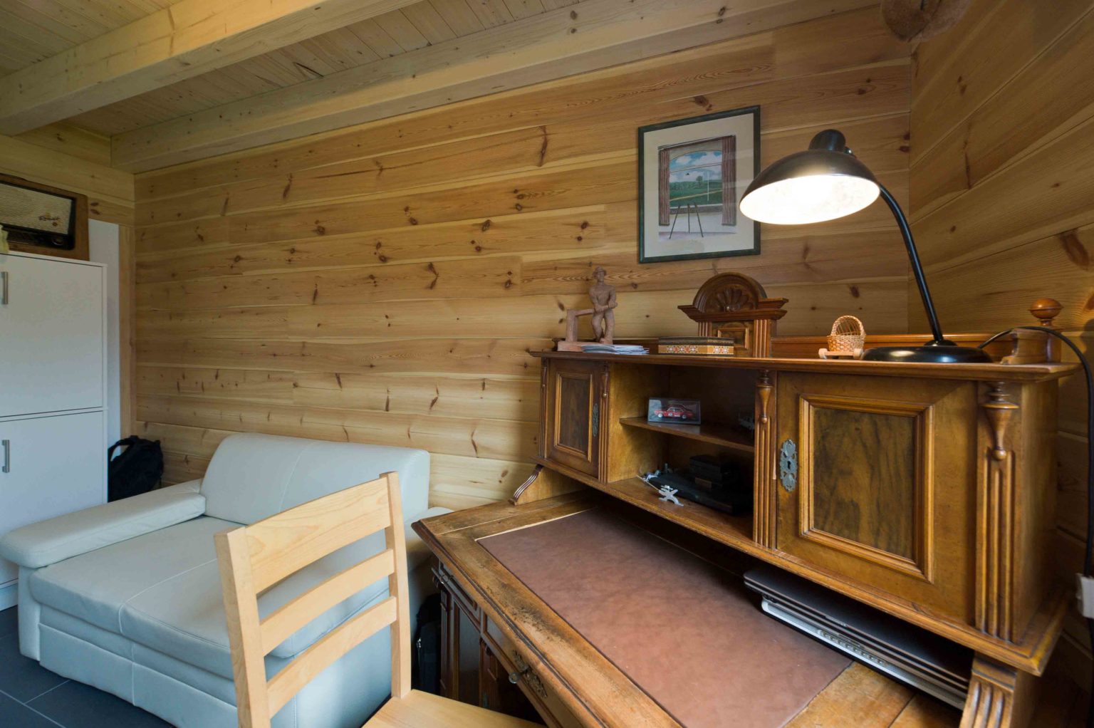 Zwar steht der Familie zum Heizen ein herkömmlicher Gasanschluss zur Verfügung, jedoch heizen sie viel mit dem wasserführenden Kaminofen, dessen Strahlungswärme besonders wohlig und heimelig ist, während sein Wassertauscher Brauchwasser und Wasser für die Fußbodenheizung erwärmt. Eine solare Anlage auf dem Hausdach übernimmt die Erwärmung von Brauchwasser und Fußbodenheizung, wenn kein Feuer im Kaminofen brennt, und eine große Regenwasserzisterne liefert das Wasser für die Toiletten und den Garten. Dieser Garten ist ideal für die Familie, und mit seiner großen ebenen Fläche wunderbar zum Spielen geeignet. Mit ihrem Holzhaus und dem Grundstück haben die Hauseigentümer einen sehr guten, für sie idealen Griff gemacht.