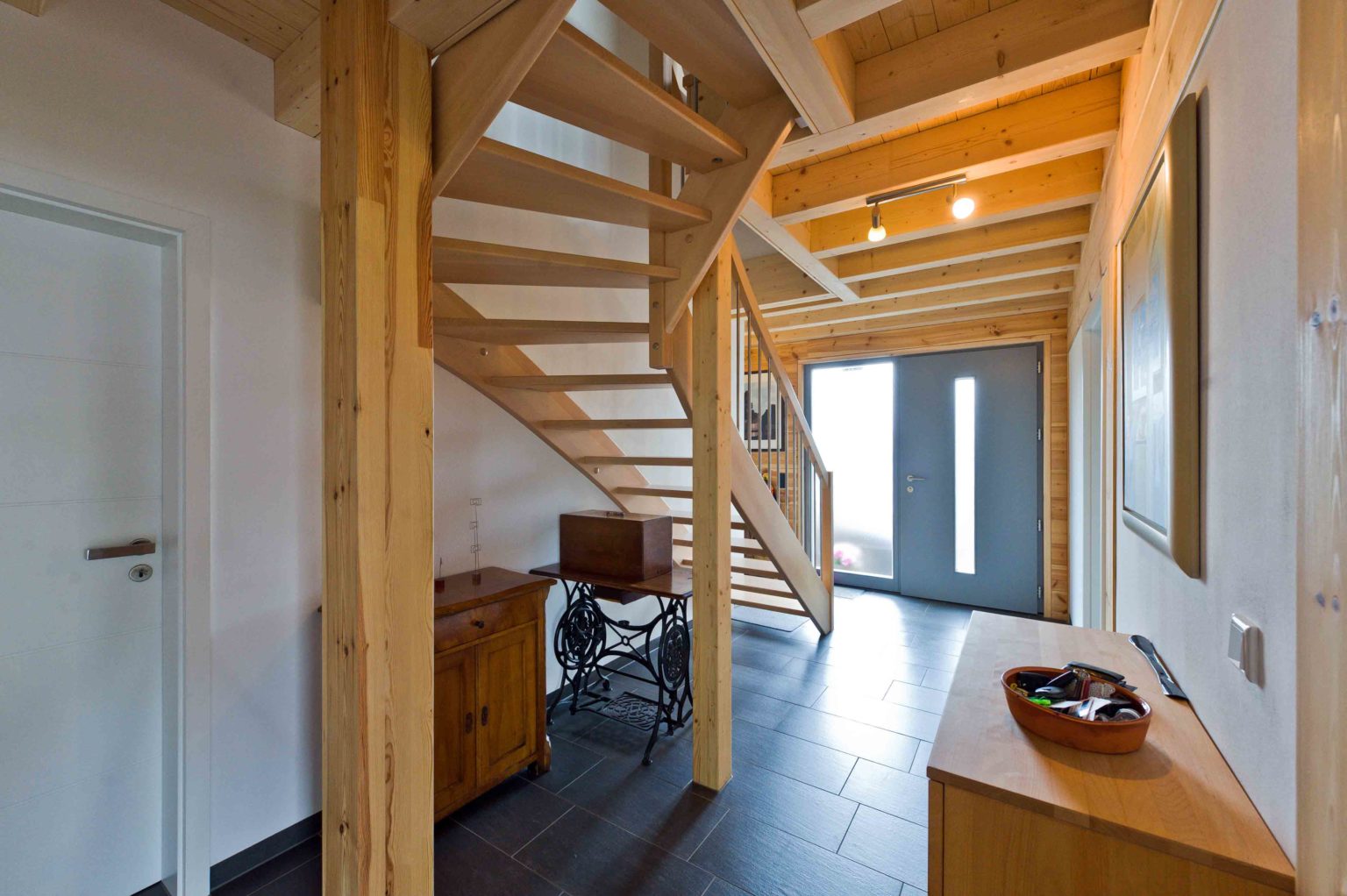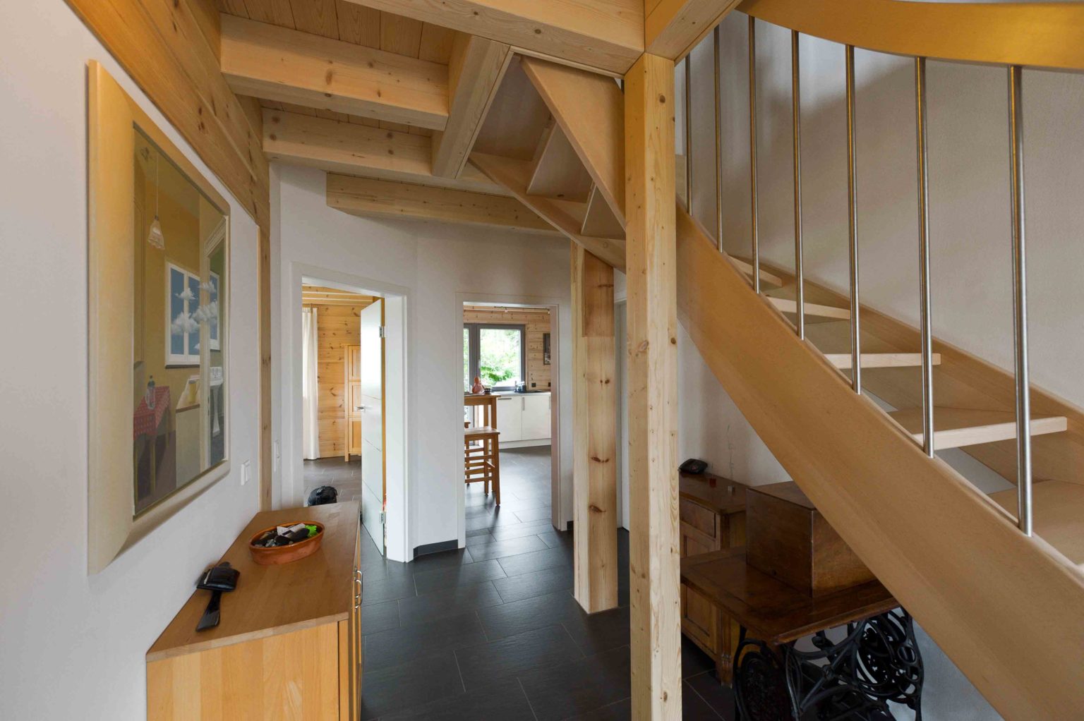 Holzhaus „Schartenberg“ besitzt innen wie außen ein modernes, helles und schnörkelloses Erscheinungsbild. Seine 20 cm starken Vollholzwände aus massivem Polarkiefernholz erhielten einen Außenanstrich mit ganz heller Fichtenlasur und wurden innen mit UV-Schutz gegen Nachdunkeln behandelt. Die Fenster sind in dezentem hellgrau gehalten und das Hausdach mit Tonziegeln in anthrazit gedeckt. Um zusätzliche Helligkeit und Modernität ins Holzhaus zu bringen, kombinierten die Hausherren innen verputzte Trennwände in Ständerbauweise zu den Holzwänden. Das reine weiß dieser Wände vergrößert die Räume optisch und bringt ein Stück Sachlichkeit in das ansonsten vom sinnlichen Naturholz profitierende Gebäude. In der Küche sorgen zwei rot gestrichene Wände für kontrastreiche Abwechslung und farbliche Wärme im Erdgeschoss. Einige verspielte Antiquitäten mit geschwungenen Formen und warmen Farben ergänzen die klare Formensprache und die neutralen „Farben“ von Haus und Einrichtung gekonnt. Konsequent wurden glatte Türen aus Glas oder weißem Holz gewählt und die im Flur befindliche Geschosstreppe aus Buchenholz erhielt ein Geländer aus Edelstahlrohren mit hölzernem Handlauf. Ein Abstellraum, ein Gäste-Dusch-WC und ein Arbeitszimmer mit Schlafmöglichkeit für Gäste schließen das Raumprogramm im Erdgeschoss ab. Im Obergeschoss kann sich die Familie in zwei geräumige Kinderzimmer und ein Schlafzimmer zurückziehen oder das Familienbad benutzen.