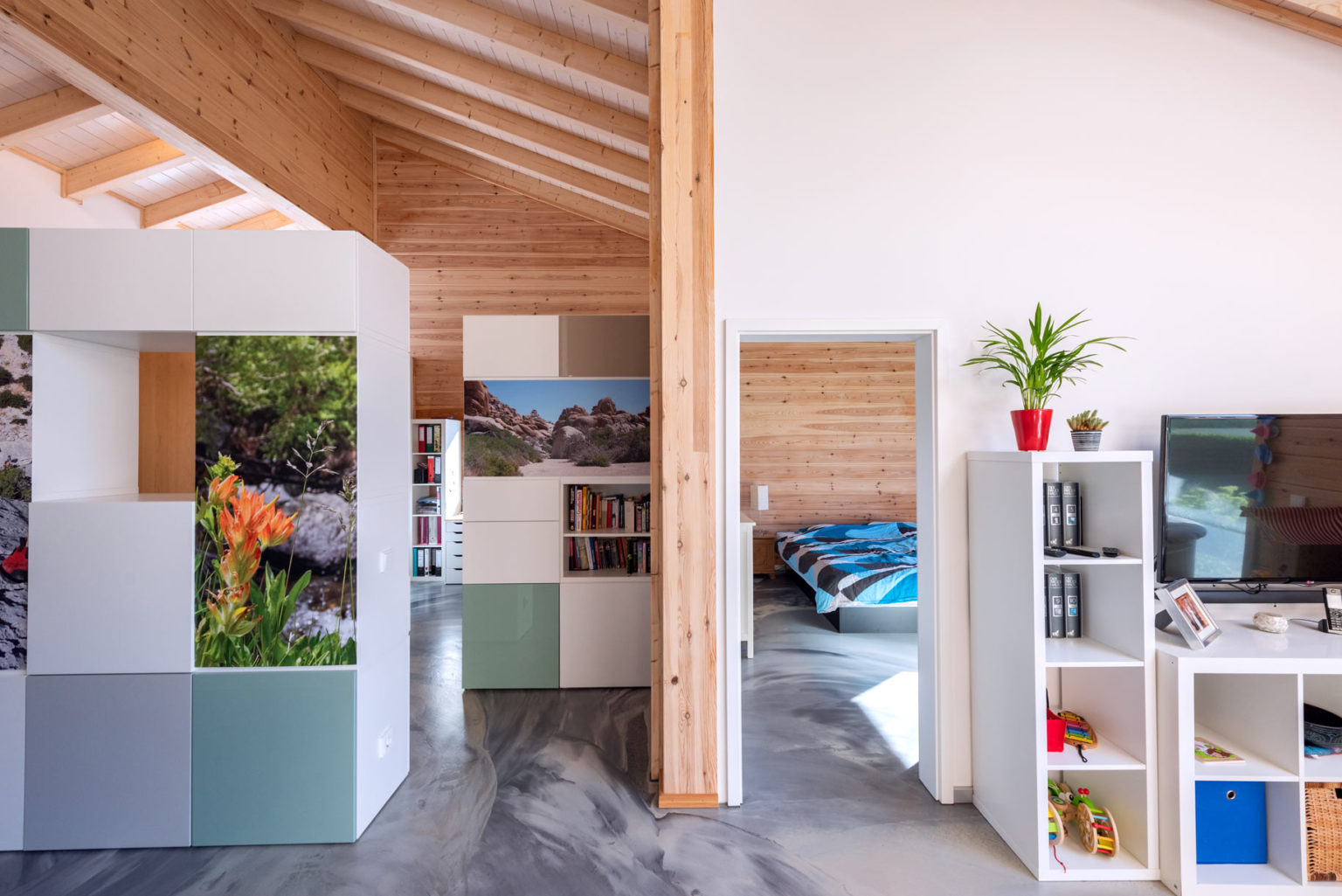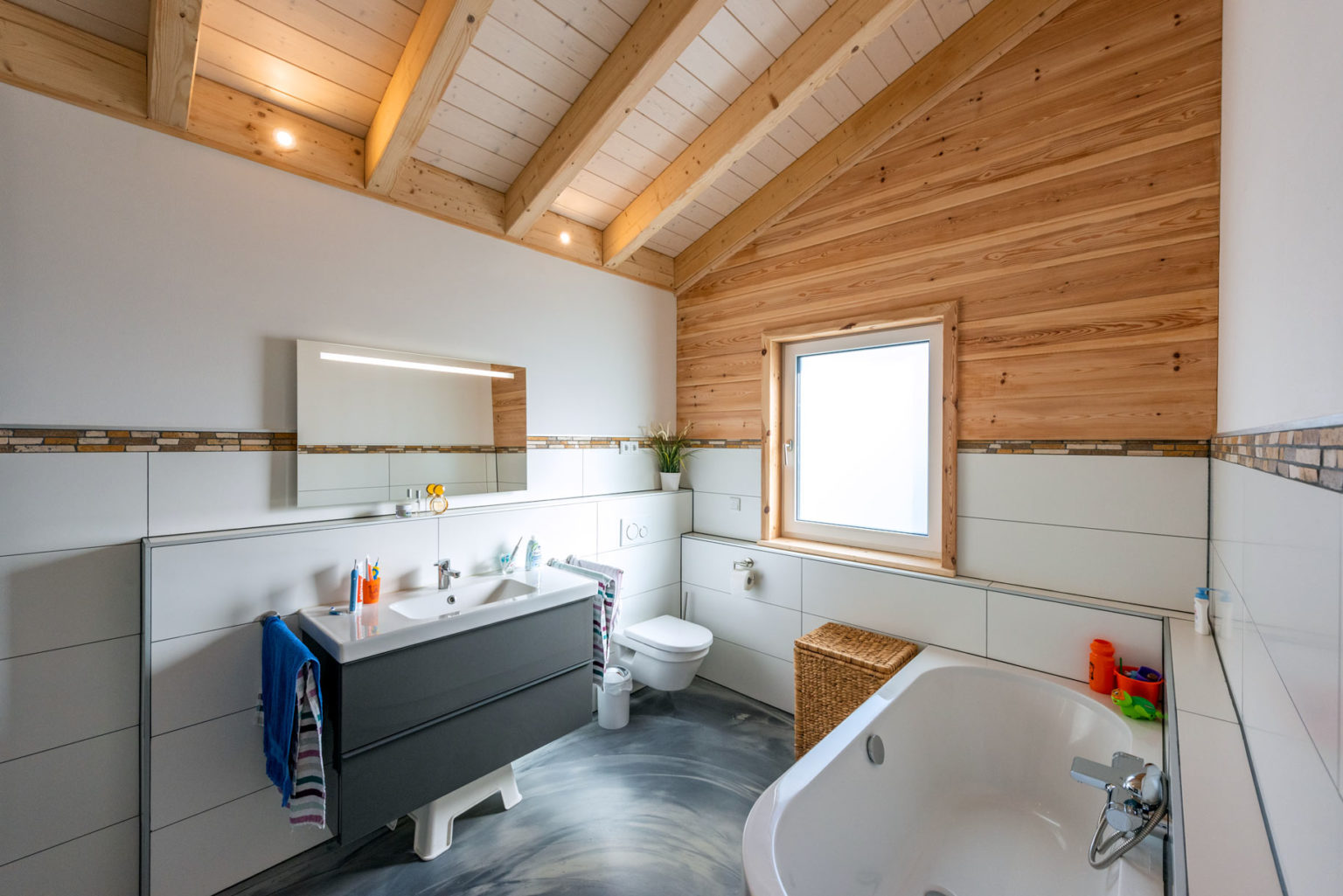 Bloß nicht 08/15 bauen und unbedingt schadstofffreie Naturmaterialien verwenden, war das Credo des Eigentümerpaares, als es mit den Überlegungen zum Hausbau begann. Auch Gemütlichkeit stand im Fokus, ohne jedoch altbacken oder sehr rustikal zu wirken. Schnell kam massives Holz ins Gespräch, wurden dessen viele Bau- und Wohnvorteile recherchiert und der passende Holzhaus Spezialist gefunden. Neben Qualität und Optik gefiel dem Baupaar besonders, dass es bei Fullwood Wohnblockhaus individuell beraten wurde und man auch Holzhäuser mit viel Eigenleistung anbot. Ein moderner Hausentwurf mit schiefergrauem Staffeldach, einen Tick aufgehellten Polarkiefernwänden und hellgrauen Fenstern wurde in enger Zusammenarbeit exakt nach den Vorstellungen der Hauseigentümer entwickelt. Als Baustufe entschieden sich diese für eine Richtmeistermontage, eine externe Dachdeckerfirma wurde engagiert und ansonsten der gesamte Innenausbau in Eigenleistung durchgeführt. Wie vereinbart, wurden die passgenau zugeschnittenen Wandelemente und Bauteile pünktlich zu Baubeginn angeliefert, per Kran auf den Bauplatz gehievt und unter der Anleitung und Vorarbeit des Fullwood-Richtmeisters vom Baupaar selbst montiert. Nach einer Woche standen alle Außenwände, der Dachstuhl war fertig und das Dach für's Eindecken vorbereitet. Dann kam die Dachdeckerfirma um ihren Teil zu erledigen und danach ging’s für die heutigen Holzhaus Besitzer erst richtig los: Die spannende und langwierige Ausbauphase begann. Als erfahrener Hobbyhandwerker kam der Hausherr sehr gut zurecht, sogar an die Elektrik traute er sich erfolgreich heran und seine Frau machte sich als Handwerkslehrling hervorragend. Während sie bei Baubeginn noch schwanger war, begleitete beim Einzug in Holzhaus „Schlangenberg“ das einmonatige Töchterlein seine Eltern schon. Während der Bau- und Ausbauphase traf das Paar spontane Entscheidungen, ließ beispielsweise eine Innenwand komplett weg oder vom Richtmeister die Öffnung für ein ungeplantes Dreiecksfenster über der Haustüre ausschneiden. Diese Flexibilität gefiel dem ideenreichen Paar sehr gut. Auch andere Ideen entstanden beim Tun.