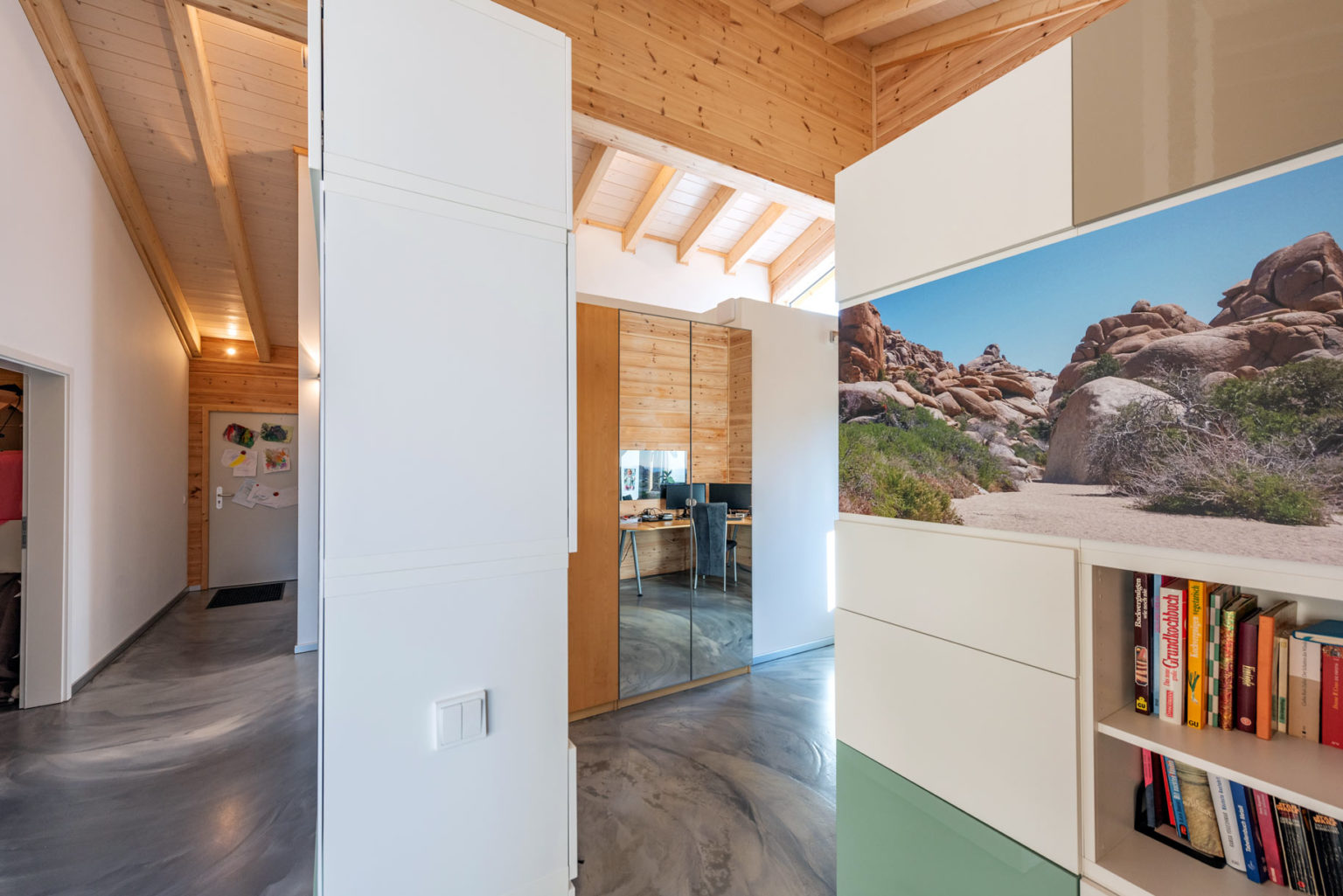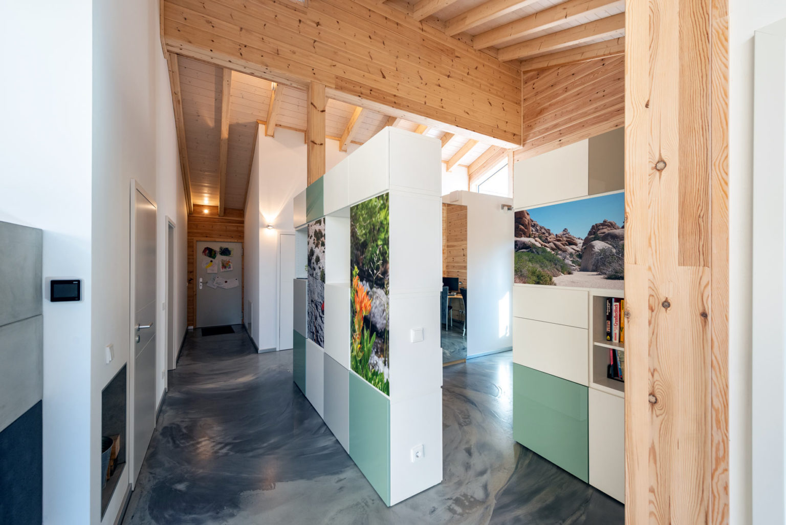 Barrierefreiheit für's Alter und offenes Wohnen sowie ein direkter Zugang vom Holzhaus zur Garage lauteten die Vorgaben des Baupaares an Fullwood. Dazu kam eine ungewöhnliche Grundstücksfläche, die optimal ausgenutzt werden sollte. Eigentlich wollte das Paar kein versetztes Pultdach, ließ sich aber überzeugen und ist heute sehr froh darüber. Der Grundriss ähnelt einem Quadrat, dessen Ost-Ecke abgeschrägt wurde und dessen Nord-Ecke winkelförmig entfernt wurde, sodass dort, dank Dachabschleppung, ein überdachter Freisitz entstand. Zwei unterschiedliche Dachhöhen betonen die moderne Dachlandschaft. Der Hauseingang befindet sich an der südlichen Giebelseite und führt in eine L-förmige Diele, die zum Wohnbereich hin offen ist. Dieser Bereich ist ebenfalls offengehalten und beinhaltet Wohnzimmer, Esszimmer und Küche. Beeindruckend ist hier nicht nur die weitläufige Fläche, sondern auch die enorme Lichte von 5,70m bis zur Pfette des höheren Dachfirstes der beiden Dächer. Aufgrund der abgeschrägten Wand ist die Küche verwinkelt, wodurch sie sich optisch etwas vom Wohnbereich separiert. Des Weiteren gelangt man von der Diele des eingeschossigen Holzhauses „Schlangenberg“ in ein Badezimmer, ein Gäste-WC, einen kleinen Flur (Schleuse zur Garage, wo auch ein Technikraum mit Waschmaschine integriert ist), ein Kinderzimmer, einen Abstellraum, ein offenes Arbeitszimmer und ein Schlafzimmer. Alle Räume sind großzügig und besitzen üppige Raumhöhen.