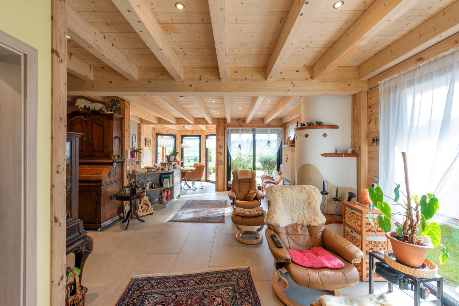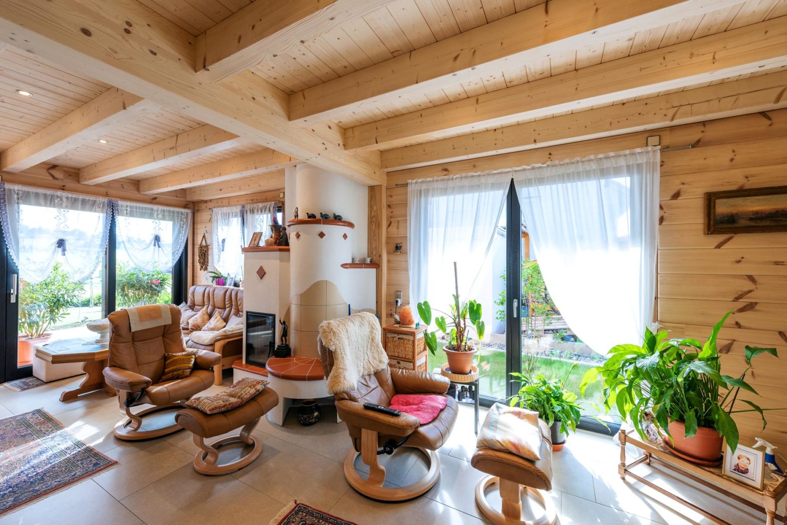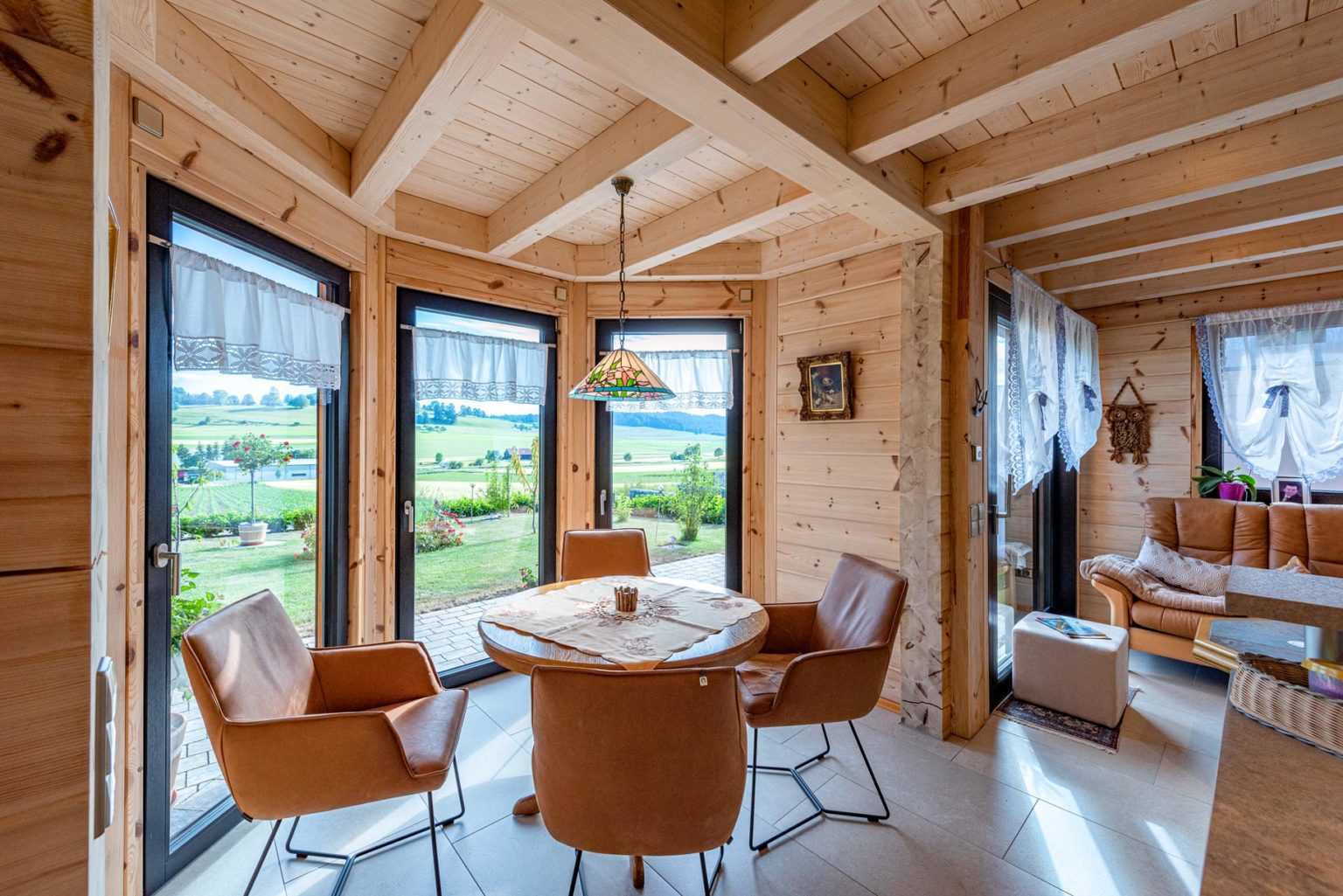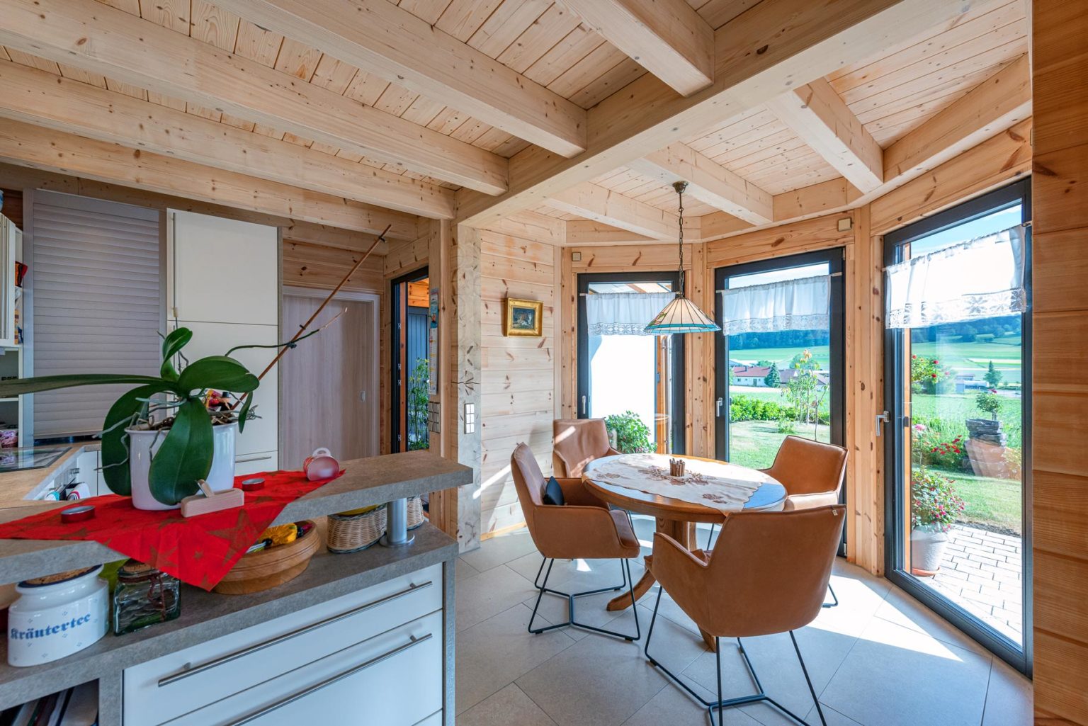 Nicht nur weil es ihnen gefällt, haben die Eigentümer von Holzhaus „Schwäbische Alb“ mit Massivholz gebaut, auch der eigens befragte Baubiologe riet aus gesundheitlichen Gründen dazu. Schadstofffrei, für Allergiker geeignet und generell wohltuend für Körper und Geist sind die einschaligen Polarkiefernwände von Fullwood bedenkenlos zu empfehlen. Auch für ökologisches und sogar CO2-neutrales Bauen! Zumal das massive Holzhaus via Fußbodenheizung mit Holzpellets (nachwachsender Rohstoff!) beheizt wird. Auch einen dekorativen Kachelofen hat sich das Eigentümerpaar einbauen lassen. Tatsächlich wird aber insgesamt wenig und sparsam geheizt, da die 20cm dicken Blockwände hervorragend dämmen – besser, als es der errechnete U-Wert vermuten ließe! Und im Winter kann die tief stehende Sonne an der fast komplett verglasten Südseite (Terrasse und Garten) ungehindert ins Haus eindringen um erwünschte Wärme zu spenden. Im Sommer hingegen sorgen Rollläden vor zu viel Sonneneinstrahlung, damit sich Holzhaus „Schwäbische Alb“ nicht aufheizt. Eine gute Aufdachdämmung und Wärmeschutzfenster tragen zur optimalen Isolierung der Haushülle bei. Die vielen, teils bodentiefen Fenster bewirken eine helle lichtdurchflutete Innenarchitektur.
