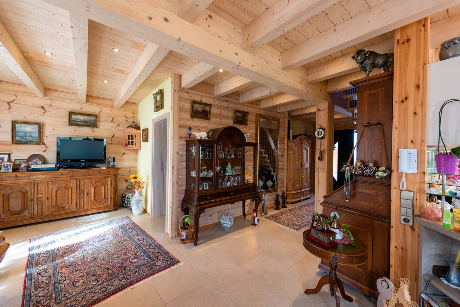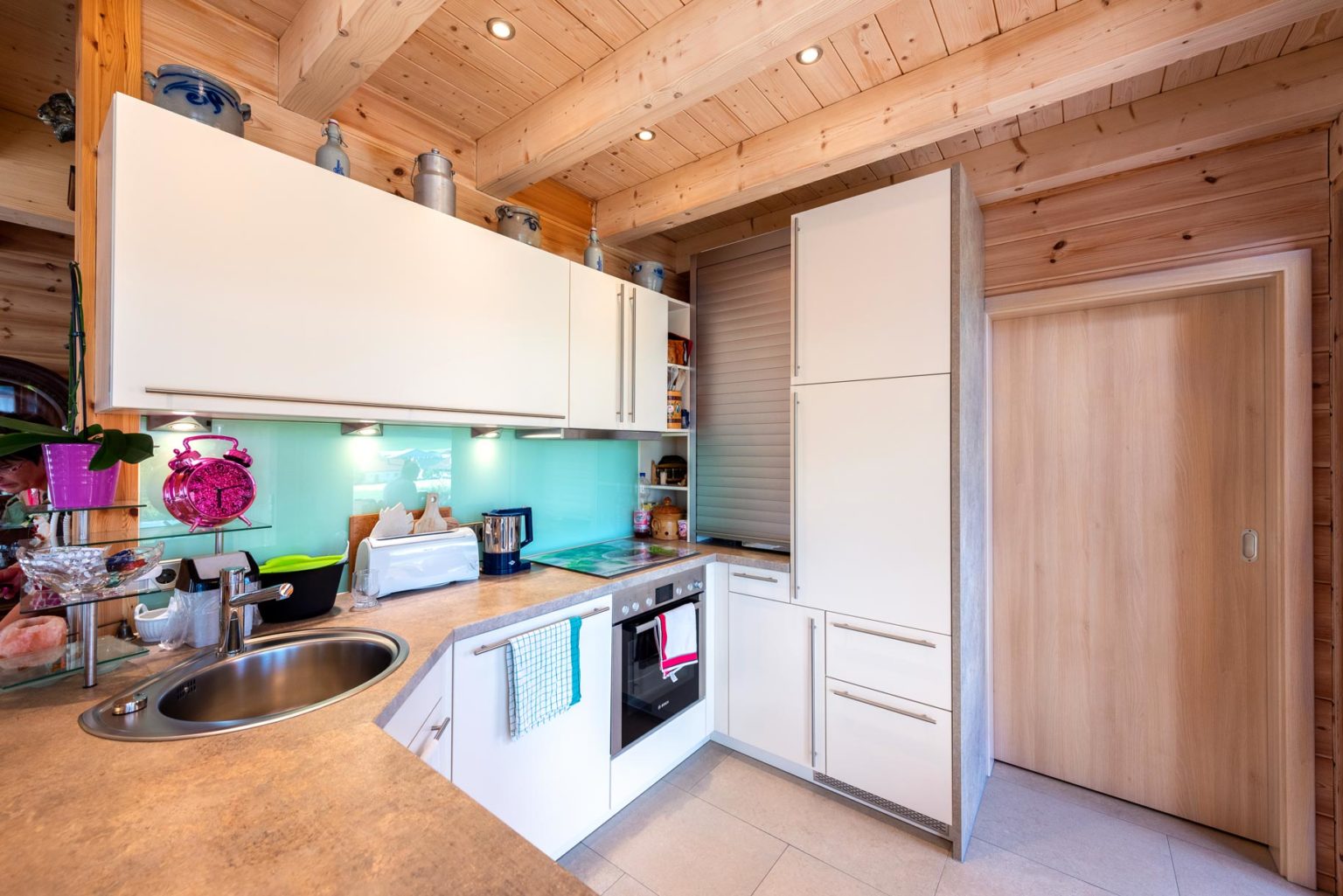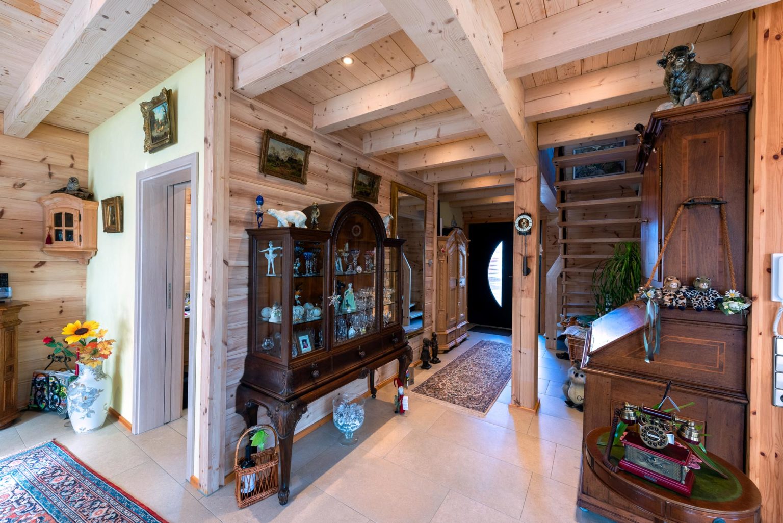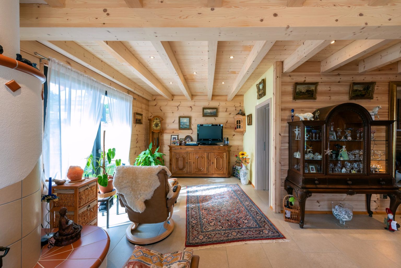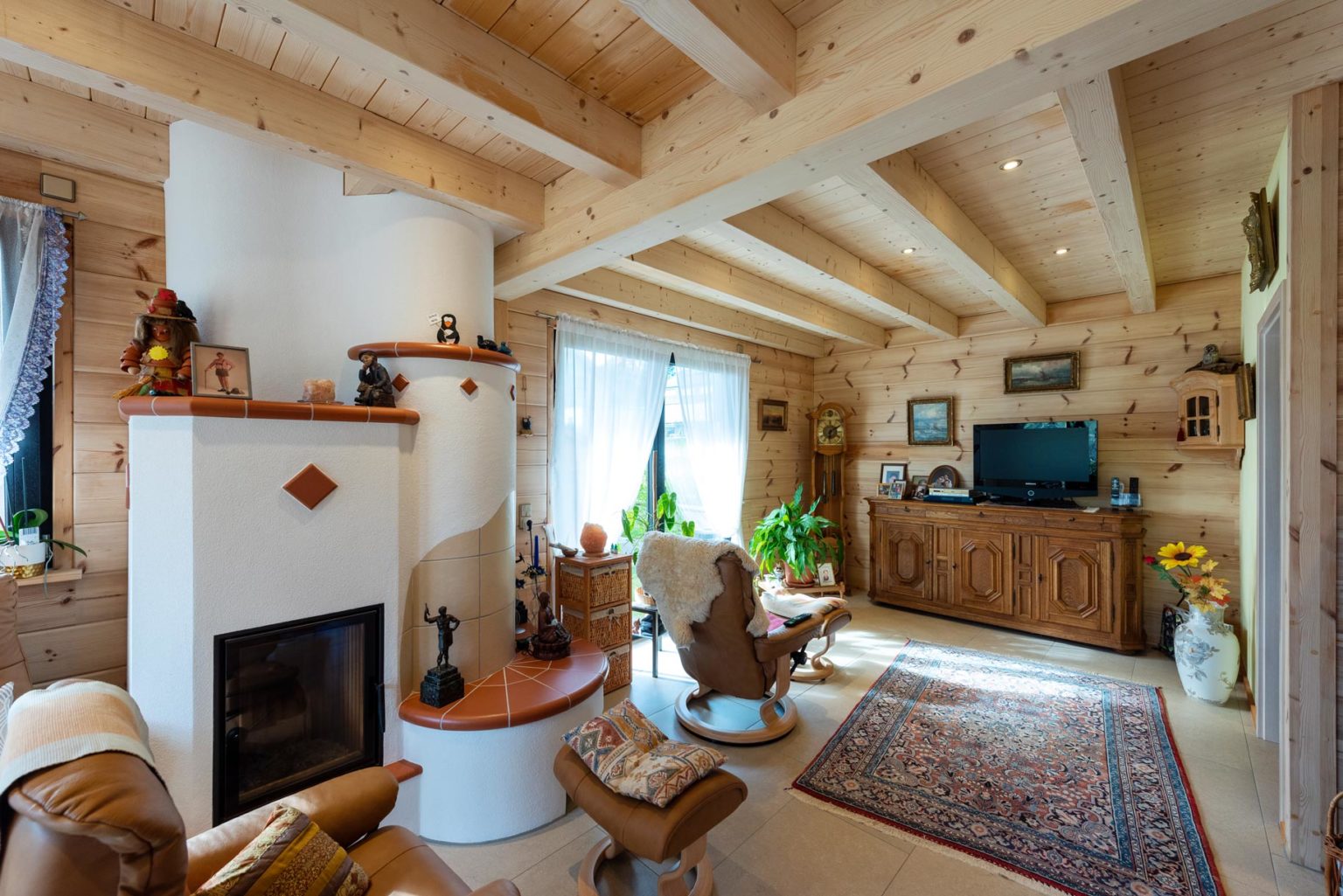 Nicht nur weil es ihnen gefällt, haben die Eigentümer von Holzhaus „Schwäbische Alb“ mit Massivholz gebaut, auch der eigens befragte Baubiologe riet aus gesundheitlichen Gründen dazu. Schadstofffrei, für Allergiker geeignet und generell wohltuend für Körper und Geist sind die einschaligen Polarkiefernwände von Fullwood bedenkenlos zu empfehlen. Auch für ökologisches und sogar CO2-neutrales Bauen! Zumal das massive Holzhaus via Fußbodenheizung mit Holzpellets (nachwachsender Rohstoff!) beheizt wird. Auch einen dekorativen Kachelofen hat sich das Eigentümerpaar einbauen lassen. Tatsächlich wird aber insgesamt wenig und sparsam geheizt, da die 20cm dicken Blockwände hervorragend dämmen – besser, als es der errechnete U-Wert vermuten ließe! Und im Winter kann die tief stehende Sonne an der fast komplett verglasten Südseite (Terrasse und Garten) ungehindert ins Haus eindringen um erwünschte Wärme zu spenden. Im Sommer hingegen sorgen Rollläden vor zu viel Sonneneinstrahlung, damit sich Holzhaus „Schwäbische Alb“ nicht aufheizt. Eine gute Aufdachdämmung und Wärmeschutzfenster tragen zur optimalen Isolierung der Haushülle bei. Die vielen, teils bodentiefen Fenster bewirken eine helle lichtdurchflutete Innenarchitektur.