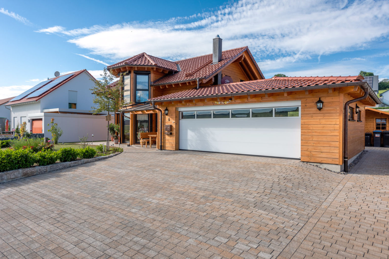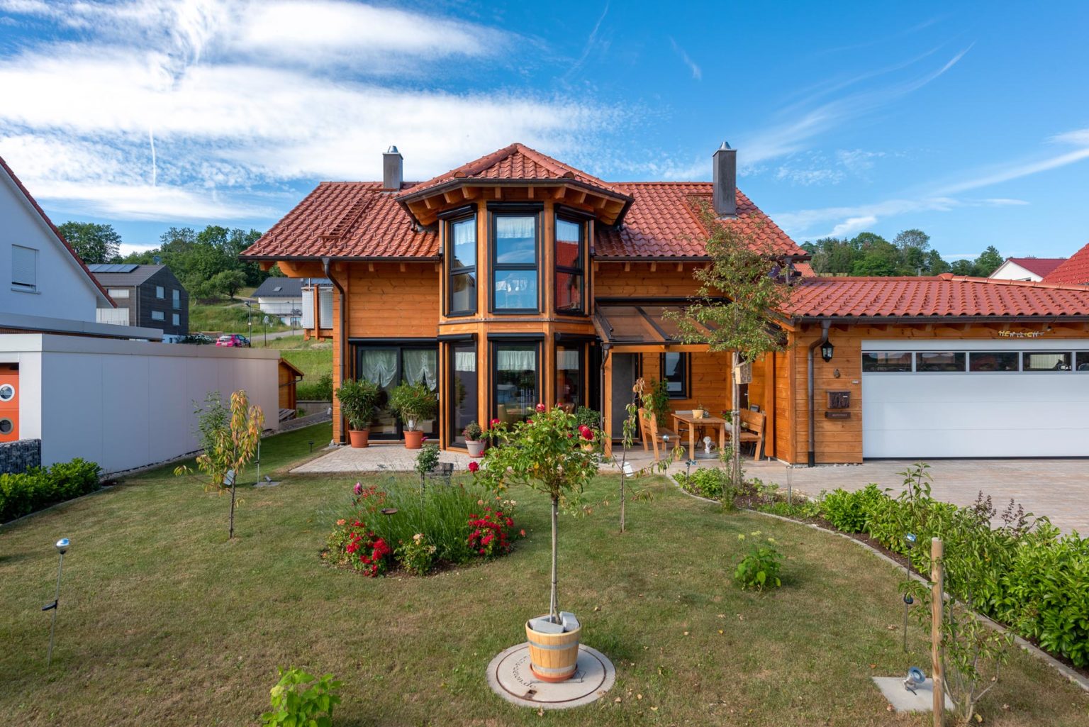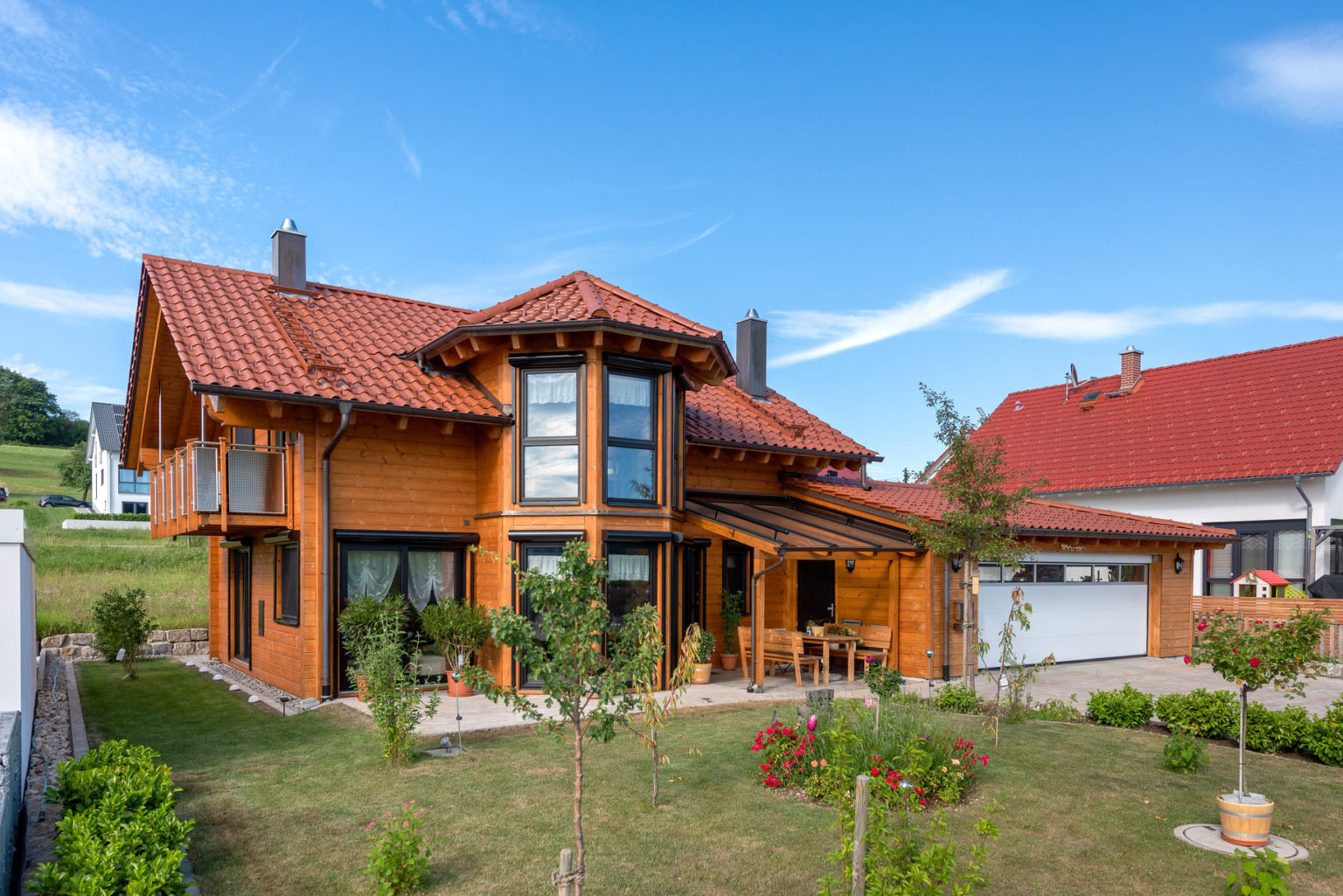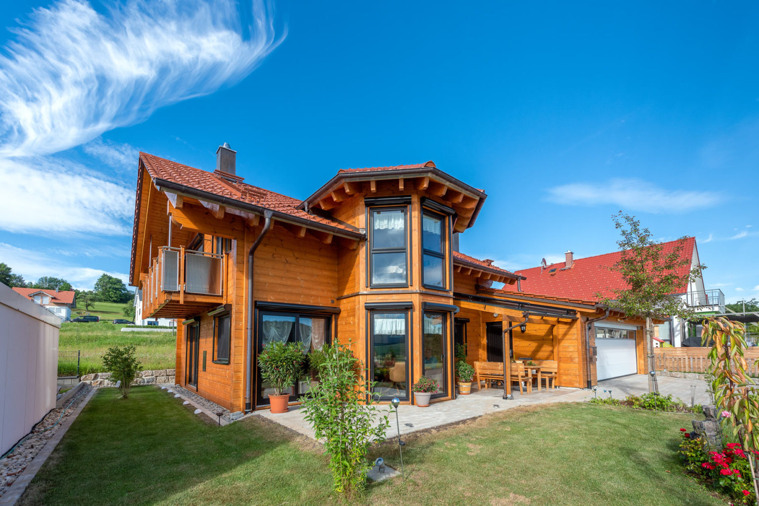 Mit seinen glatten, in einer warmen holzfarbigen Anti-Vergrauungslasur gestrichenen Blockwänden, dem roten Ziegeldach und dem verspielten Turmerker wirkt Holzhaus „Schwäbische Alb“ äußerlich wie ein typisches, rustikal angehauchtes Landhaus. Wären da nicht die schwarzen Fensterrahmen – erwarten würde man dunkelgrün! – und die schlichte, angebaute Doppelgarage mit dem großen, modernen, weißen Garagentor. Drinnen wird man dann von sehr hellen, mit UV-Schutz behandelten Blockwänden und Balkendecken empfangen, die gemeinsam mit sandfarbenen Fliesenböden und vereinzelten, in hellen Farben gestrichenen Trennwänden (leichter Ständerbau) überrascht. Das reichlich einfallende natürliche Licht betont die helle, robuste Geradlinigkeit, welche aber von rustikal-verspielten Möbeln gebrochen wird. Mit 9 x 8 Metern ist der Hausgrundriss fast quadratisch und wird nur an der Süd-West-Seite vom Erkervorsprung aufgelockert. Nach vorne Richtung Süden versetzt ist dem Wohnhaus eine 8,5 x 7 Meter messende, eingeschossige Doppelgarage angebaut, welche die zwischen Garage und Erkertürmchen befindliche Terrasse vor Wind, Sonne und Blicken schützt. Ein gläsernes Verandadach hält Regen, aber nicht Licht ab, es sei denn, die Sonne wird zu stark – dann kann die ins Dach integrierte Markise geöffnet werden. Auch das Türmchen dient dem Freisitz als Windschutz. Das Erdgeschoss wird entweder von der Garage aus oder durch die sich hinter der Garage befindliche Haustüre betreten. Von der Garage aus gelangt man direkt in einen Hauswirtschaftsraum und zu der sich daran anschließende Küche, die zum Wohn-Ess-Bereich hin offen ist. Tritt man durch die Haustüre ein, kommt man in eine Diele mit Treppenaufgang (links) zum Dachgeschoss, Zugang zur Gäste-Dusche/WC (rechts) und Durchgang ins Wohnzimmer (geradeaus). Von hier geht es noch in ein kleines Arbeitszimmer. Das Dachgeschoss beherbergt, von einer Wohndiele aus zugänglich, zwei Schlafzimmer, ein großzügiges Wannenbad und einen Abstellraum. Im Erker befindet sich oben das Wohnzimmer und unten der Essbereich. Holzhaus „Schwäbische Alb“ wurde als Vollmontage von Fullwood aufgebaut und danach von örtlichen Fachhandwerksbetrieben ausgebaut. Der Hausherr fungierte die ganze Zeit über als Bauleiter und war morgens der Erste und abends der Letzte auf der Baustelle. Dabei sorgte er auch für das leibliche Wohl aller. Besonders schön empfand er den guten, persönlichen Kontakt zu seinem Fullwood-Berater sowie dem ganzen Fullwood-Team und, dass er und seine Frau schon beim ersten Besuch des Fullwood-Musterhauses durch die Produktion geführt wurde. Die Entscheidung für Fullwood war auch im Nachhinein richtig und das sprichwörtliche Genusswohnen in seinem massiven Holzhaus beglückt das Eigentümerpaar tagtäglich.