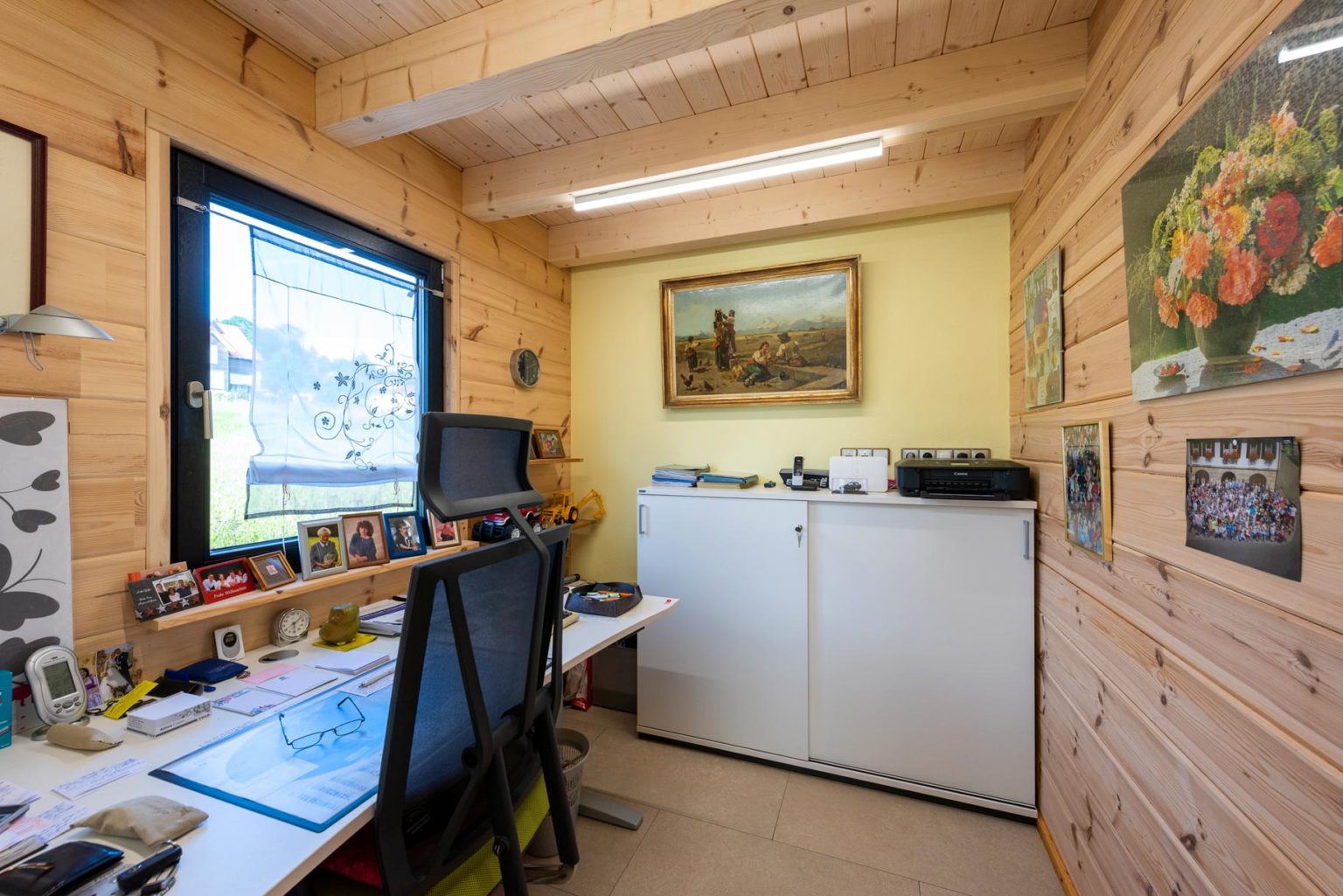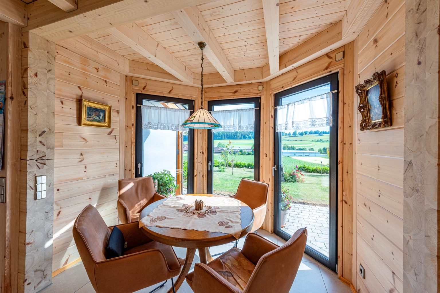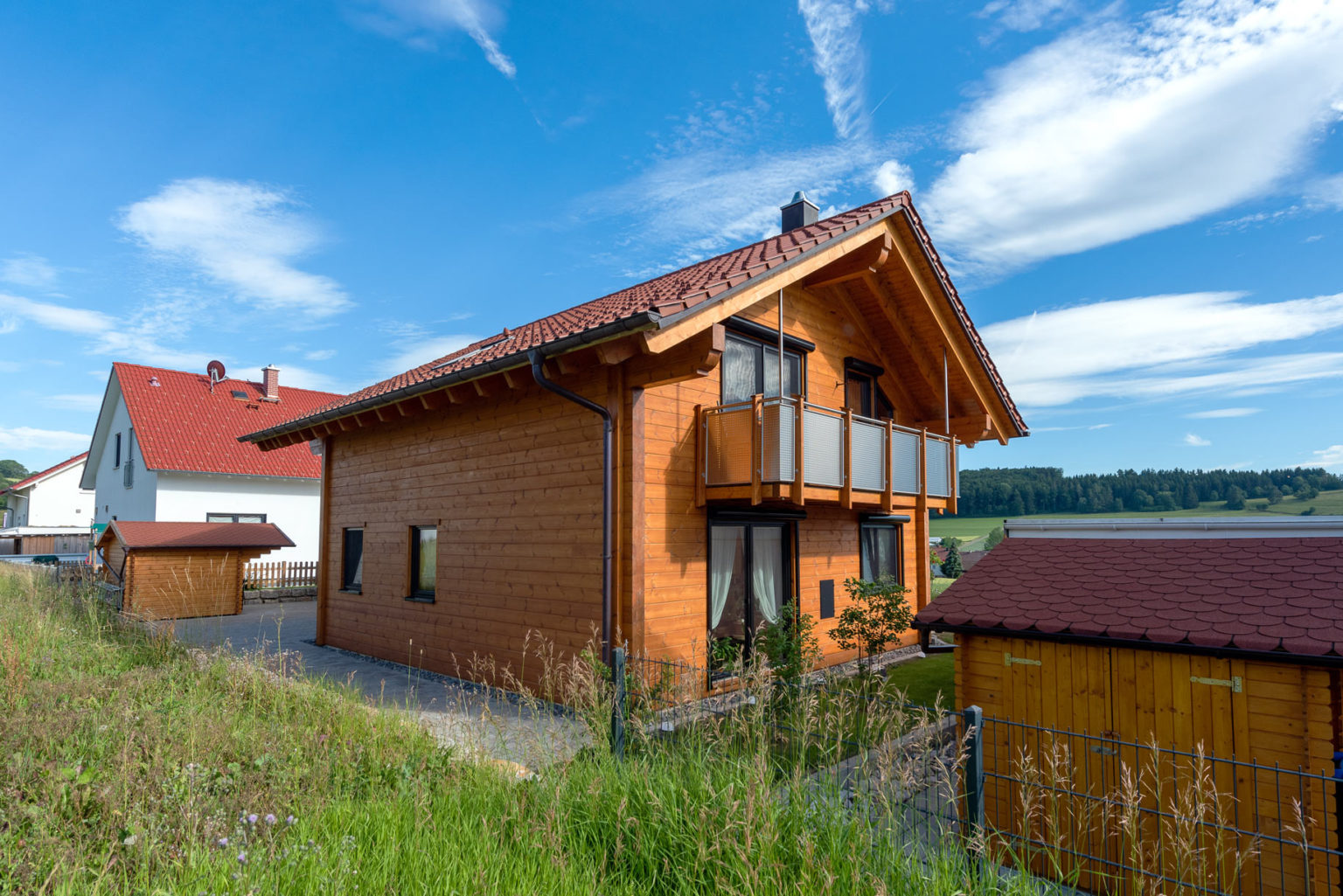 Rollstuhlgerechtes Holzhaus mit verglastem Sechseckerker