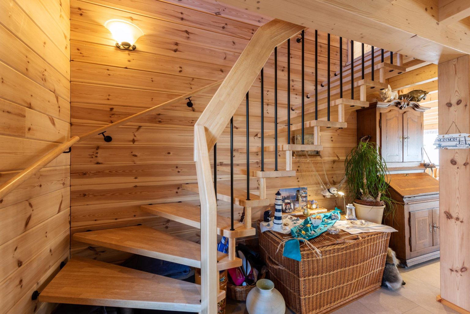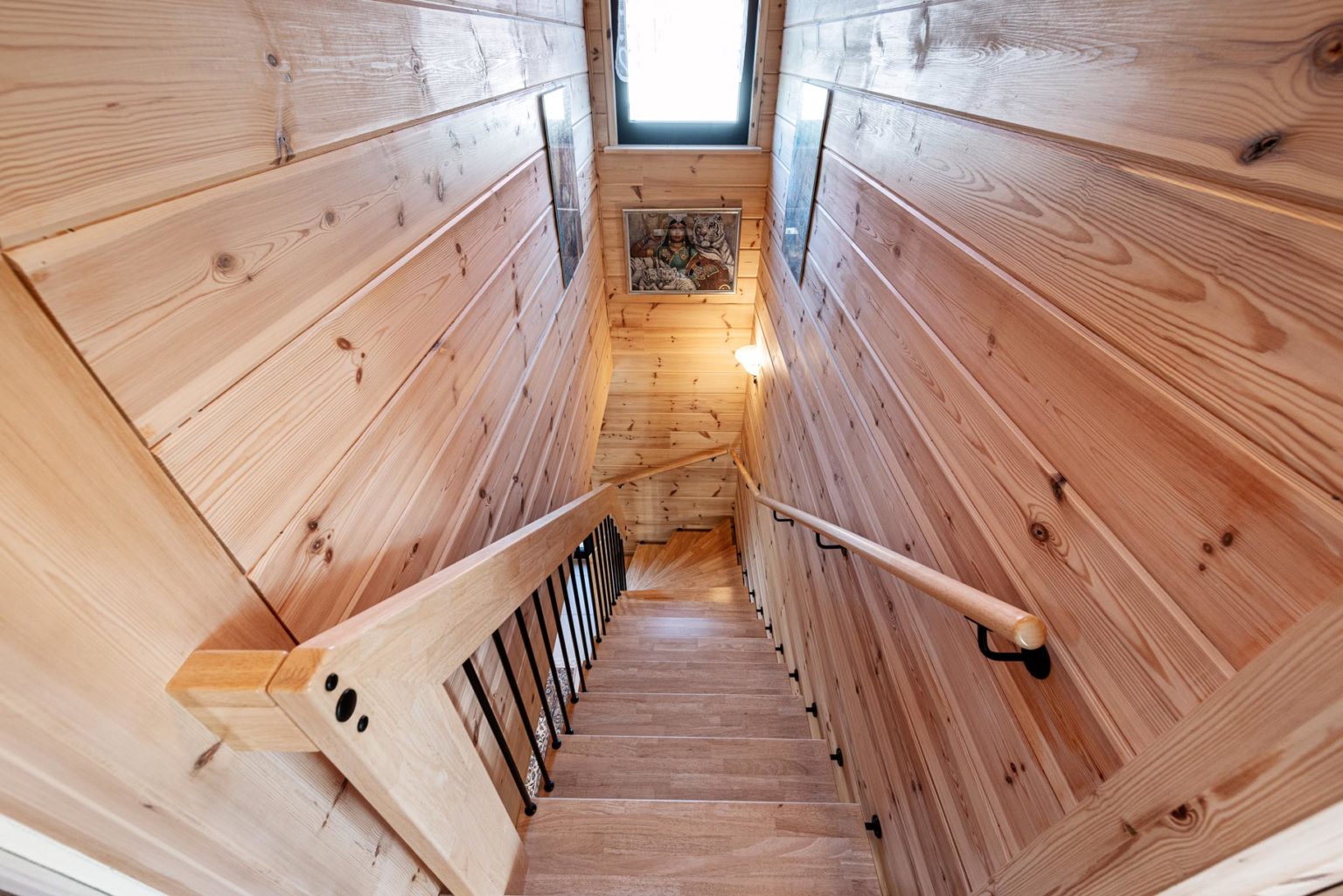 Abgesehen davon, dass es ein massives Holzhaus sein musste, wollte das Eigentümerpaar unbedingt einen großzügig verglasten, sechseckigen Turmerker und zwei barrierefreie, rollstuhlgeeignete Etagen. Die Turmerker waren noch vor 20 Jahren sozusagen Standard bei Fullwood, kamen aber vor circa 15 Jahren langsam aus der Mode und wurden durch rechteckige Erker mit Dach („Zwerchhaus“) – auch „dritter Quergiebel“ genannt – ersetzt, sofern überhaupt ein Erker gewünscht wurde. Selbstverständlich war der Wunsch auch dieser Bauherrschaft Befehl, denn bei Fullwood ist der Kunde König und kann frei wählen, was Sinn macht und funktioniert. Warum also nicht zwei rollstuhlgerechte Etagen im Holzhaus, die im Bedarfsfall mit einem Treppenlift verbunden werden können, bauen? Barrierefrei muss nicht zwingend Bungalow heißen.