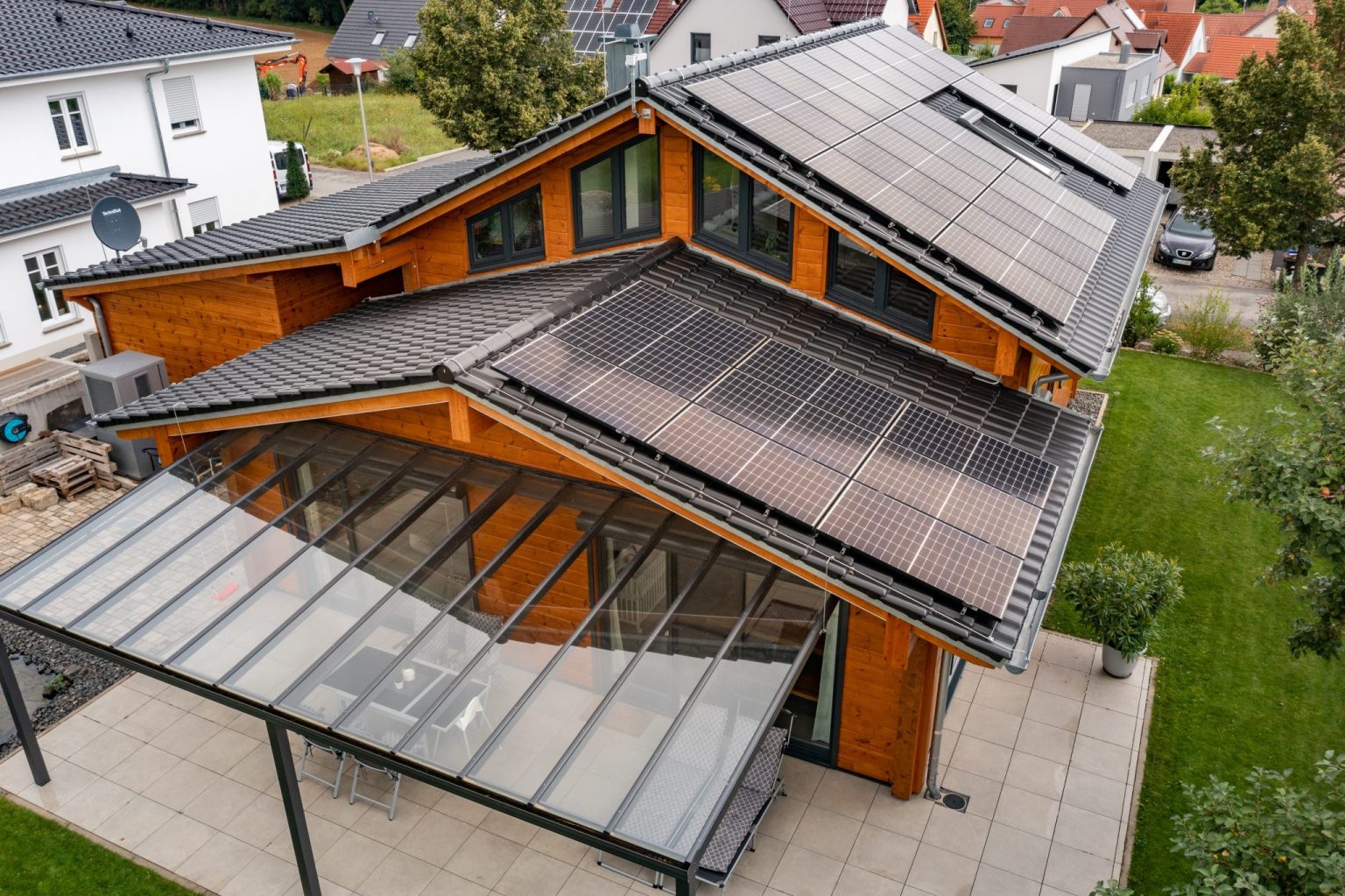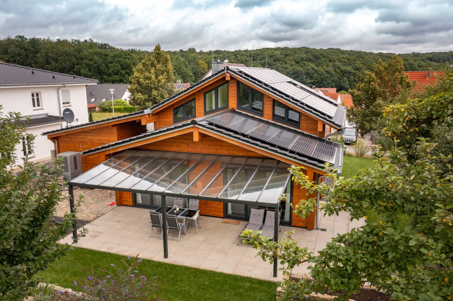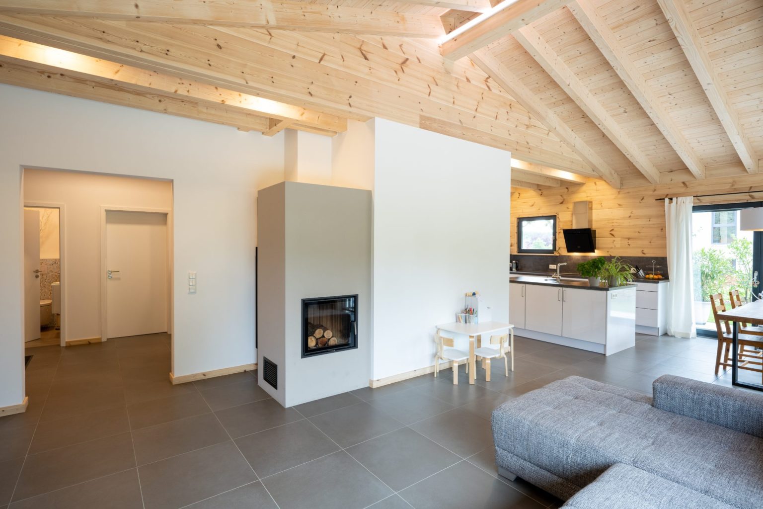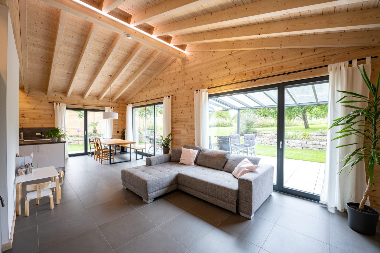Für den Hausaufbau wählte das Eigentümerpaar eine Richtmeistermontage. Unterstützt von Familie und Freunden bauten sie unter der Anleitung des Richtmeisters ihr Eigenheim selber auf. „Außer Fliesenlegen und Anstreichen haben wir alles selbst gemacht: von den Erdarbeiten, über die Hausmontage und die Dacheindeckung bis hin zum Innenausbau.“, berichtet der Hausherr stolz. „Wir haben ja nun schon ein paar Winter erlebt und sind begeistert, wie gut die 20cm dicken Vollholzwände dämmen, ganz ohne zusätzliche Dämmschicht!“, freut sich die Dame des Hauses. Beheizt wird Holzhaus „Schweinfurt“ über die Fußbodenheizung mit einer Luft/Wasser-Wärmepumpe und mit dem hellgrauen, kubischen Kaminofen, der im Wohnbereich steht. Die riesige Photovoltaikanlage auf dem Hausdach produziert deutlich mehr Sonnenstrom, als die Familie verbrauchen kann, sodass der Überschuss ins öffentliche Netzt gespeist wird. Die Installationen für Elektromobilität sind bereits vorhanden. Die Familie ist rundum happy mit und in ihrem natürlichen Smarthaus.