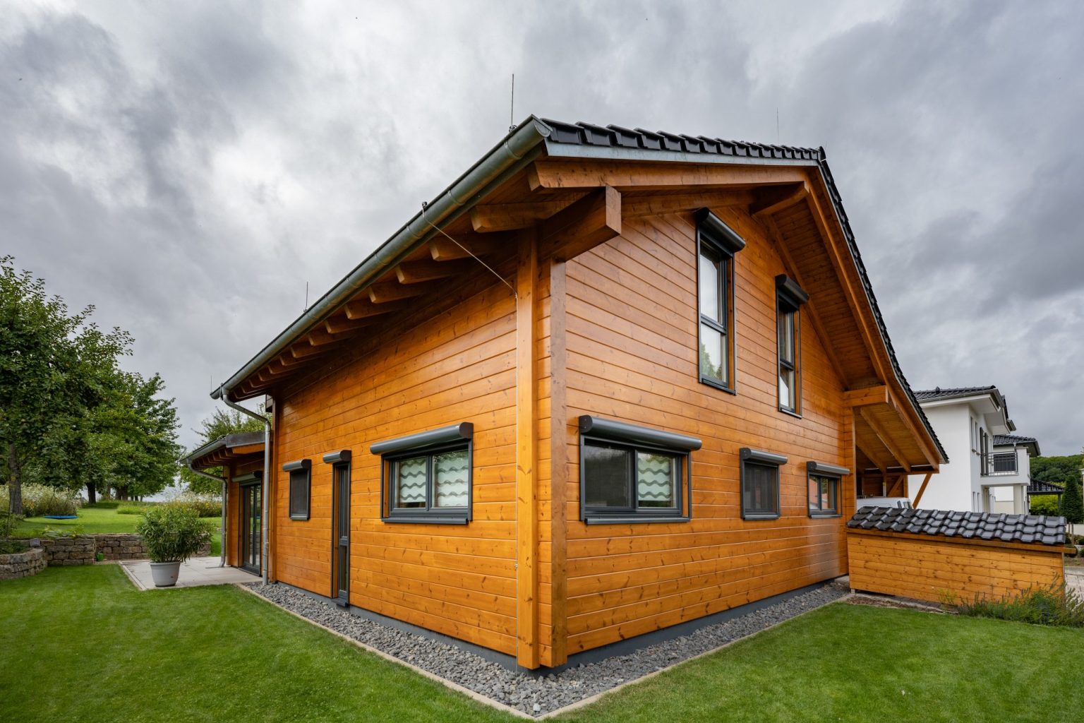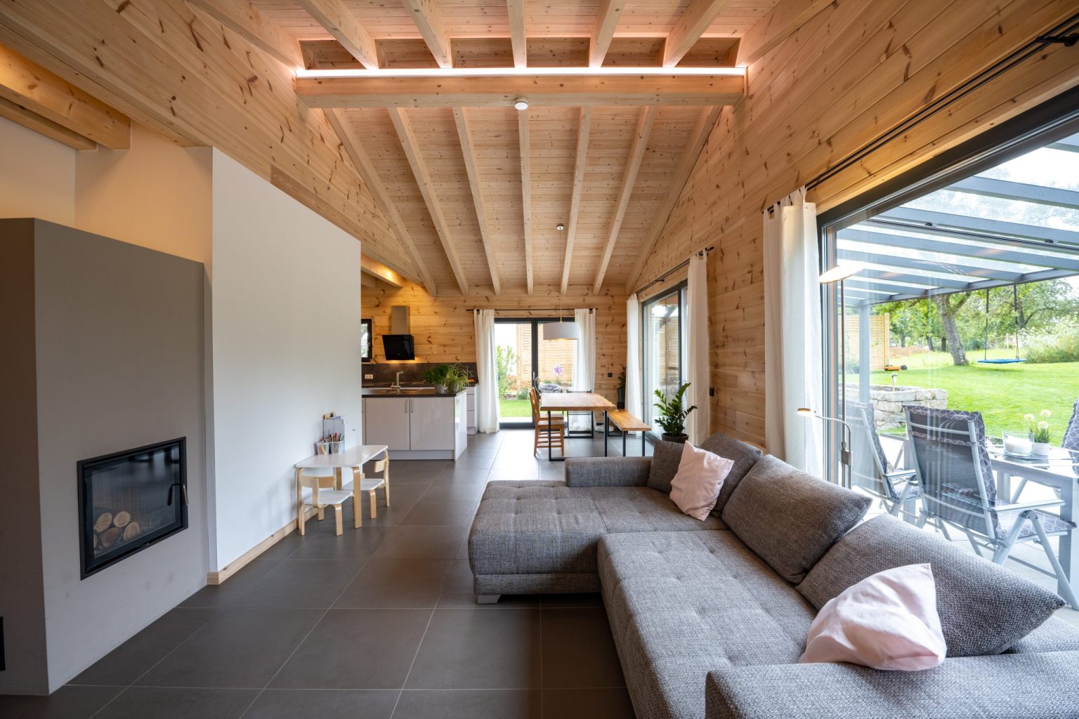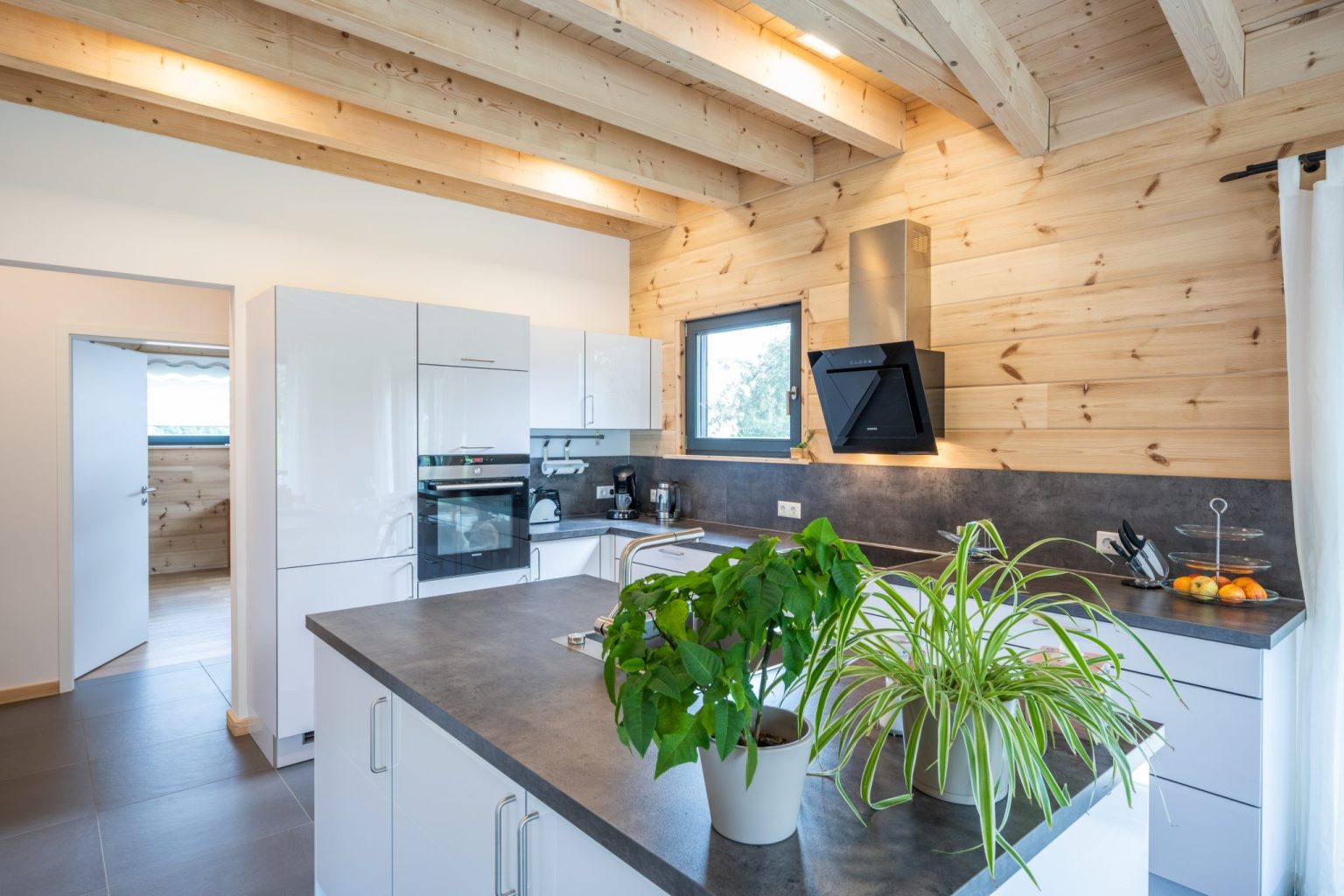 Für den Hausaufbau wählte das Eigentümerpaar eine Richtmeistermontage. Unterstützt von Familie und Freunden bauten sie unter der Anleitung des Richtmeisters ihr Eigenheim selber auf. „Außer Fliesenlegen und Anstreichen haben wir alles selbst gemacht: von den Erdarbeiten, über die Hausmontage und die Dacheindeckung bis hin zum Innenausbau.“, berichtet der Hausherr stolz. „Wir haben ja nun schon ein paar Winter erlebt und sind begeistert, wie gut die 20cm dicken Vollholzwände dämmen, ganz ohne zusätzliche Dämmschicht!“, freut sich die Dame des Hauses. Beheizt wird Holzhaus „Schweinfurt“ über die Fußbodenheizung mit einer Luft/Wasser-Wärmepumpe und mit dem hellgrauen, kubischen Kaminofen, der im Wohnbereich steht. Die riesige Photovoltaikanlage auf dem Hausdach produziert deutlich mehr Sonnenstrom, als die Familie verbrauchen kann, sodass der Überschuss ins öffentliche Netzt gespeist wird. Die Installationen für Elektromobilität sind bereits vorhanden. Die Familie ist rundum happy mit und in ihrem natürlichen Smarthaus.