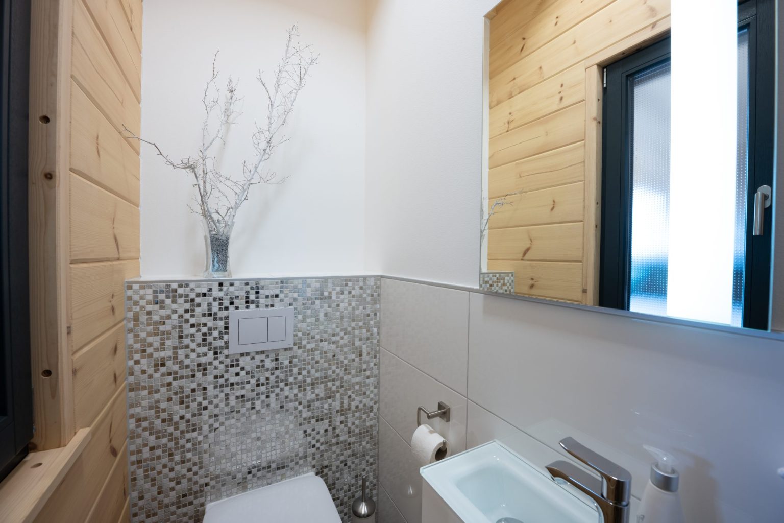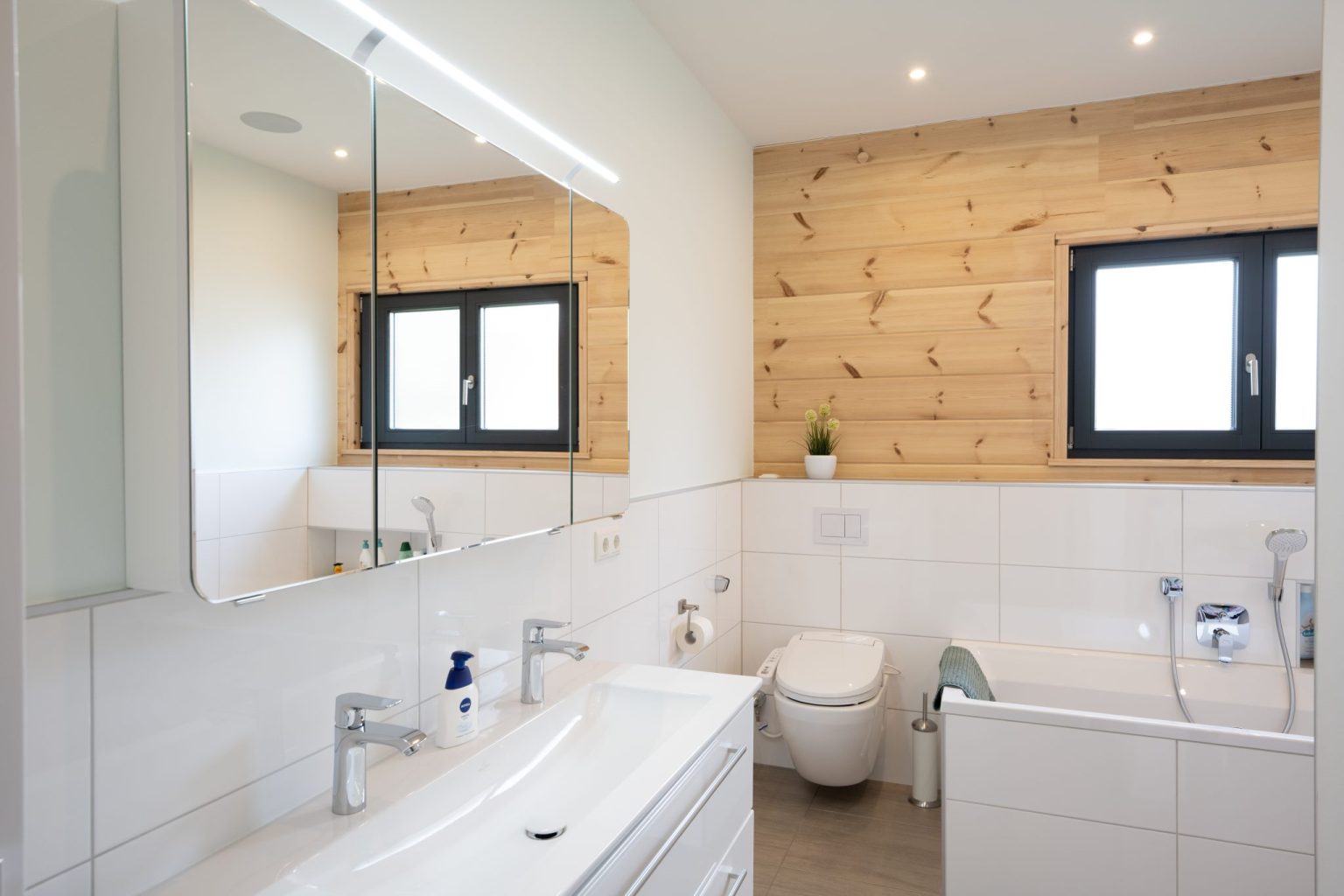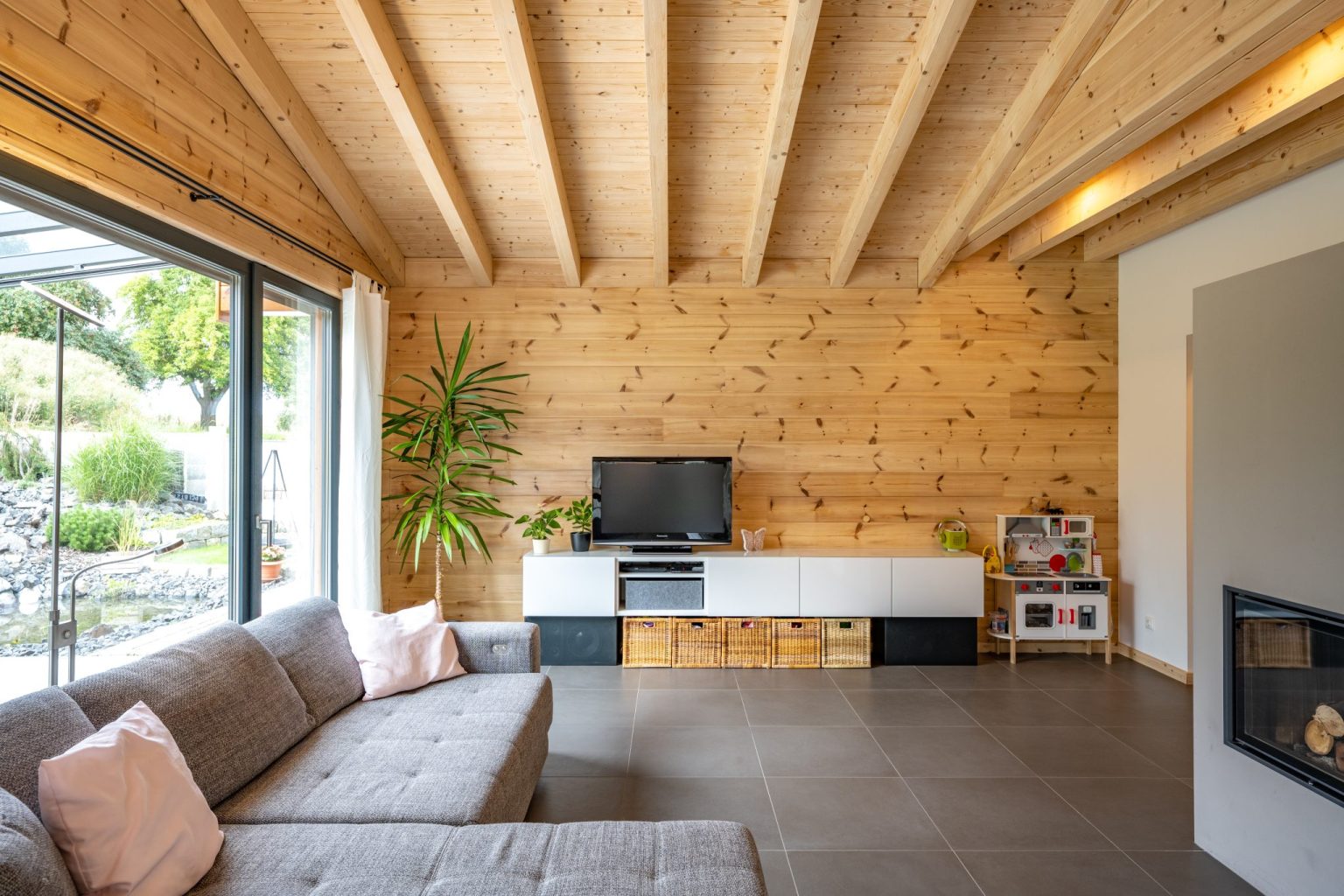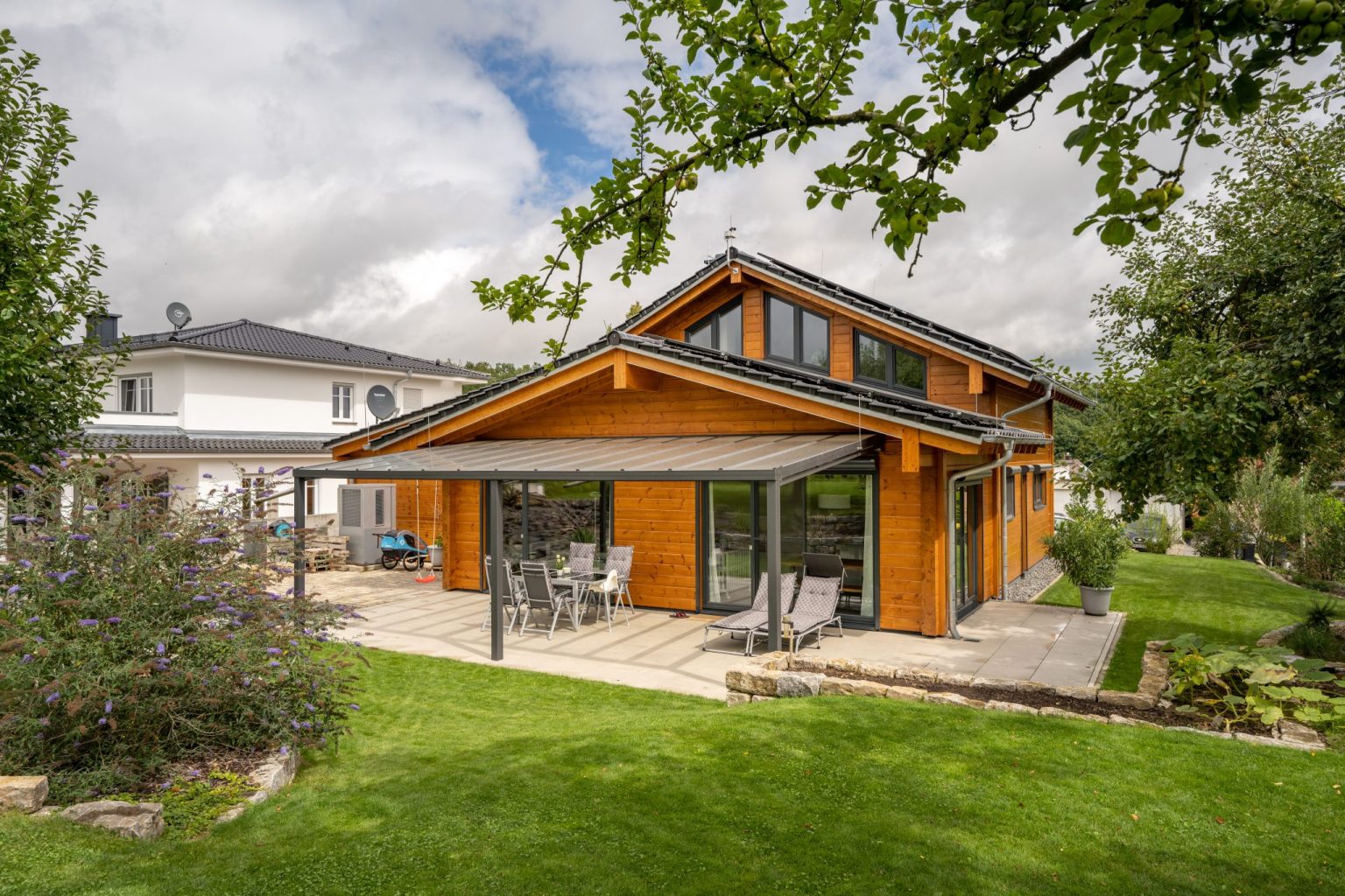 Für den Hausaufbau wählte das Eigentümerpaar eine Richtmeistermontage. Unterstützt von Familie und Freunden bauten sie unter der Anleitung des Richtmeisters ihr Eigenheim selber auf. „Außer Fliesenlegen und Anstreichen haben wir alles selbst gemacht: von den Erdarbeiten, über die Hausmontage und die Dacheindeckung bis hin zum Innenausbau.“, berichtet der Hausherr stolz. „Wir haben ja nun schon ein paar Winter erlebt und sind begeistert, wie gut die 20cm dicken Vollholzwände dämmen, ganz ohne zusätzliche Dämmschicht!“, freut sich die Dame des Hauses. Beheizt wird Holzhaus „Schweinfurt“ über die Fußbodenheizung mit einer Luft/Wasser-Wärmepumpe und mit dem hellgrauen, kubischen Kaminofen, der im Wohnbereich steht. Die riesige Photovoltaikanlage auf dem Hausdach produziert deutlich mehr Sonnenstrom, als die Familie verbrauchen kann, sodass der Überschuss ins öffentliche Netzt gespeist wird. Die Installationen für Elektromobilität sind bereits vorhanden. Die Familie ist rundum happy mit und in ihrem natürlichen Smarthaus.