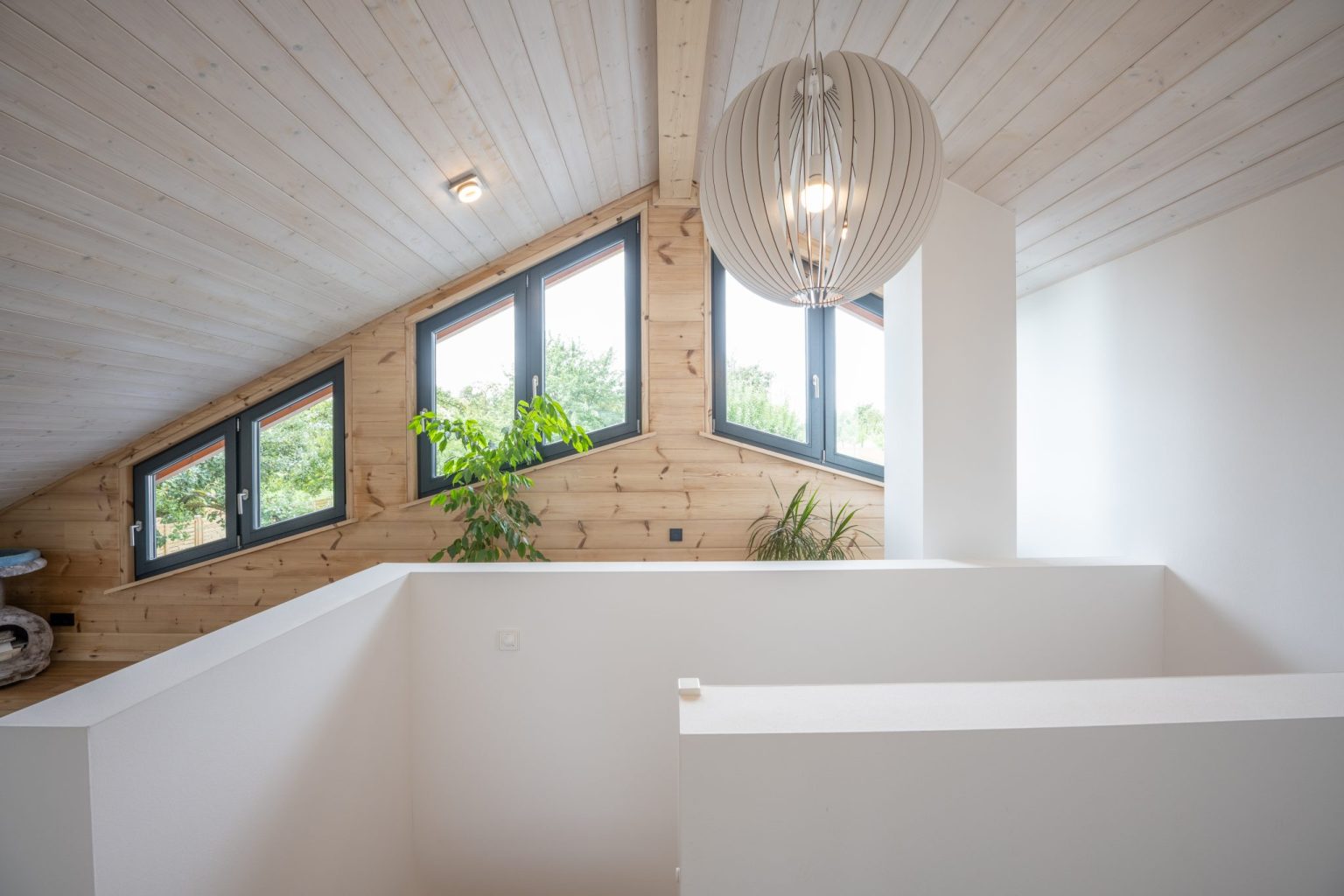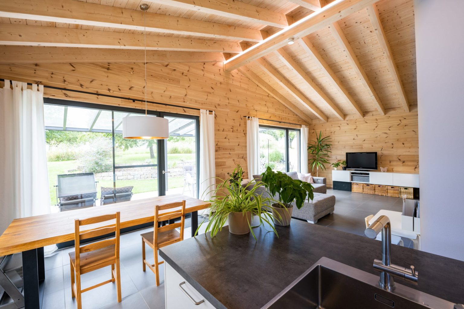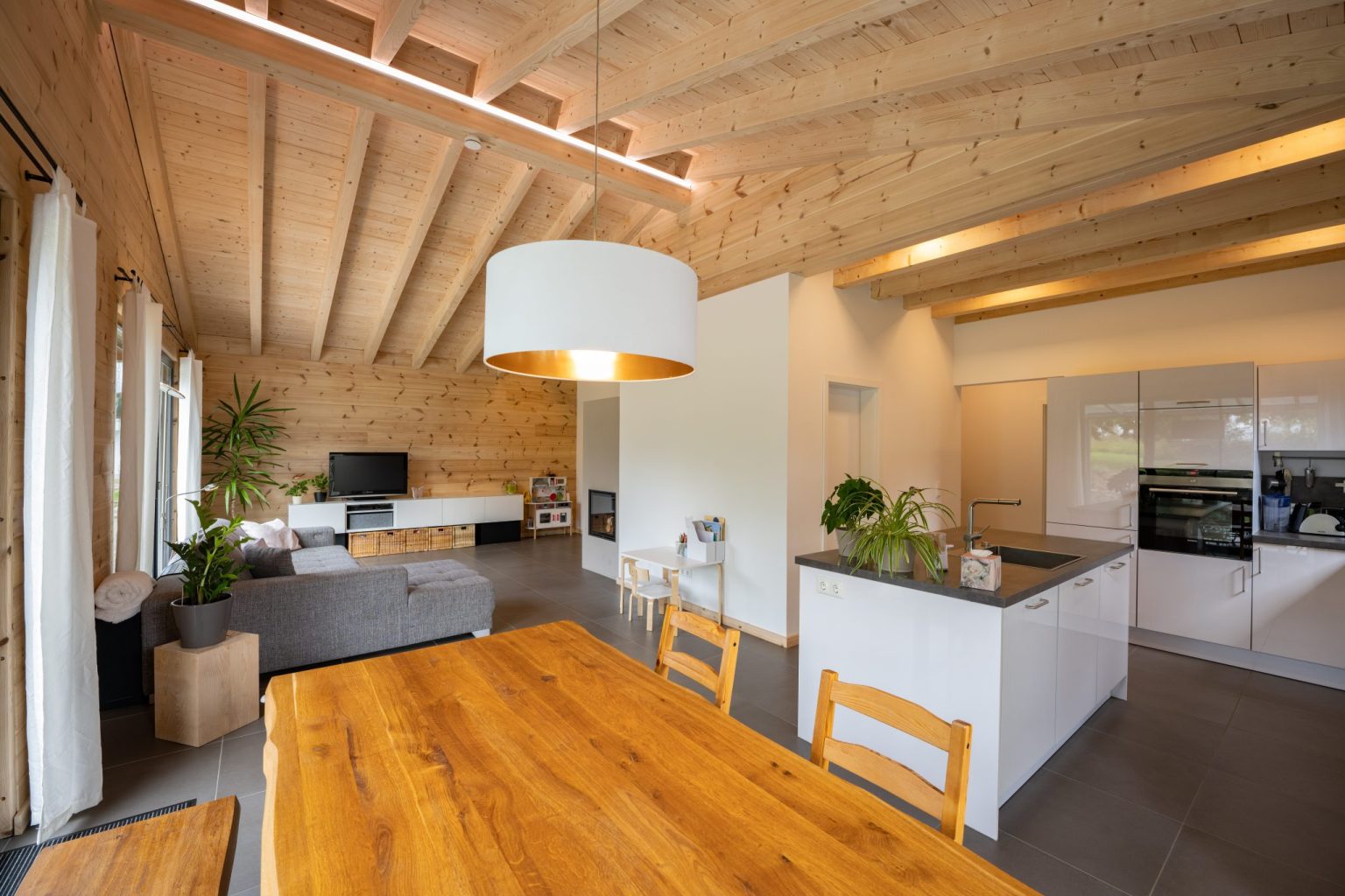 Geplant wurde das Einfamilienhaus nicht nur für die Phase der Familienzeit, sondern auch für das fortgeschrittene Alter. Deshalb befinden sich das Badezimmer sowie das Schlafzimmer im Erdgeschoss und im Obergeschoss sind nur die beiden Kinderzimmer sowie ein Abstellraum untergebracht. Ganz nach Wunsch der Hauseigentümer wurde alles individuell geplant und entsprechend umgesetzt. Da man später wahrscheinlich nur im Erdgeschoss leben wird, machte es Sinn, dort mehr Wohnfläche einzuplanen als im Dachgeschoss. Versetze Gebäudehöhen lösen diese Anforderung praktisch und elegant: Holzhaus „Schweinfurt“ besitzt einen großen eineinhalbgeschossigen Hausteil, aus dem zur Gartenseite ein eingeschossiger Hausteil über die gesamte Hausbreite hervorragt. Letzterer besitz circa ein drittel der Grundfläche des größeren Teils. Die Dachneigung beider Satteldächer ist gleich und der Höhenversatz zu Gunsten des Dachgeschosses verglast. Überhaupt sieht man viel Glas am Holzhaus, zum einen die vielen, teils bodentiefen Fensterflächen und zum anderen ein großes Terrassendach, welches die Gartenterrasse vor Regen schützt, aber den Räumen im Gebäude kein Licht wegnimmt. „Helligkeit im Haus ist für uns das A und O.“, betont die Hausherrin. Dazu tragen neben den großen Fenstern auch viele weiße Wandflächen (Trennwände) und weiße Zimmertüren bei. Auch das Kiefernholz der Wände und offenen Balkendecken (im Erdgeschoss) wird naturhell bleiben, also nicht nachdunkeln – dafür sorgt eine eigens aufgetragene UV-Schutzlasur. Die Holzverschalungen im Dachgeschoss sind sogar noch mit weißen Pigmenten aufgehellt, was die naturhelle Firstpfette zusätzlich betont. Im eingeschossigen Hausteil entschied sich das Eigentümerpaar für einen offenen Sichtdachstuhl, der eindrucksvoll den offenen Wohnbereich krönt. Auch das hierfür verwendete Kiefernholz ist mit UV-Schutz behandelt worden.