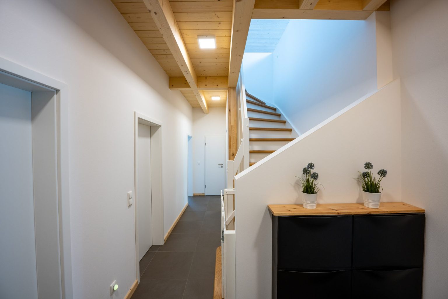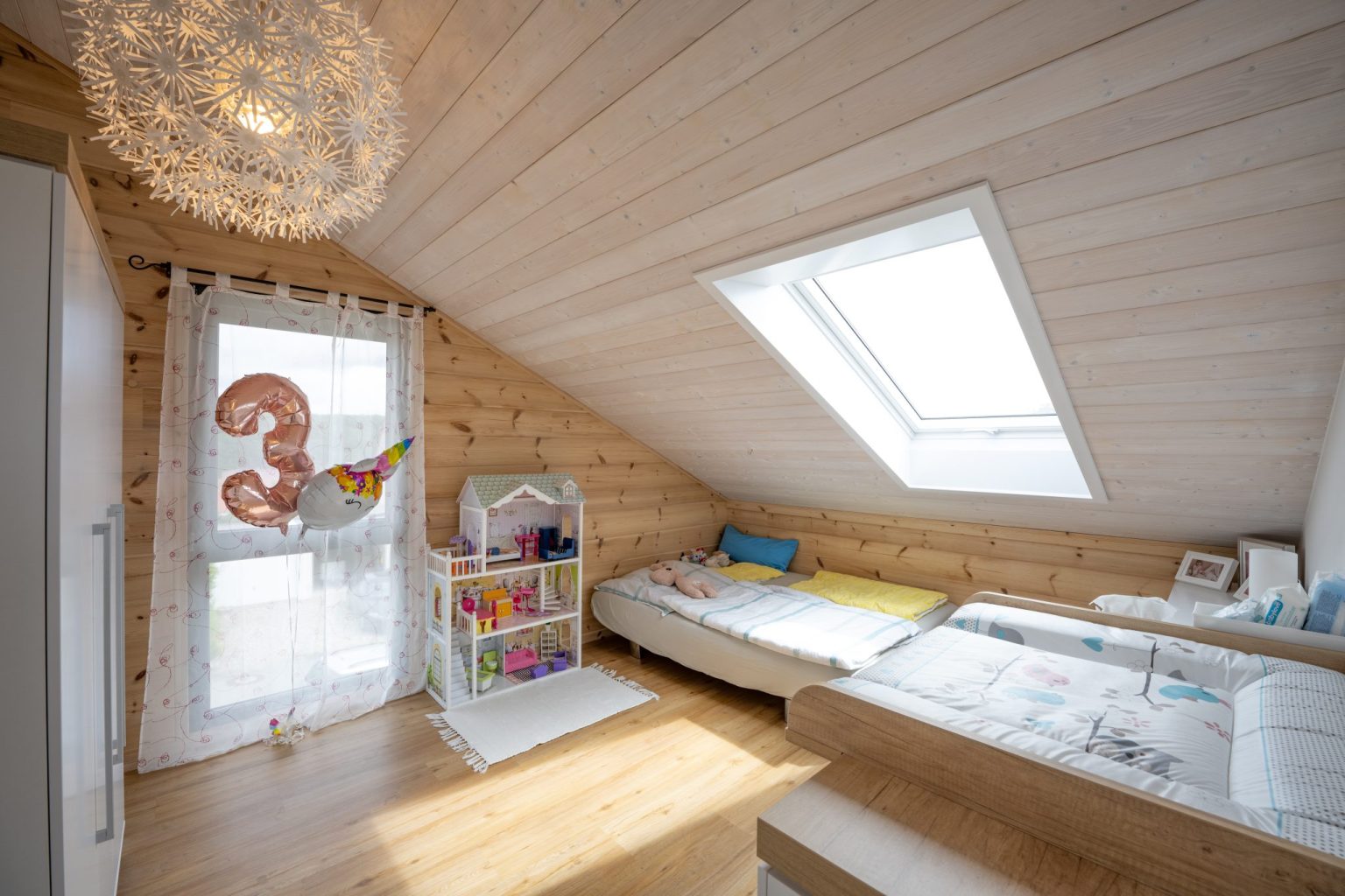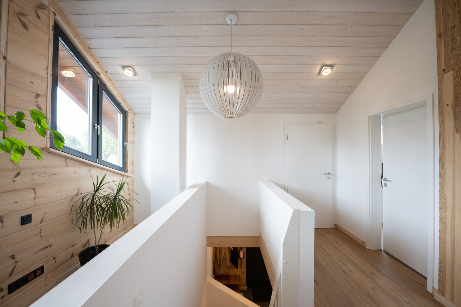 Geplant wurde das Einfamilienhaus nicht nur für die Phase der Familienzeit, sondern auch für das fortgeschrittene Alter. Deshalb befinden sich das Badezimmer sowie das Schlafzimmer im Erdgeschoss und im Obergeschoss sind nur die beiden Kinderzimmer sowie ein Abstellraum untergebracht. Ganz nach Wunsch der Hauseigentümer wurde alles individuell geplant und entsprechend umgesetzt. Da man später wahrscheinlich nur im Erdgeschoss leben wird, machte es Sinn, dort mehr Wohnfläche einzuplanen als im Dachgeschoss. Versetze Gebäudehöhen lösen diese Anforderung praktisch und elegant: Holzhaus „Schweinfurt“ besitzt einen großen eineinhalbgeschossigen Hausteil, aus dem zur Gartenseite ein eingeschossiger Hausteil über die gesamte Hausbreite hervorragt. Letzterer besitz circa ein drittel der Grundfläche des größeren Teils. Die Dachneigung beider Satteldächer ist gleich und der Höhenversatz zu Gunsten des Dachgeschosses verglast. Überhaupt sieht man viel Glas am Holzhaus, zum einen die vielen, teils bodentiefen Fensterflächen und zum anderen ein großes Terrassendach, welches die Gartenterrasse vor Regen schützt, aber den Räumen im Gebäude kein Licht wegnimmt. „Helligkeit im Haus ist für uns das A und O.“, betont die Hausherrin. Dazu tragen neben den großen Fenstern auch viele weiße Wandflächen (Trennwände) und weiße Zimmertüren bei. Auch das Kiefernholz der Wände und offenen Balkendecken (im Erdgeschoss) wird naturhell bleiben, also nicht nachdunkeln – dafür sorgt eine eigens aufgetragene UV-Schutzlasur. Die Holzverschalungen im Dachgeschoss sind sogar noch mit weißen Pigmenten aufgehellt, was die naturhelle Firstpfette zusätzlich betont. Im eingeschossigen Hausteil entschied sich das Eigentümerpaar für einen offenen Sichtdachstuhl, der eindrucksvoll den offenen Wohnbereich krönt. Auch das hierfür verwendete Kiefernholz ist mit UV-Schutz behandelt worden.