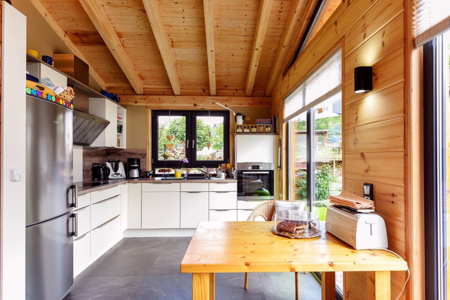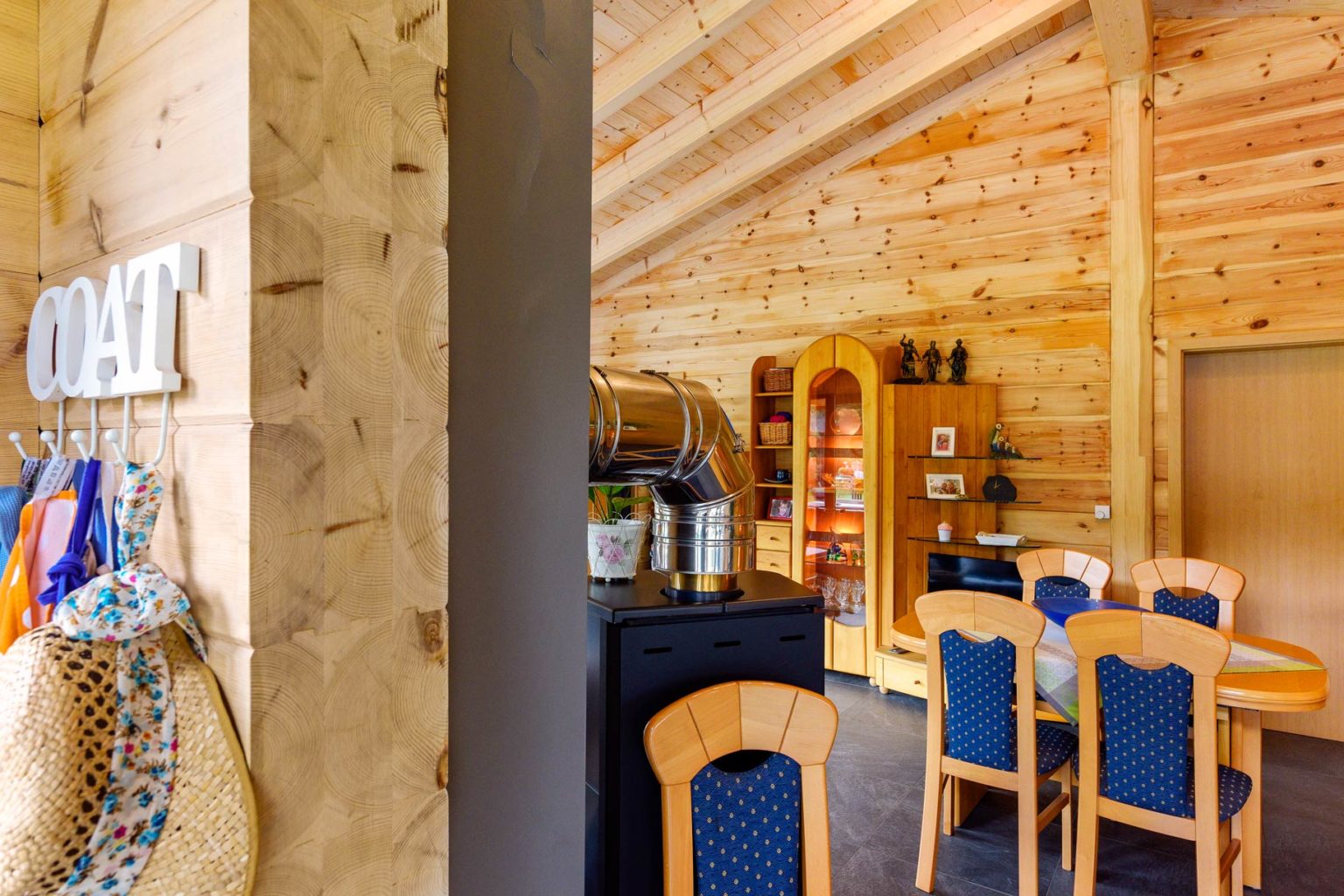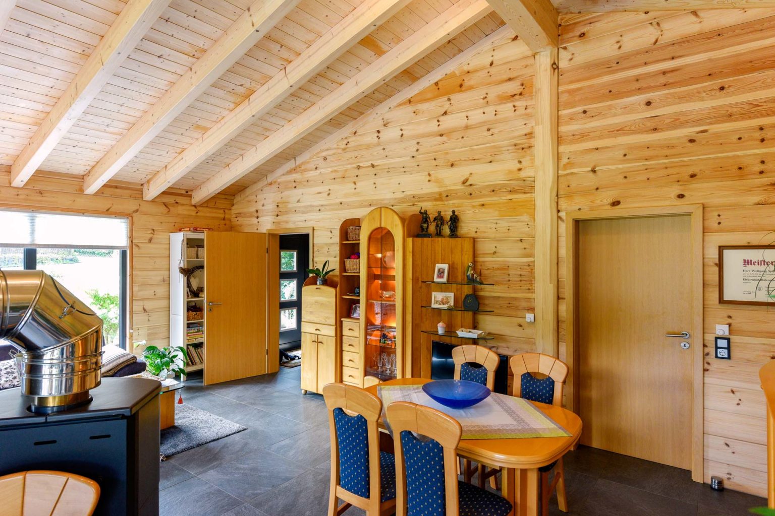 "Neben der Optik und dem zarten Kiefernduft lieben wir besonders das warme Wohngefühl in unserem massiven Holzhaus. Es ist immer gemütlich und heimelig drinnen, das mögen wir sehr.", schwärmt Regina Spill von ihrem Heim. Viel heizen muss das Paar nicht um es angenehm temperiert im Holzhaus zu haben, und am liebsten nutzen sie den Kaminofen für schnelle, gemütliche Strahlungswärme, obwohl eine mit Gas betriebene Fußbodenheizung vorhanden ist. Um die Kiefernwände und Dachschrägen naturhell zu belassen, strich Wolfgang Spill das Holz innen mit UV-Schutz gegen Nachdunkeln. "Ein dunkles, enges Knusperhäuschen wollten wir nicht, daher planten wir einen offenen Wohnbereich, in dem Wohnzimmer, Esszimmer und Küche in einem großen Raum sind, und bauten große, bodentiefe Fenster ein. Dadurch erhalten wir viel Tageslicht in unser barrierefreies Holzhaus.", beschreibt Wolfgang Spill die Wünsche des Paares an den Wohnalltag. Als echte Holzfans kam für ihn und seine Frau auch nur ein offener Sichtdachstuhl in Frage. "Dank des relativ flachen Satteldachs ist die Raumhöhe nicht zu überdimensioniert. Der Dachstuhl ist schon sehr imposant, finden wir.", ergänzt er. Außen strich der Hausherr die 20cm dicken Massivholzwände dreimal mit Schutz- und Farblasuren an. "Den warmen Farbton konnten wir uns selbst aussuchen, die Auswahl ist sehr groß und für jeden Geschmack etwas dabei.", meint Regina Spill. "Auch bezüglich Fensterrahmenfarbe und Farben und Materialien der Haus- sowie Innentüren und Fußböden - da gibt es schier keine Grenzen.", fährt sie fort.