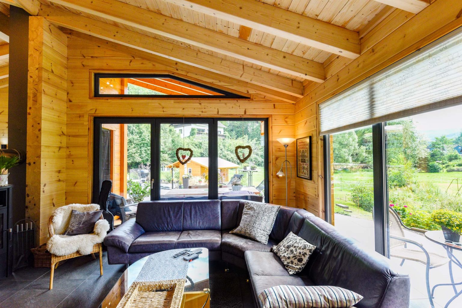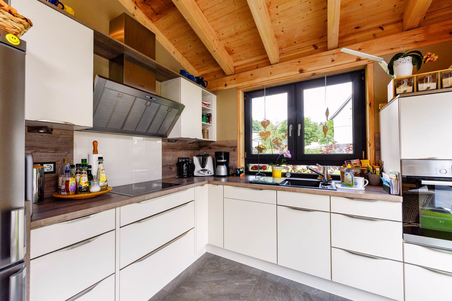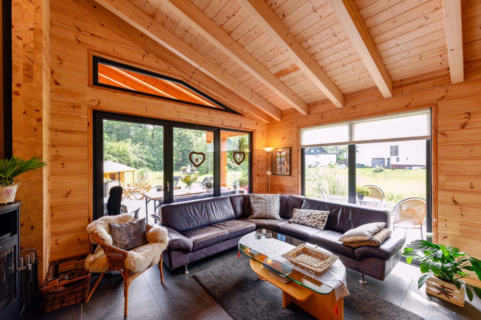 "Neben der Optik und dem zarten Kiefernduft lieben wir besonders das warme Wohngefühl in unserem massiven Holzhaus. Es ist immer gemütlich und heimelig drinnen, das mögen wir sehr.", schwärmt Regina Spill von ihrem Heim. Viel heizen muss das Paar nicht um es angenehm temperiert im Holzhaus zu haben, und am liebsten nutzen sie den Kaminofen für schnelle, gemütliche Strahlungswärme, obwohl eine mit Gas betriebene Fußbodenheizung vorhanden ist. Um die Kiefernwände und Dachschrägen naturhell zu belassen, strich Wolfgang Spill das Holz innen mit UV-Schutz gegen Nachdunkeln. "Ein dunkles, enges Knusperhäuschen wollten wir nicht, daher planten wir einen offenen Wohnbereich, in dem Wohnzimmer, Esszimmer und Küche in einem großen Raum sind, und bauten große, bodentiefe Fenster ein. Dadurch erhalten wir viel Tageslicht in unser barrierefreies Holzhaus.", beschreibt Wolfgang Spill die Wünsche des Paares an den Wohnalltag. Als echte Holzfans kam für ihn und seine Frau auch nur ein offener Sichtdachstuhl in Frage. "Dank des relativ flachen Satteldachs ist die Raumhöhe nicht zu überdimensioniert. Der Dachstuhl ist schon sehr imposant, finden wir.", ergänzt er. Außen strich der Hausherr die 20cm dicken Massivholzwände dreimal mit Schutz- und Farblasuren an. "Den warmen Farbton konnten wir uns selbst aussuchen, die Auswahl ist sehr groß und für jeden Geschmack etwas dabei.", meint Regina Spill. "Auch bezüglich Fensterrahmenfarbe und Farben und Materialien der Haus- sowie Innentüren und Fußböden - da gibt es schier keine Grenzen.", fährt sie fort.