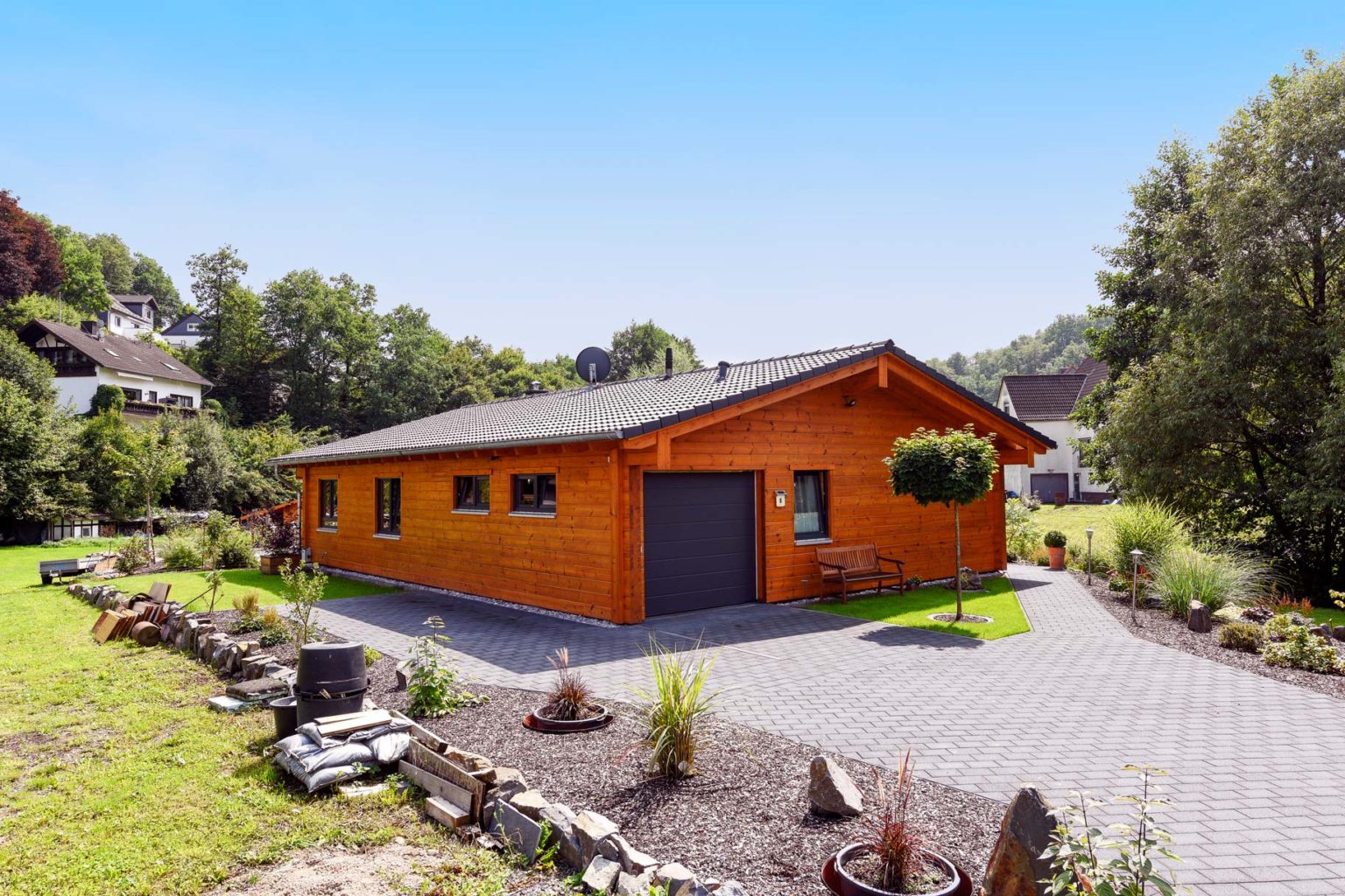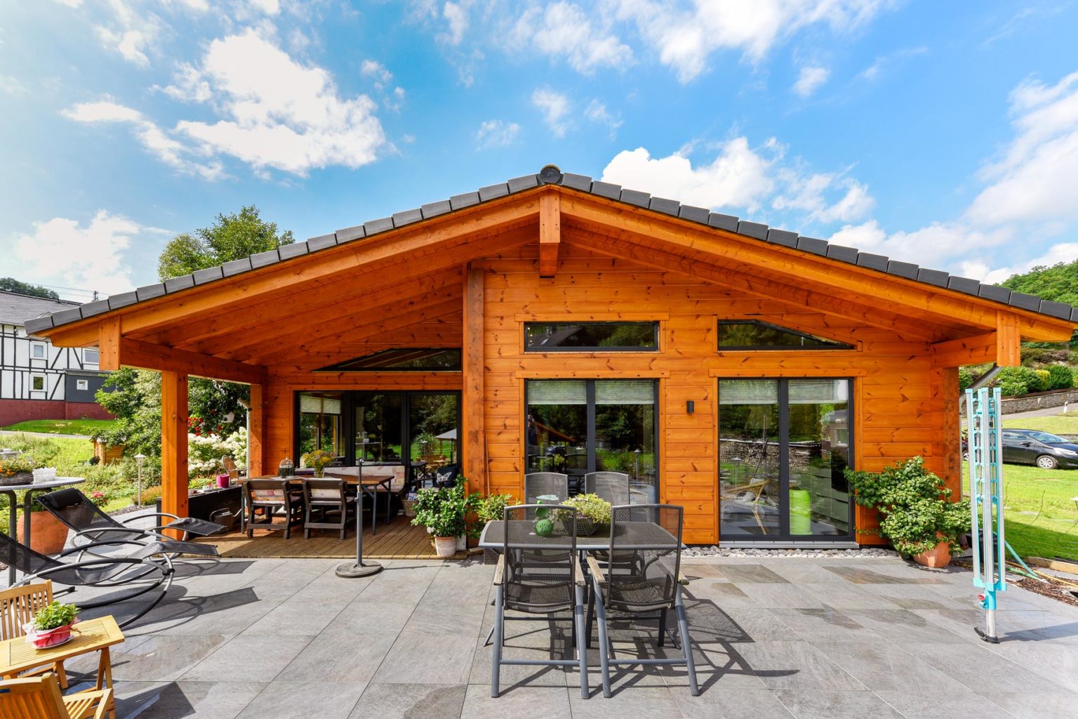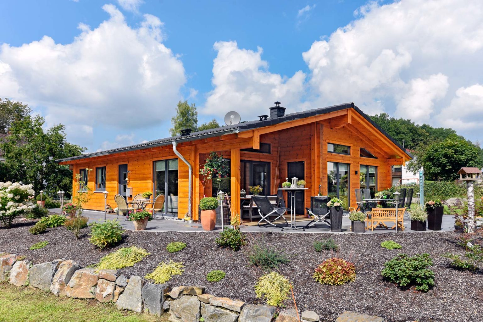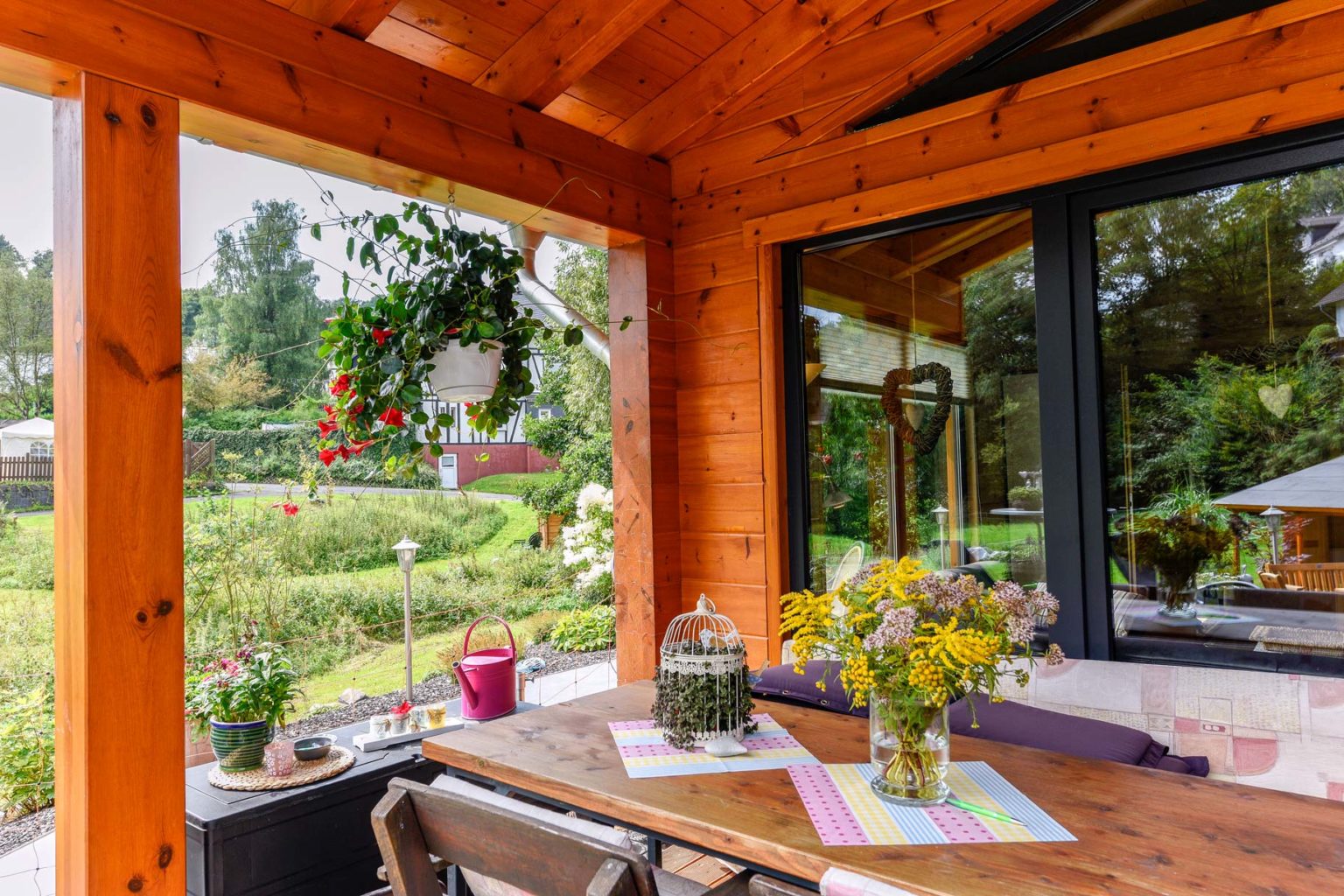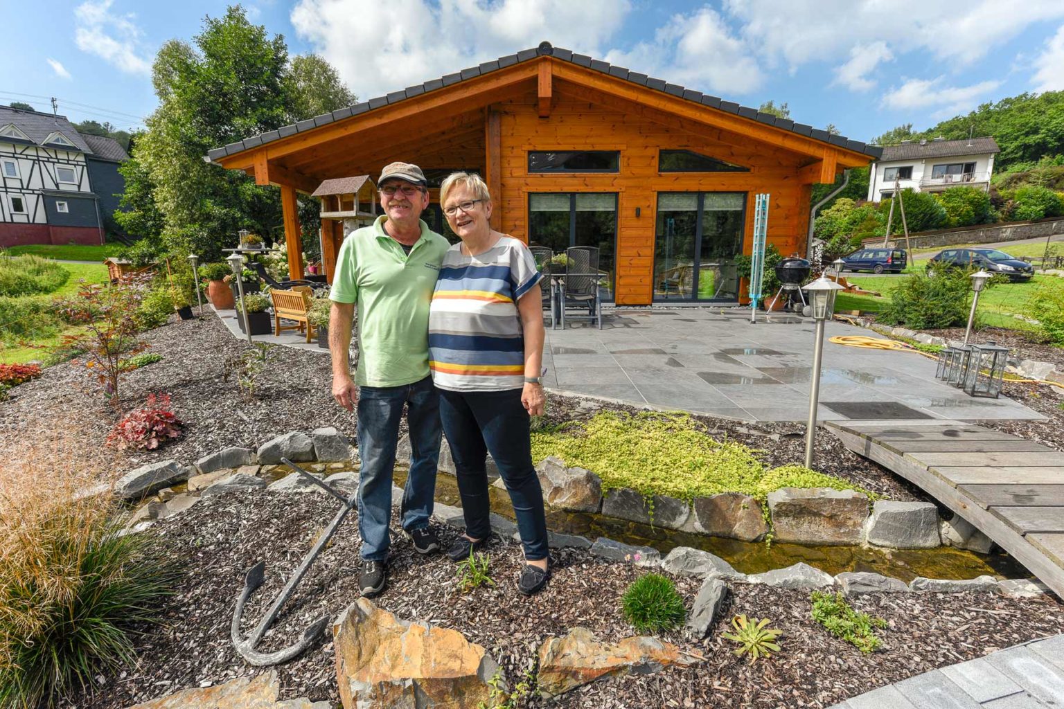 "Wir wollten unbedingt einen barrierefreien Bungalow, da wir selbst nicht mehr die Allerjüngsten sind und außerdem meine Schwiegermutter ein Appartement im Holzhaus bekommen sollte.", erklärt Regina Spill. Glücklicherweise baut der ausgewählte Holzhaus-Spezialist Fullwood ausschließlich individuelle Traumhäuser. Sodann setzte man sich im Musterhaus zusammen und plante Holzhaus "Siegerland“ gemeinsam. "Wir mussten uns von vielen Dingen trennen, da unser altes Haus deutlich größer war, aber so haben wir weniger Arbeit mit dem neuen Holzhaus.", sagt Regina Spill. Man entschied sich für die von Fullwood angebotene Richtmeistermontage, bei der Bauherren Eigenleistung einbringen können und dadurch Geld sparen. "Ich bin Elektromeister und habe neben der Elektrik etliche Gewerke im Innenausbau selber machen können.", erläutert der Hausherr. Nebenberuflich ist er leidenschaftlicher Hunde- und Agility-Trainer. Bevor der Hausaufbau beginnen konnte, ließ Ehepaar Spill das Grundstück aufschütten um ebenerdig und ohne Keller bauen zu können. "Als die im Werk gefertigten Wandelemente angeliefert wurden ging alles ganz schnell und nach ein paar Tagen stand der Rohbau schon. Wir haben bei der Montage mitgeholfen und wurden vom Fullwood-Richtmeister bestens angewiesen und unterstützt.", erinnert sich Wolfgang Spill. Bereits drei Monate nach Baubeginn konnten die Spills schon in ihr schöne, ebenerdiges Holzhaus einziehen. Die Außenanlage war da natürlich noch lange nicht fertig – Grün und Pflanzen brauchen länger Zeit zum Gedeihen.