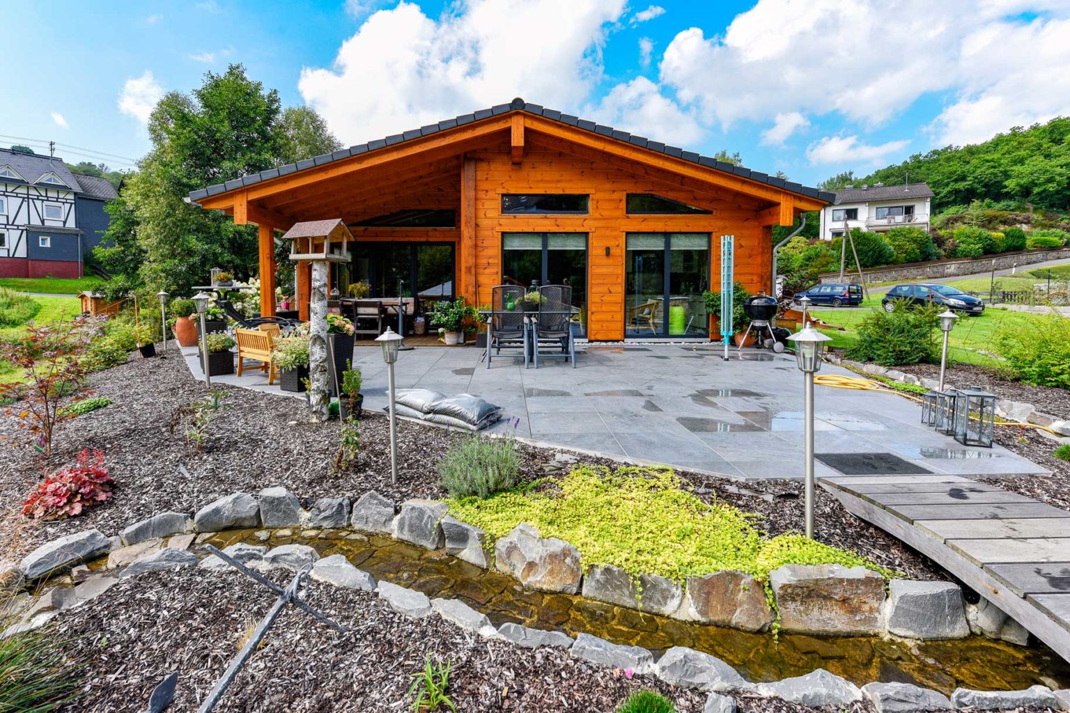 Der Hausgrundriss ist nahezu rechteckig bis auf einen Versatz an der Süd-Ecke von Holzhaus Siegerland. Dort entstand eine windgeschützte Nische auf der Terrasse, die zudem vom Hausdach überdeckt ist. "Hier sitzen wir auch bei Regen geschützt draußen.", freut sich die Hauseigentümerin. Das als Mehrgenerationenhaus gebaute Holzhaus Siegerland wird an der Süd/West-Seite betreten. Man gelangt in eine kleine Diele, die zum Wohnbereich (rechter Hand) hin offen ist. Links geht es ins Appartement mit angeschlossenem Bad der (Schwieger-)Mutter, vis-a-vis der Haustüre ist das Duschbad/WC der Eheleute positioniert. Der Wohnbereich ist verwinkelt und dadurch optisch deutlich aufgeteilt. Von vormittags bis abends kann die Sonne herein scheinen, so dass immer reichlich natürliches Licht in den Wohnbereich dringt. Das Schlafzimmer ist nach Nord/Osten ausgerichtet und vom Wohnbereich aus direkt erreichbar. Ein Hauswirtschaftsraum schließt das Raumprogramm ab. Praktischerweise verfügt er über eine direkte Verbindung zur Garage, die ebenfalls im Baukörper integriert ist. Ein idealer, alltagstauglicher Grundriss, der optimal genutzte Wohnfläche bietet. Das selbst gestaltete Gartenparadies ist leicht abfallend und mit zwei durchkreuzenden Bächlein – davon ist einer natürlichen Ursprungs und der andere künstlich angelegt – neben dem Holzhaus an sich der ganze Stolz seiner Besitzer. Sogar das Gartenhäuschen wurde mit dem Holz von Fullwood gebaut, so passt alles perfekt zusammen.