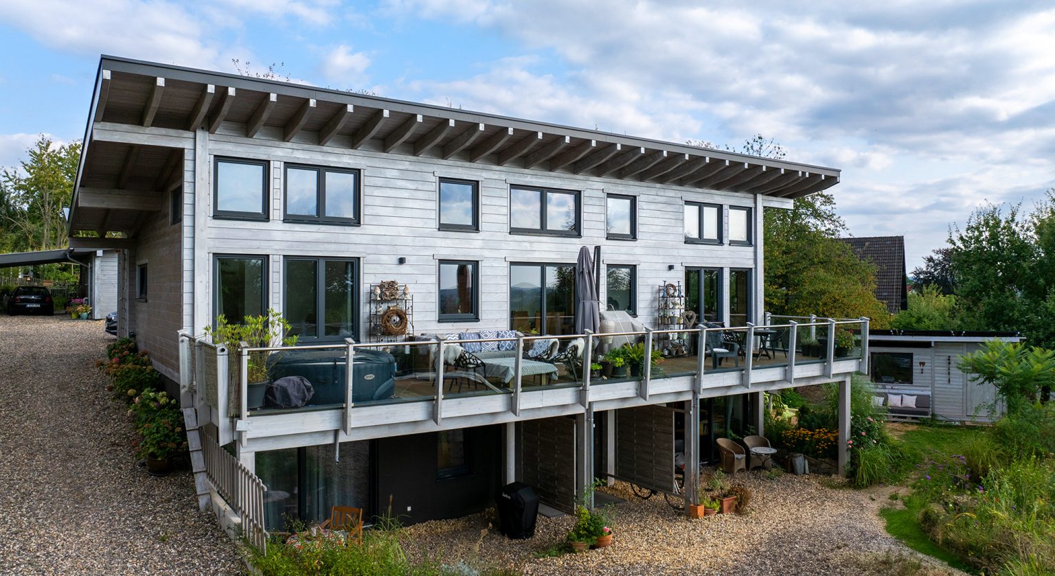 Nicht zum ersten Mal baut ein und dieselbe Bauherrschaft mehr als ein Fullwood Wohnblockhaus. Aber gleich zwei auf einen Streich – also unmittelbar nach- und nebeneinander zu bauen, kommt sehr selten vor. Im Falle der Holzhäuser „Silverado Lodge“ und “Greywood“ ist es so. Die Eigentümer hatten sich schon lange bevor der eigene Baugedanke aktuell wurde für ein Holzhaus von Fullwood im Nachbardorf begeistert und wollten, wenn überhaupt, nur so bauen. „Mein Mann ist in den Rocky Mountains aufgewachsen, in Colorado hatten wir später dann ein kleines Wochenendhaus aus Holz und in der Schweiz, wo mein Mann eine Zeit lang gelebt hat, gibt es ebenfalls viele Holzhäuser. Kurzum: Es war immer unser Traum, dauerhaft in einem Massivholzhaus zu leben.“, erklärt die Hausherrin, die außerdem unbedingt naturnah und klimaschonend bauen und in behaglicher Atmosphäre wohnen wollte. Ihr Mann und sie waren sich also von Anfang an einig, dass nur ein massives Holzhaus in Frage käme, sollte man irgendwann einmal bauen. „Ich bin seit über 30 Jahren bei einem Recycling-Unternehmen beschäftigt, entsprechend ist Nachhaltigkeit für meine Familie und mich immens wichtig. Die einzige dazu passende Bauweise, die uns gefällt, ist die massive Holzbauweise. Holzrahmenbau sprach uns persönlich weniger an, außerdem verschwendet man Wohnfläche, da die Wände deutlich dicker sind als die 20cm Durchmesser der Fullwood-Blockwände.“, sagt die Dame des Hauses. Tatsächlich klopfte sie eines Tages einfach mal bei dem Fullwood Wohnblockhaus in der Nachbarschaft an und so nahm alles seinen Lauf: Man besichtigte ein Musterhaus des Holzhaus Spezialisten und blieb dort hängen. „Wir haben keine weiteren Holzhaushersteller mehr besucht.“, lacht sie und ihr Mann ergänzt: „Uns gefiel nicht nur die Optik der Fullwood-Häuser, sondern auch die exakte, detailliert durchdachte und penibel umgesetzte Fertigbauweise des Herstellers. Außerdem ist der Firmenhauptsitz nur 20km von uns entfernt, was uns sowohl unter ökologischen Aspekten gefiel, als auch mit Blick auf die Unterstützung der regionalen Wirtschaft.“