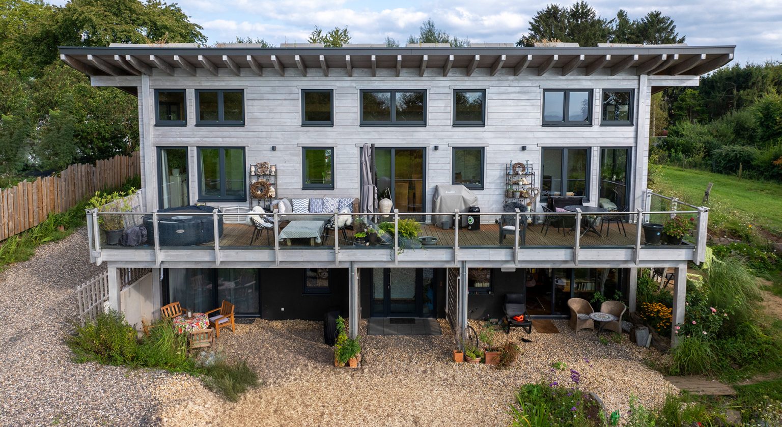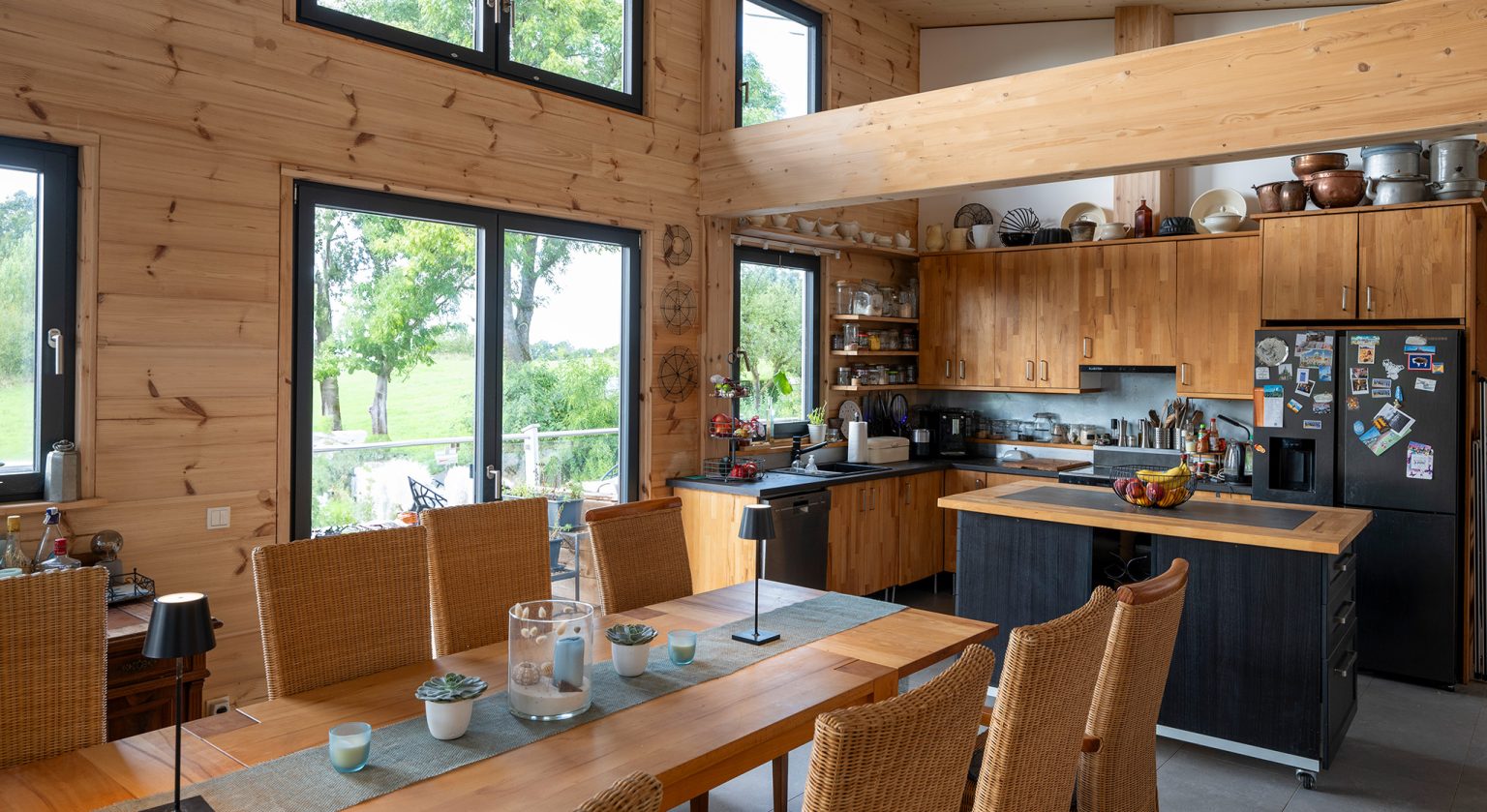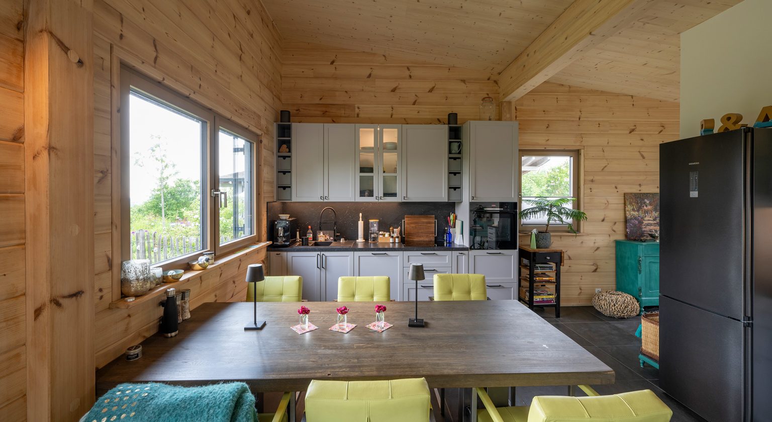 Bei beiden Häusern half die ganze Familie beim Stellen und beim Innenausbau mit. Besonders aktiv beteiligten sich der Hausherr, selbst ein gelernter Zimmermann, der heute aber Experte für Sicherheitspolitik und deutsch-amerikanische Beziehungen ist, und die beiden Söhne, welche sich als besonders geschickte Amateurhandwerker erwiesen. Die Hausmontage geschah freilich unter der Regie und Vorarbeit des erfahrenen Fullwood-Richtmeisters, über den das Ehepaar ausschließlich Gutes berichtet. „Das kleine Holzhaus, mit dem etwas dunkleren silbergrauen Farbanstrichs, stellten wir in drei langen Tagen auf, das große, mit der helleren silbergrauen Außenlasur, in vier Tagen.“, so die Eigentümerin. Sogar Freunde und Nachbarn beteiligten sich an einigen Arbeiten am und in den Häusern – ein echtes Gemeinschaftserlebnis also. „Unser Baugrundstück mit Blick auf das Siebengebirge bekamen wir auch nur, weil wir schon seit 25 Jahren in der Dorfgemeinschaft engagiert und integriert sind. Eine liebe Nachbarin und ihre Kinder war bereit, uns das Grundstück zu verkaufen, damit wir nach einer Eigenbedarfskündigung unserer Mietwohnung im Dorf bleiben konnten.“, fasst der Hausherr zusammen. Holzhaus „Silverado Lodge“ umfasst einen großflächigen, offenen Wohn-/Ess-/Kochbereich, der sich nach oben bis zur sichtbaren Firstpfette und darüber hinaus erstreckt. Dank der vielen, bis unter das Dach reichenden, bodentiefen Fenster ist er tagsüber von reichlich natürlichem Licht durchflutet. In diesen Wohnbereich gelangt man von der offenen Diele aus. Ein Schlafzimmer mit Badezimmer en Suite, ein weiteres Schlafzimmer (mit eigenem Zugang zur Gäste-Dusche/WC) und ein Arbeitszimmer bilden die privaten Räume. Im kleineren und etwas niedrigeren Holzhaus „Greywood“ sind ebenfalls ein offener Wohn-/Ess-/Kochbereich, ein Schlafzimmer mit angeschlossenem Badezimmer, ein weiters Zimmer mit Zugang in ein eigenes Bad, sowie ein kleiner Technikraum untergebracht. Dieses Gebäude ist nicht unterkellert. Beheizt werden beide Wohnhäuser per Fußbodenheizung: Das große profitiert von Geothermie und PV-Anlage, das kleine wird mittels Luft-Wärmepumpe versorgt. Eine 6000 l umfassende Regenwasserzisterne komplettiert das ressourcenschonende Energiekonzept. Dem ökologischen Gedanken entsprechend, wurden die Trennwände (leichter Ständerbau) im Hausinnern mit natürlicher Holzwolle gedämmt. Die Außenwände hingegen sind komplett ungedämmt, und wurden drinnen mit UV-Schutz lasiert, um ein natürliches Nachdunkeln zu verhindern.