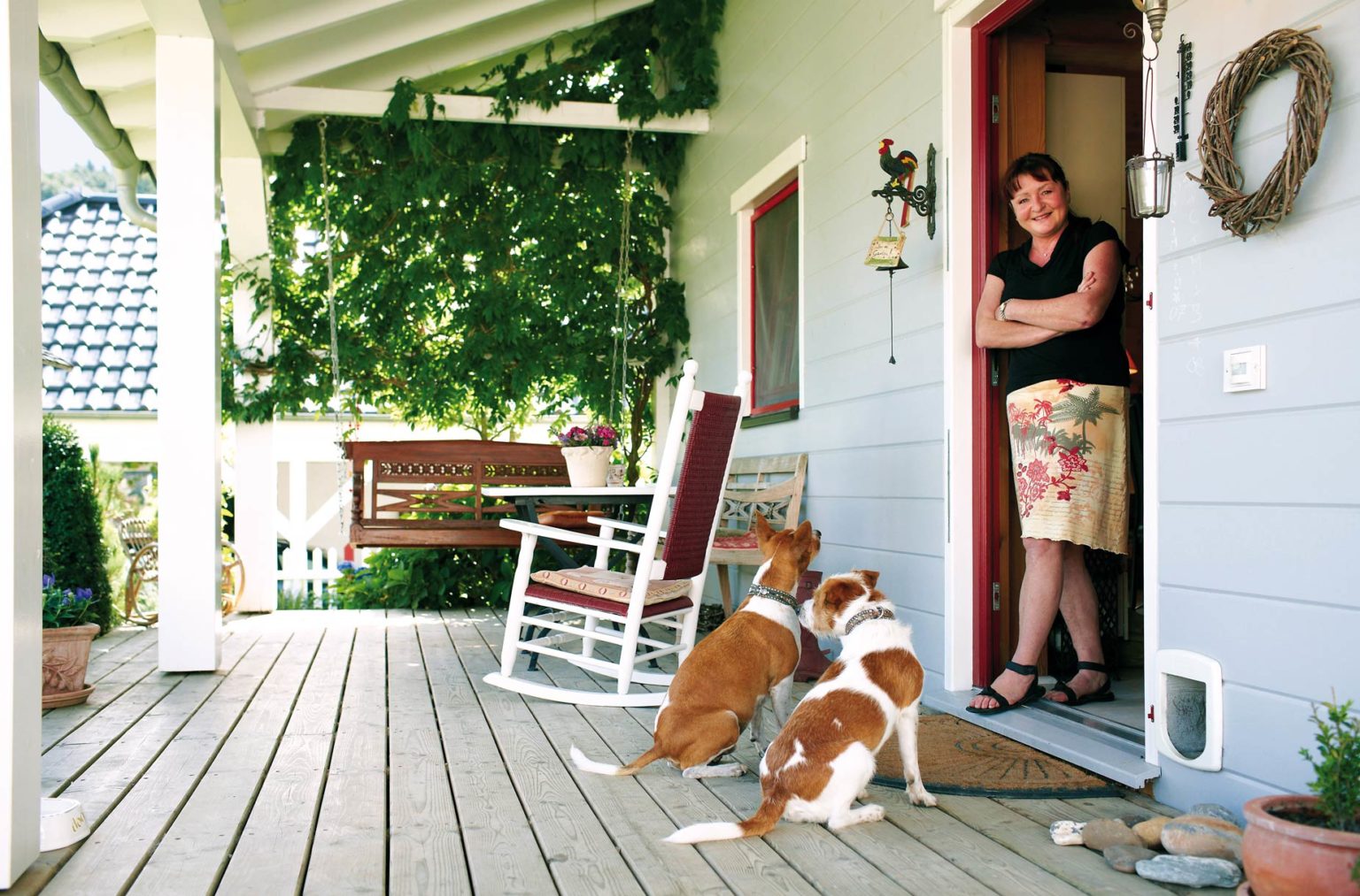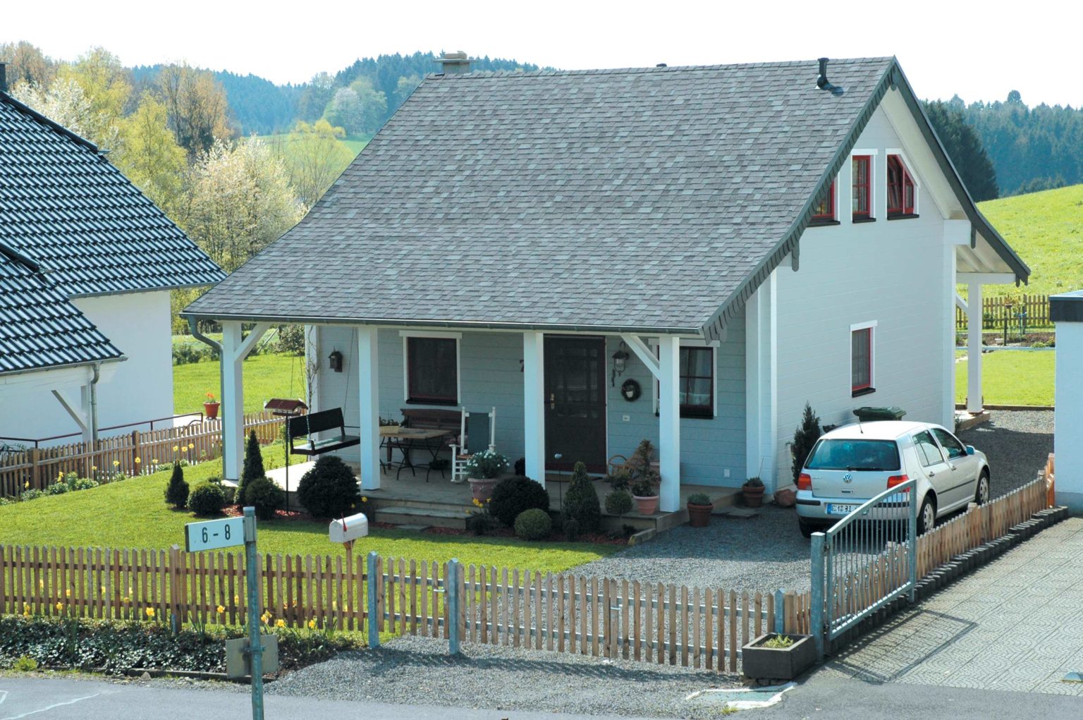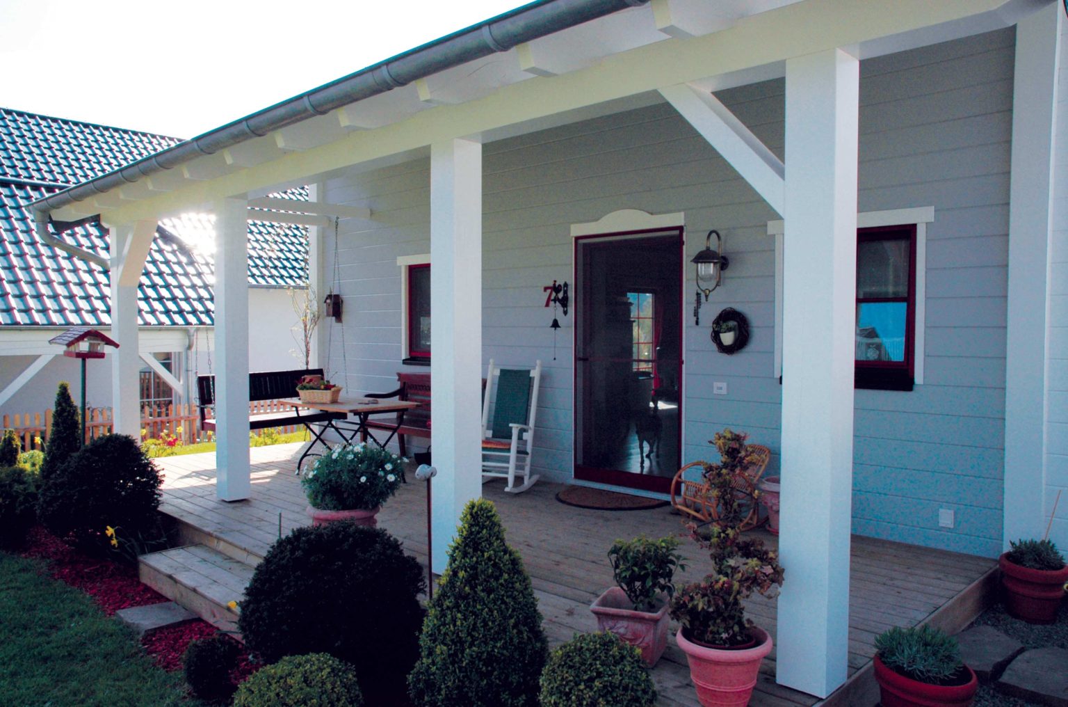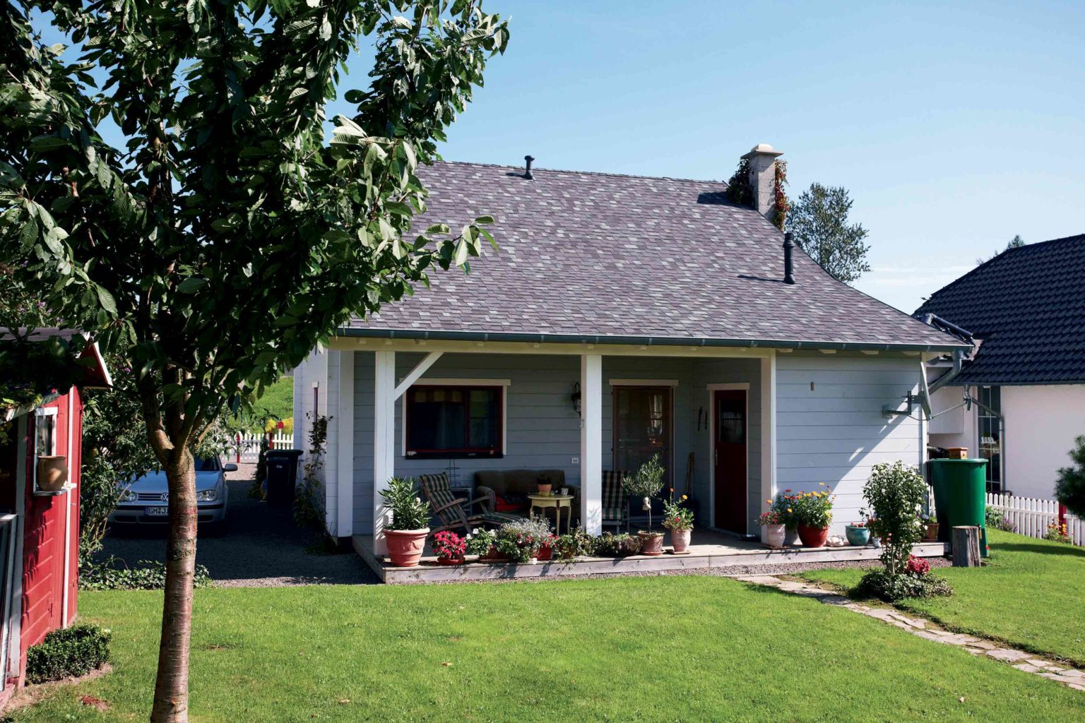 Das Design betont mit dem Außenkamin am Giebel, den Schindeln auf dem Dach und den beiden Veranden vorne am massiven Holzhaus und rückseitig dezent den amerikanischen Stil. Das Holzhaus Singleglück fügt sich unaufdringlich in die regionale Bebauung ein. In Amerika werden gerne Hölzer wie Red Cedar, White Cedar, Douglasie oder Weymouth-Kiefer verbaut, hierzulande trotzt meistens die feste nordische Kiefer Wind und Wetter - auch beim "Holzhaus Singleglück". Der deutsche Hersteller Fullwood realisierte den "kleinen" Holzhaus Traum der Baufrau im Bergischen Land. Sie hat die Holzhaus Fassade bewusst nicht gestrichen, um den Charme des kleinen Traumes durch die natürliche silbrige Patina mit den Jahren noch zu vergrößern.