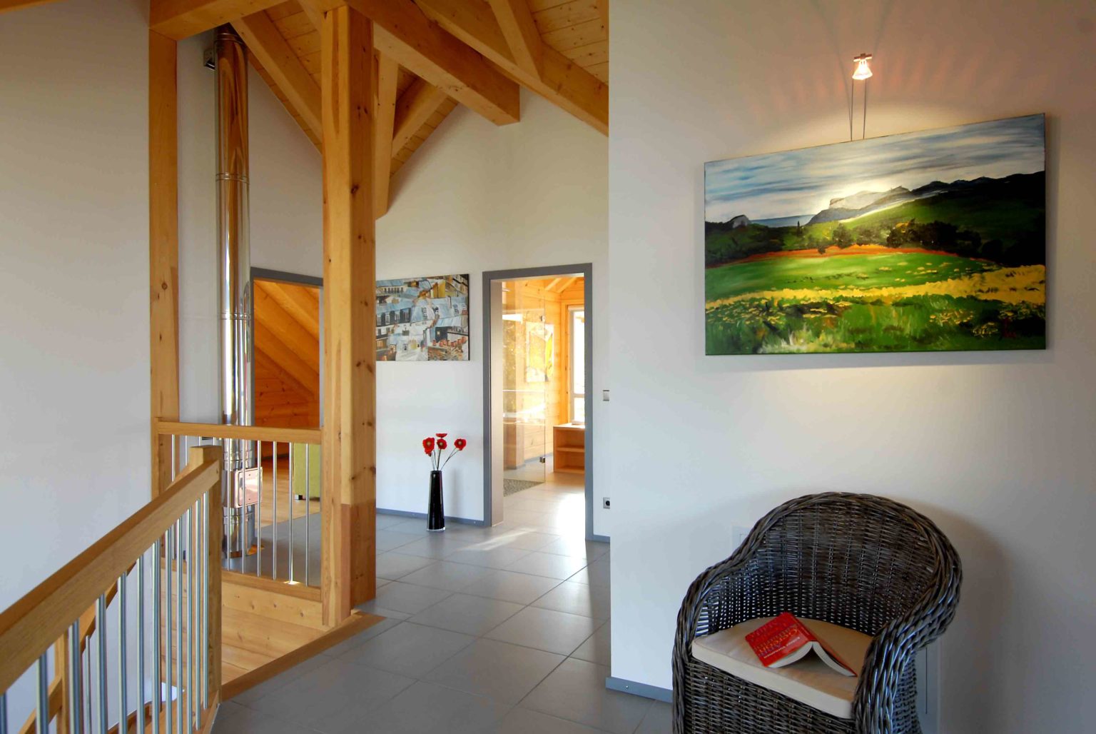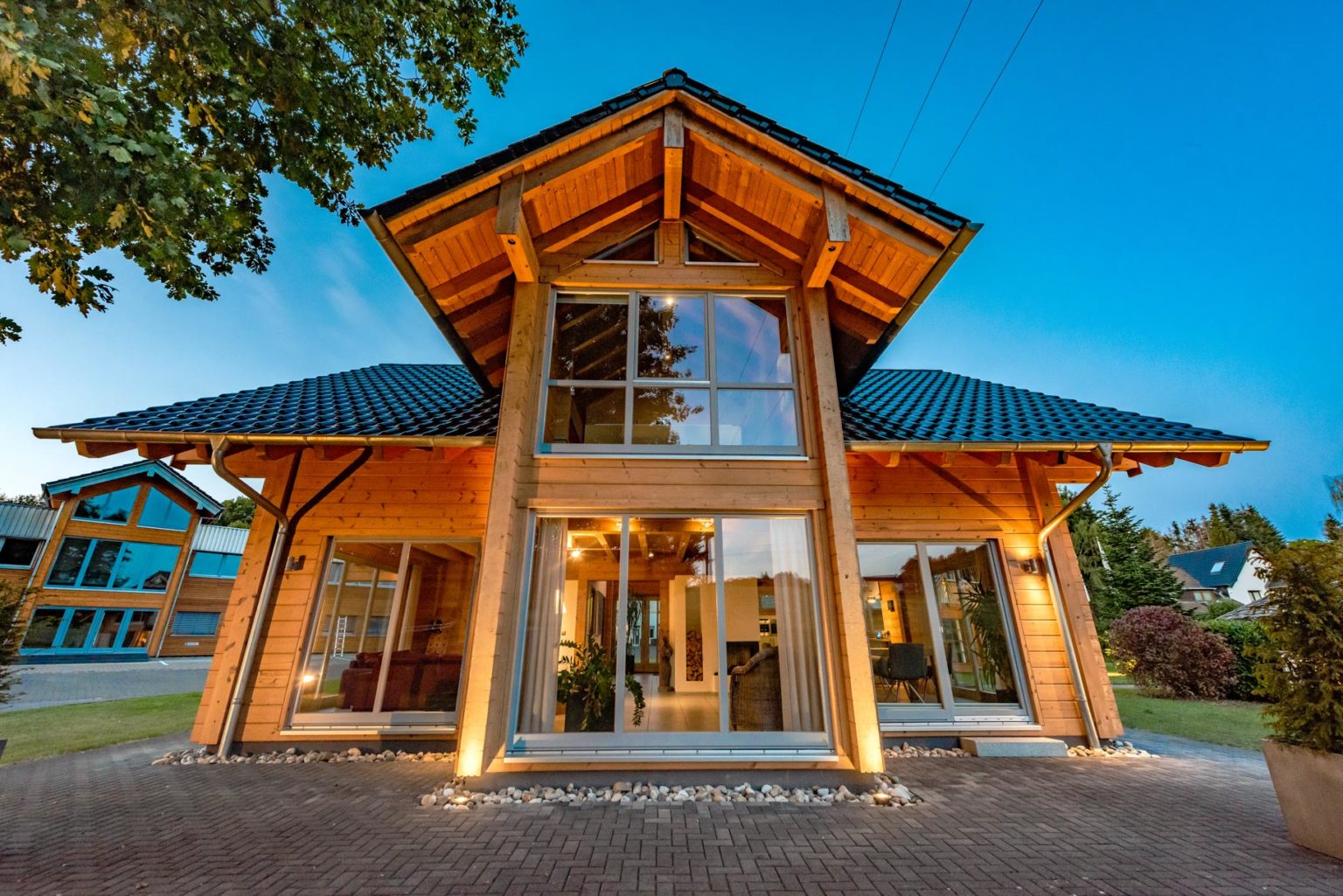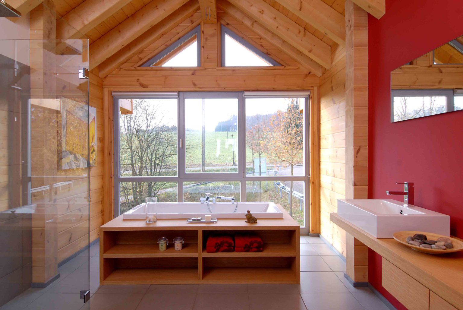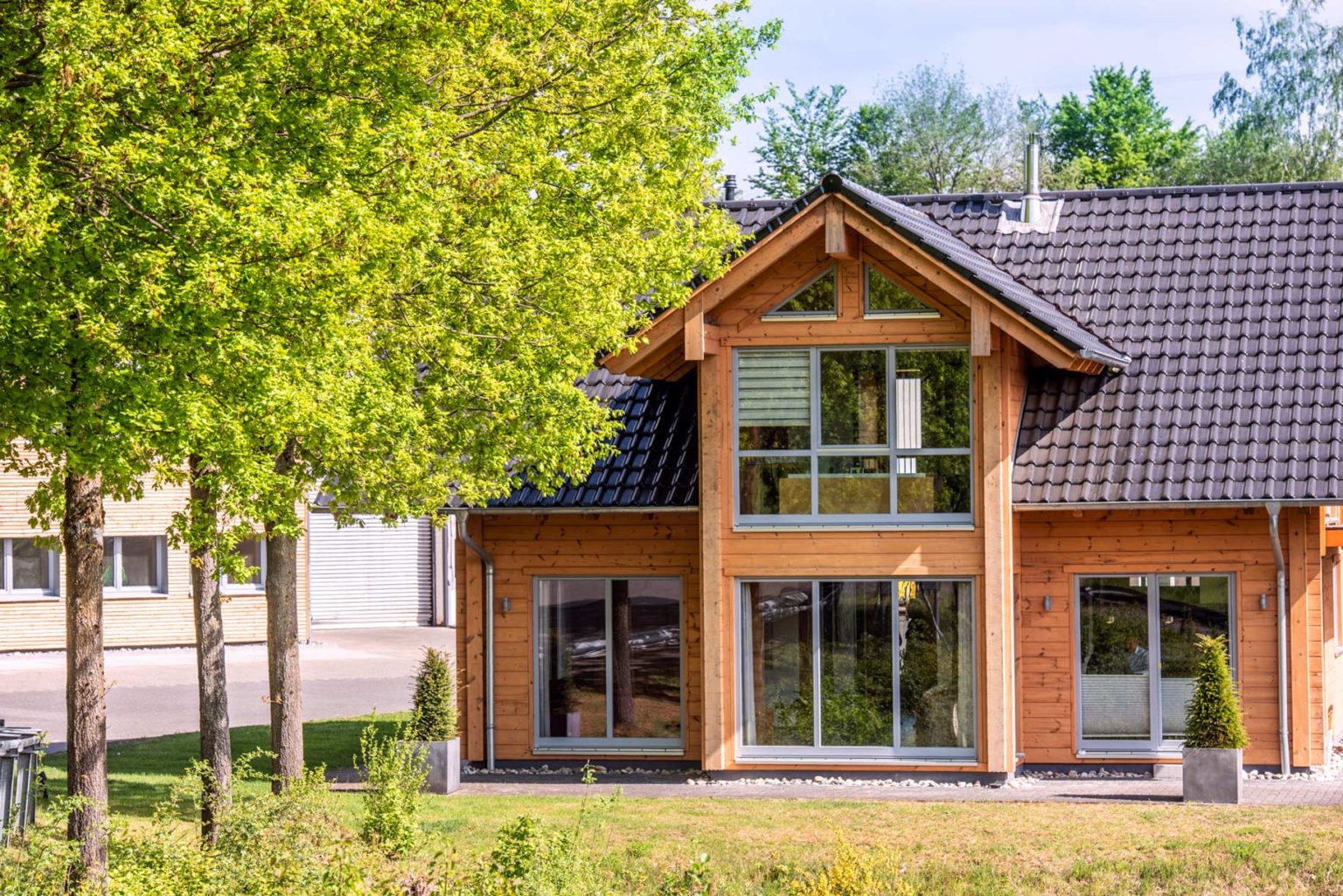 Hinter seinem frontal und seitlich verglasten Giebel verbirgt dasmoderne Holzhaus im Erdgeschoss eine Leseecke. Darüber, im Obergeschoss, hat das Holzhaus ein Badezimmer mit bester Aussicht. Bodentiefe Fenster auf beiden Geschossen und Dreiecksfenster in den Giebeln sorgen für eine außergewöhnliche Ausleuchtung. Diese Modernität erklärt Offenheit nach allen Seiten und auf allen Ebenen. Ein Freisitz und eine Loggia gelten mitnichten als Luxus, bringen dem Holzhaus Bewohner Abwechslung und gestalten das Gebäude. Die Edelstahlgeländer an Balkon und Loggia des Holzhauses wirken sehr gefällig. Die Füllungen wurden elegant mit halbtransparenten Scheiben ausstaffiert. Die in edlem lichtgrauem Farbton schimmernden Holzfensterrahmen führen diese Strategie fort und setzen sich ohne Härte harmonisch von der leuchtend gelben Fassade ab.