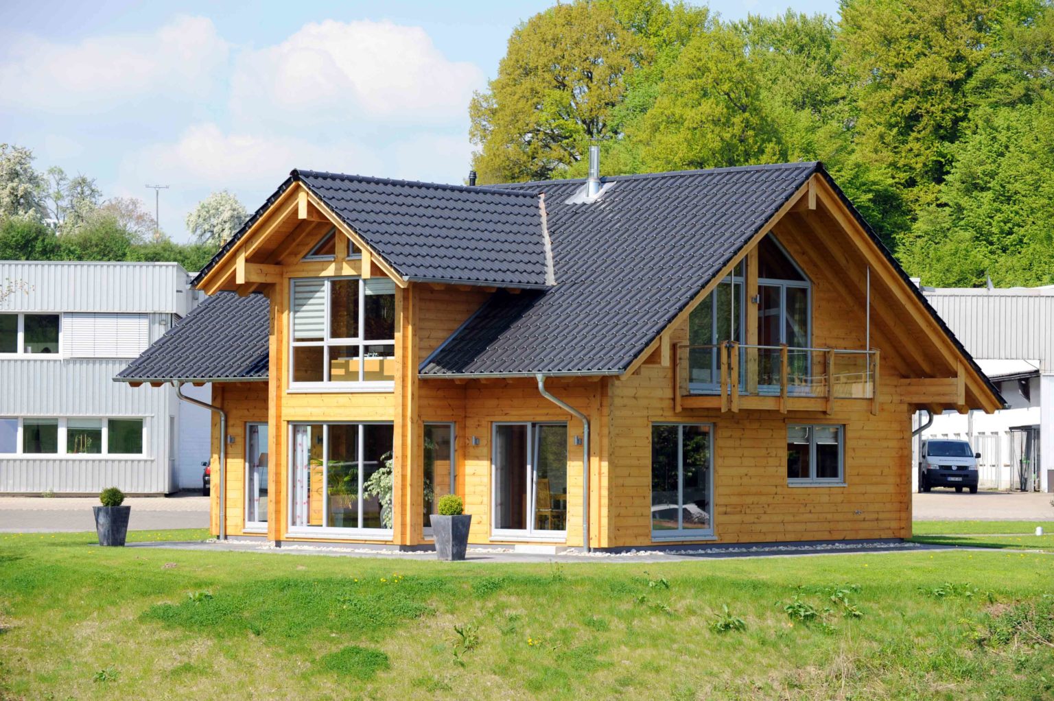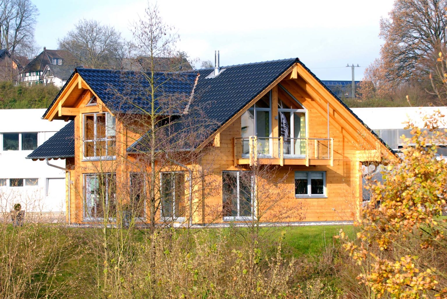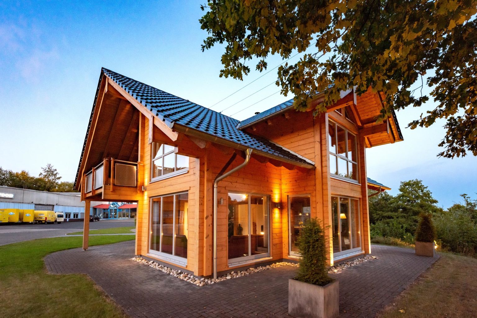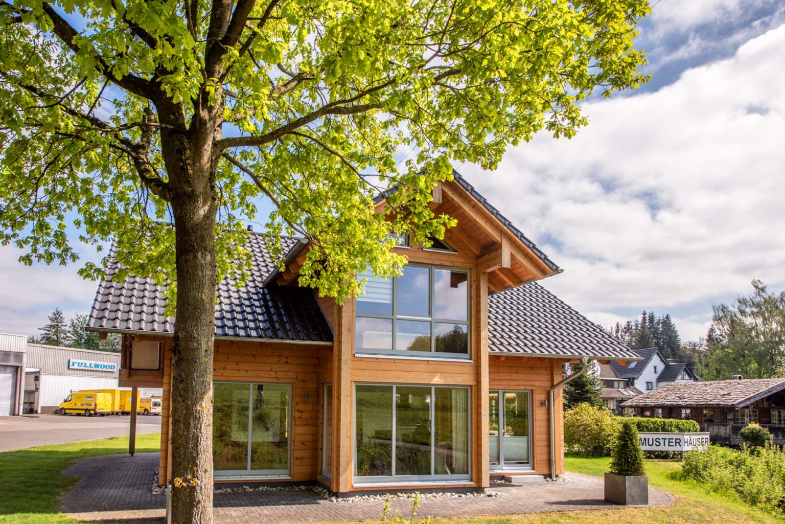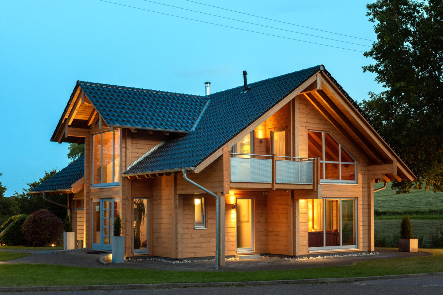 Hinter seinem frontal und seitlich verglasten Giebel verbirgt dasmoderne Holzhaus im Erdgeschoss eine Leseecke. Darüber, im Obergeschoss, hat das Holzhaus ein Badezimmer mit bester Aussicht. Bodentiefe Fenster auf beiden Geschossen und Dreiecksfenster in den Giebeln sorgen für eine außergewöhnliche Ausleuchtung. Diese Modernität erklärt Offenheit nach allen Seiten und auf allen Ebenen. Ein Freisitz und eine Loggia gelten mitnichten als Luxus, bringen dem Holzhaus Bewohner Abwechslung und gestalten das Gebäude. Die Edelstahlgeländer an Balkon und Loggia des Holzhauses wirken sehr gefällig. Die Füllungen wurden elegant mit halbtransparenten Scheiben ausstaffiert. Die in edlem lichtgrauem Farbton schimmernden Holzfensterrahmen führen diese Strategie fort und setzen sich ohne Härte harmonisch von der leuchtend gelben Fassade ab.