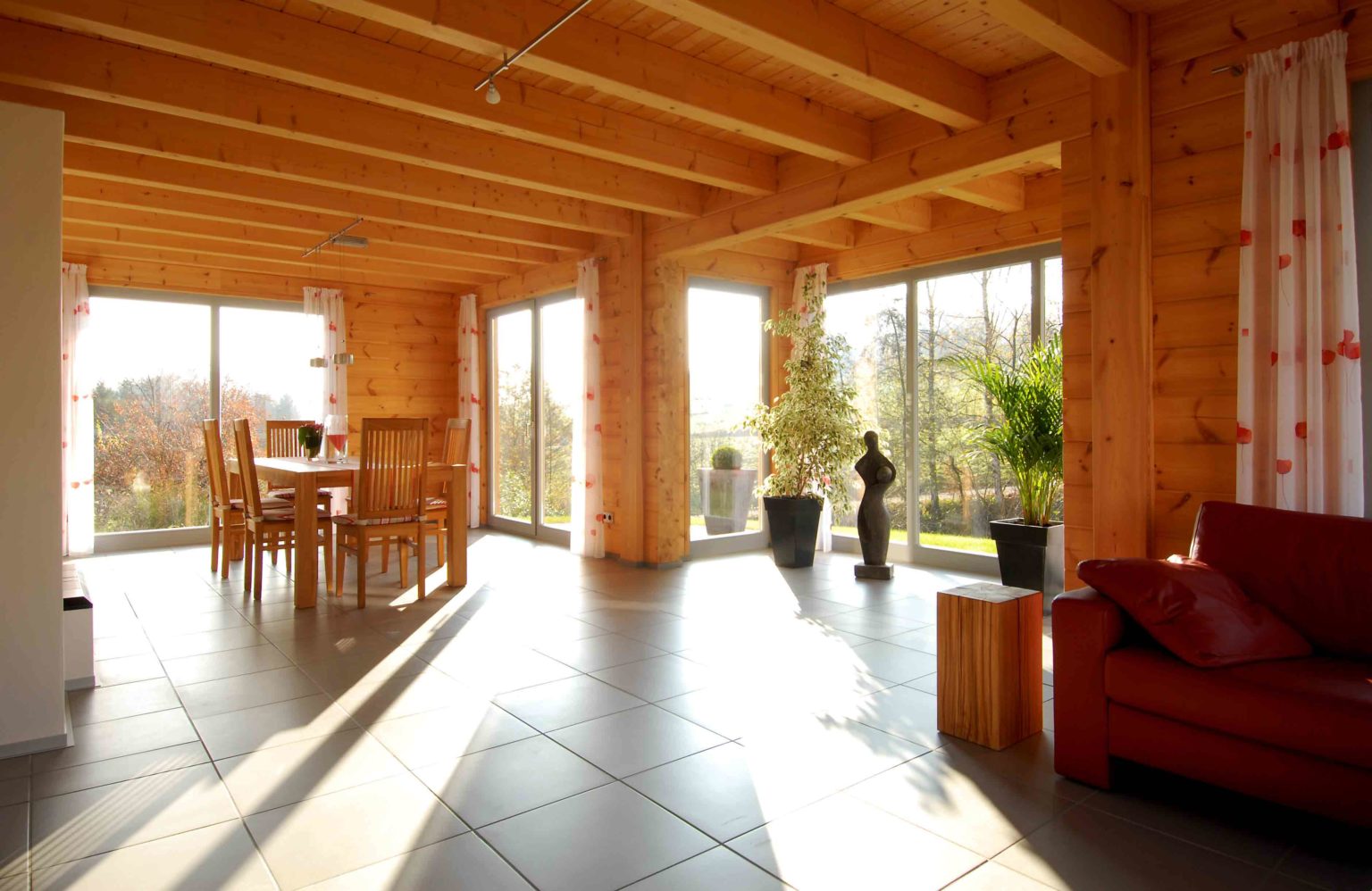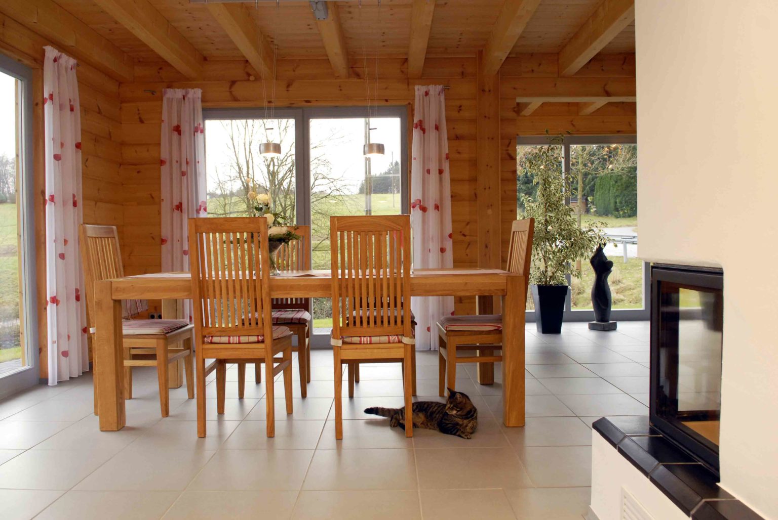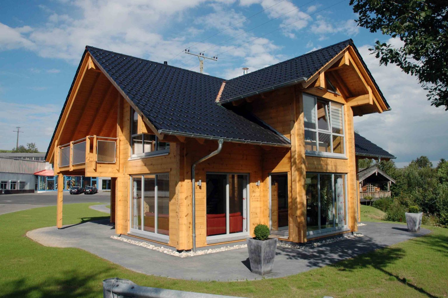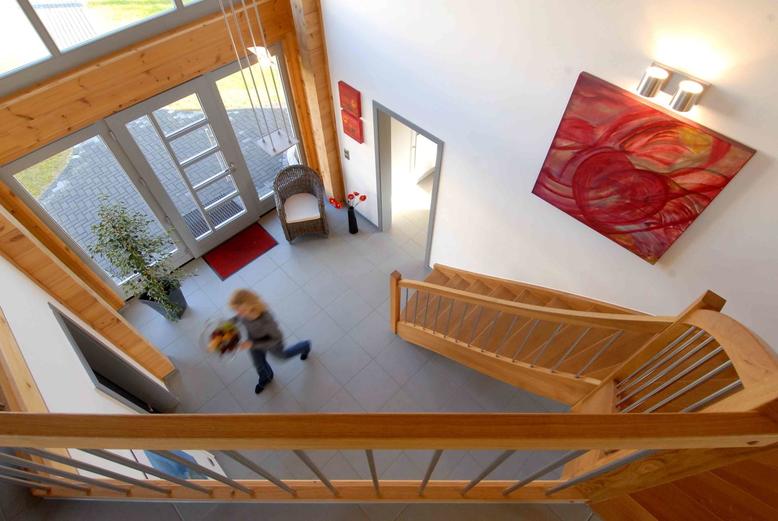 Hinter seinem frontal und seitlich verglasten Giebel verbirgt dasmoderne Holzhaus im Erdgeschoss eine Leseecke. Darüber, im Obergeschoss, hat das Holzhaus ein Badezimmer mit bester Aussicht. Bodentiefe Fenster auf beiden Geschossen und Dreiecksfenster in den Giebeln sorgen für eine außergewöhnliche Ausleuchtung. Diese Modernität erklärt Offenheit nach allen Seiten und auf allen Ebenen. Ein Freisitz und eine Loggia gelten mitnichten als Luxus, bringen dem Holzhaus Bewohner Abwechslung und gestalten das Gebäude. Die Edelstahlgeländer an Balkon und Loggia des Holzhauses wirken sehr gefällig. Die Füllungen wurden elegant mit halbtransparenten Scheiben ausstaffiert. Die in edlem lichtgrauem Farbton schimmernden Holzfensterrahmen führen diese Strategie fort und setzen sich ohne Härte harmonisch von der leuchtend gelben Fassade ab.