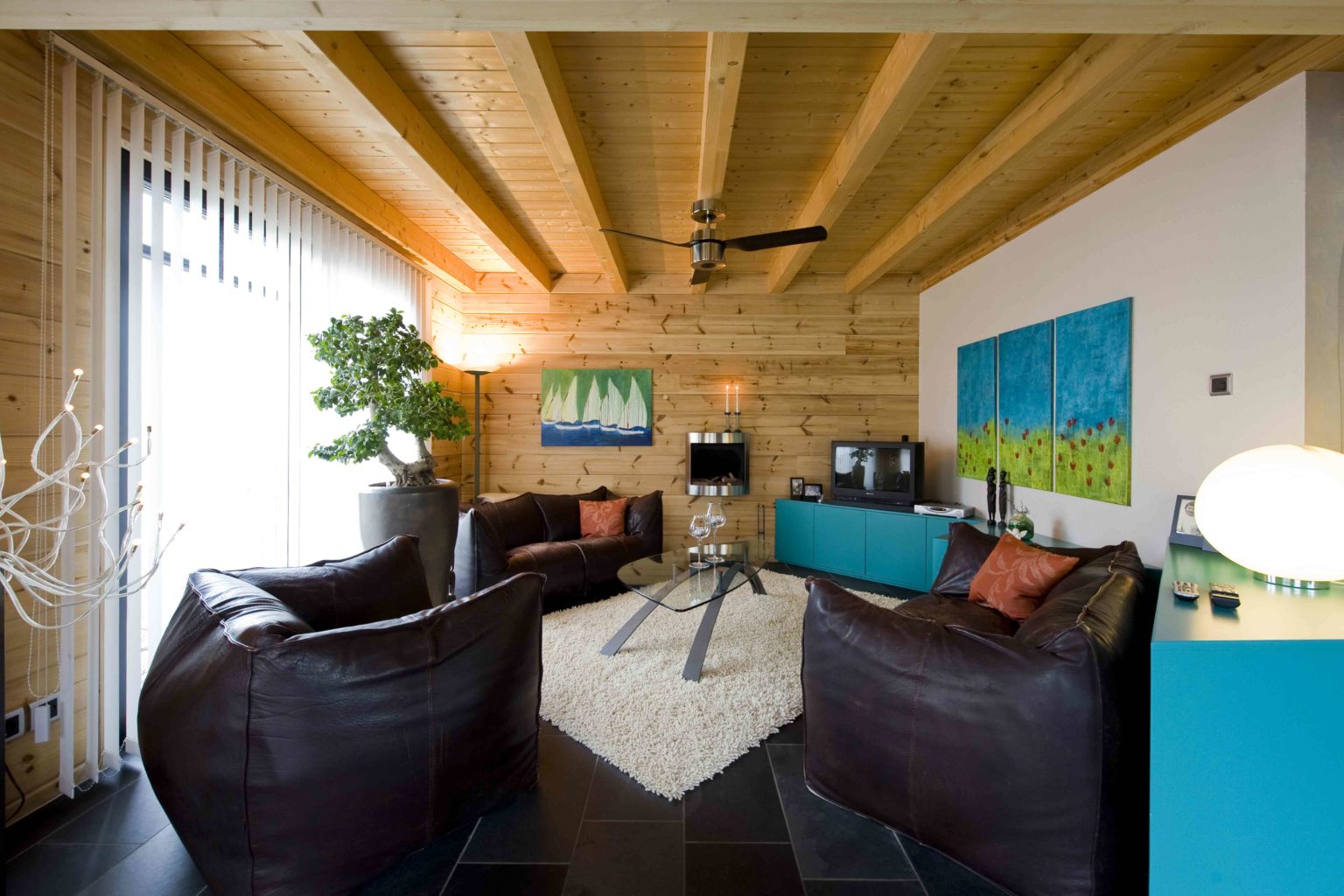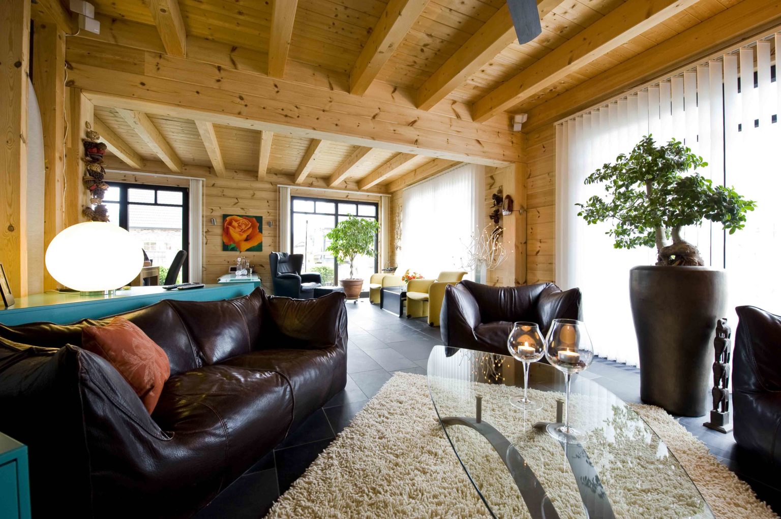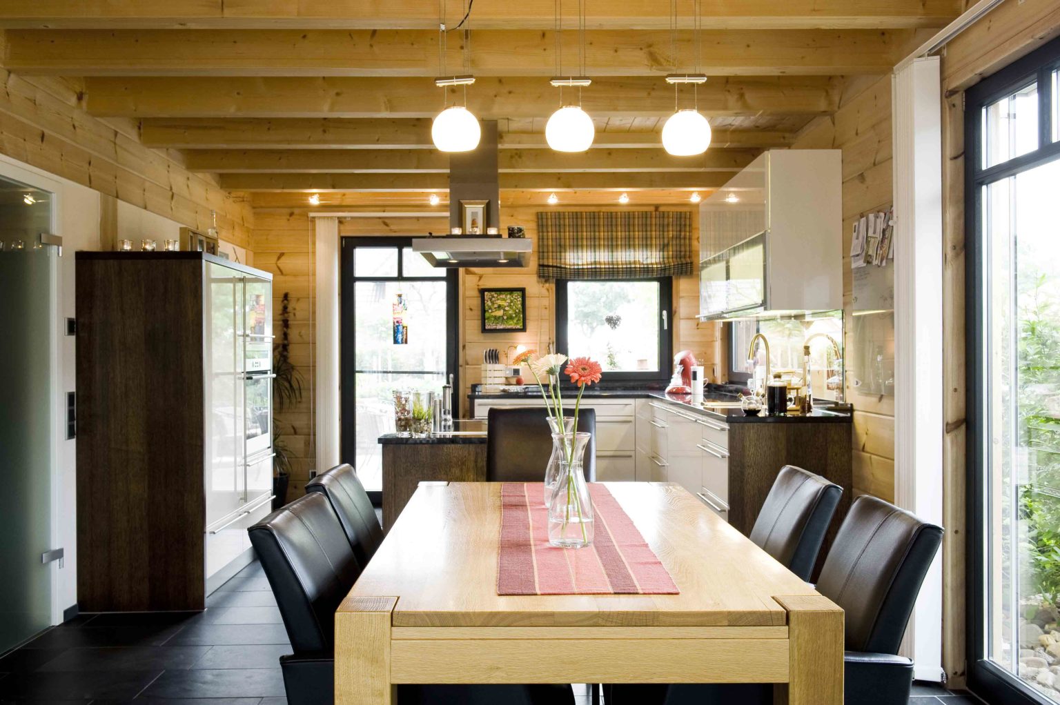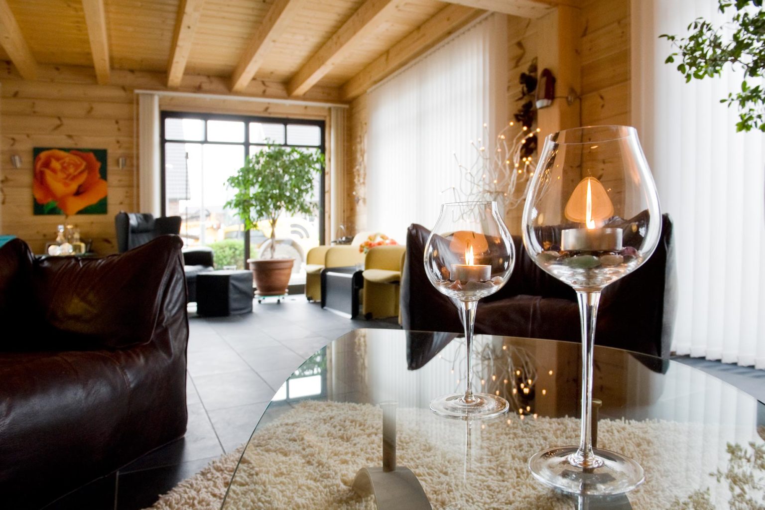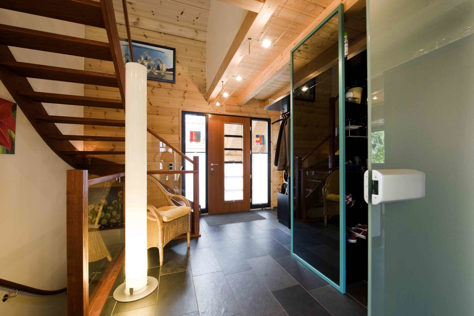 Einen zeitlos-schicken, schnörkellosen und luftig-hellen Eindruck erhält man schon beim Eintritt in die repräsentative, großzügige Diele, die sich bis zum First offen nach oben erstreckt. Hinauf ins Dachgeschoss führt eine elegante Treppe aus Esche und Glas, deren Transparenz dem Raum optisch keinen Platz wegnimmt. Entlang einer weiß gestrichenen Ständerbau-Trennwand schwingt sie sich hoch. Von der Diele gelangt man außerdem ins Gäste-WC und, durch eine doppel-flügelige Milchglastüre, in den offenen Wohnbereich. Dort empfängt den Eintretenden die moderne Edelküche mit angeschlossenem einladenden Essbereich. Als Spritzschutz entschied man sich für Glas, das einfach vor die Holzwand gesetzt wurde, und so den Holzcharakter erhält. Um die Ecke befindet sich die gemütliche Sofaecke. Von der Hausherrin selbst gemalte Kunstwerke korrespondieren farblich mit dem Mobiliar oder setzen eigene Farbakzente an die Holzwände. Zwei große Sessel beschreiben eine Leseecke zwischen bodentiefen Fenstern. Möbel und große Pflanzen, sowie stehende Lichtobjekte gliedern den weitläufigen Wohnbereich in gemütliche Bereiche. Weiß gestrichene Ständer-Trennwände bringen zusätzliche Helligkeit. Auch wenn das Tageslicht der Nacht weicht, wollen Paul und Ilona ein schön beleuchtetes Heim: Licht als schmückendes und verschiedene Stimmungen hervorrufendes Element ist überall im Holzhaus zu finden.