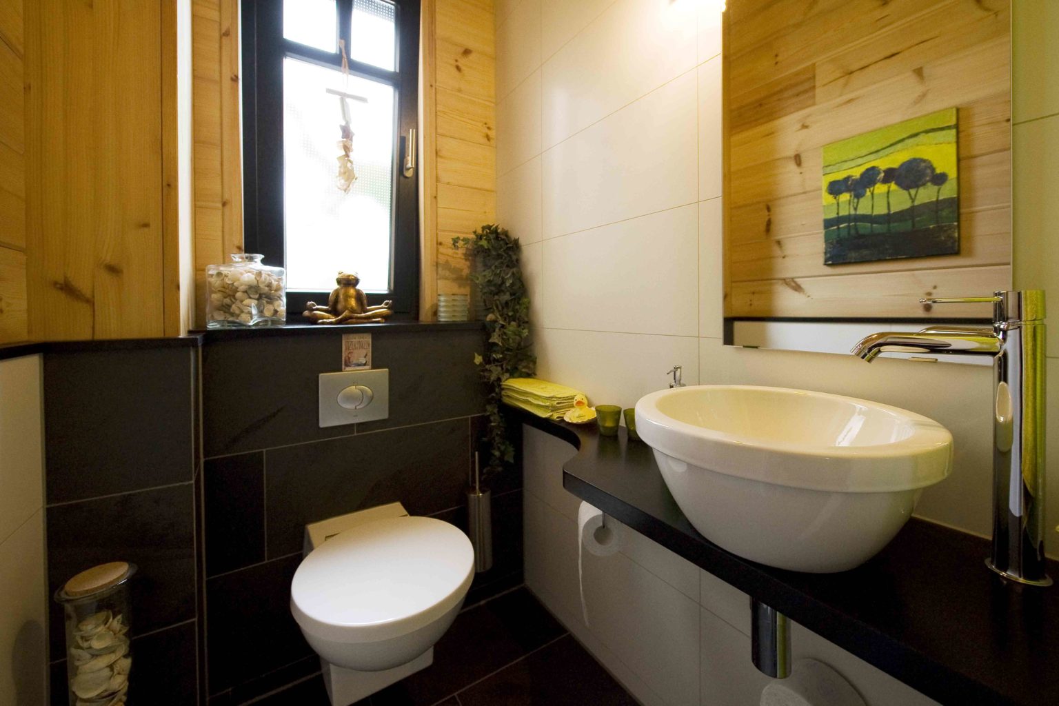 Ermutigt durch die unkomplizierte Montage der im Werk vorgefertigten Wände aus dreifach verleimter nordischer Kiefer, entschied man sich für eine sogenannte Richtmeistermontage, bei der Bauherren ihr Holzhaus unter der Regie eines Richtmeisters selbst bauen können. Dank der fleißigen Mithilfe von Freunden und Familie stand das Holzhaus nach nur einer Woche fertig mit Fenstern, Türen und eingedecktem Dach da. „Während der Bauphase hatten wir hier regelrechten Baustellentourismus, da es in der Gegend sonst kein einziges Holzhaus gab“, erinnert sich Paul lachend. Auch den Innenausbau tätigte der Hausherr zusammen mit seinem Onkel selbst. Hauptsächlich Naturmaterialien, wie sehr dunklen Schiefer (für die Fußböden), kombinierte das Paar geschickt zu den hellen Naturholzwänden, die innen lediglich einen UV-Schutzanstrich bekamen.