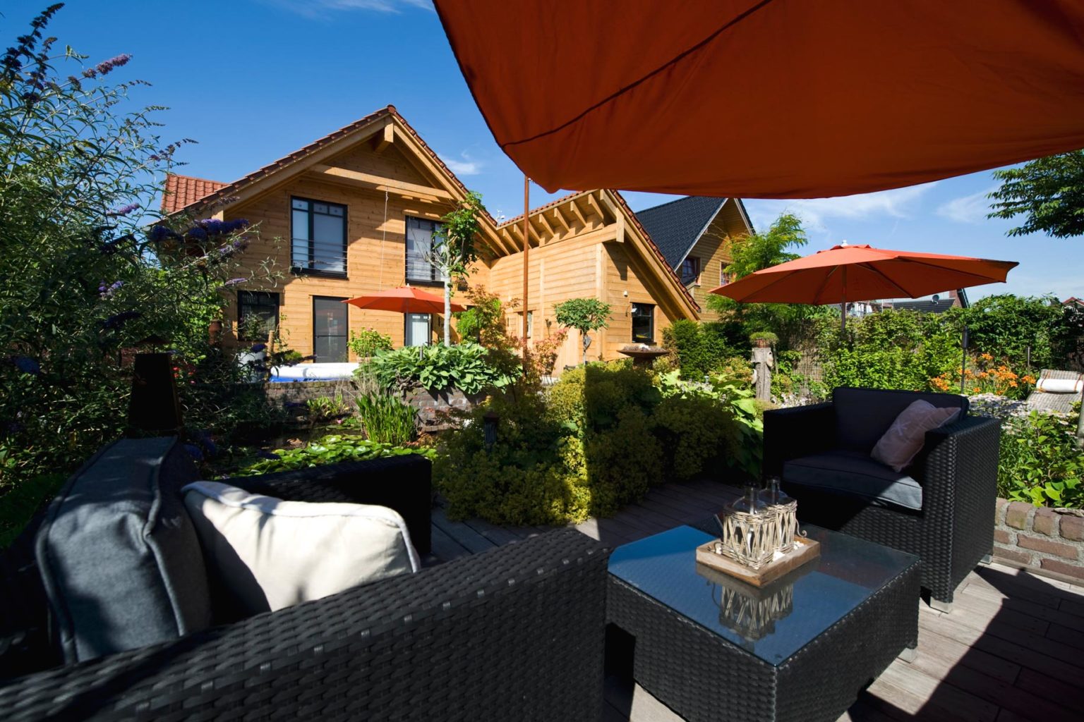 Raffstores, die in flachen, schlichten Kästen ruhen, werden bei Bedarf an Süd- und Westseite des Holzhauses herunter gelassen. Die massiven Wände aus Nordischer Kiefer bilden die perfekte Grundlage für eine moderne Fassadengestaltung. So wählten Paul und Ilona schwarze Fensterrahmen und kombinierten mit hellgrauen Raffstorekästen und Fenstergeländern aus Edelstahlrohren. Damit alles so hell bleibt, bekamen die Außenwände von Holzhaus „Sonnengarten“ einen speziellen Schutzanstrich gegen Nachdunkelung und UV-Bestrahlung. Erkervorbauten wünschten sich die Holzhaus Besitzer nicht, wohl aber eine klassische Dachgaube an der Südseite, die zusätzlichen Platz und Licht ins ausgebaute Dachgeschoss bringt. Wichtig war ihnen das angeschlossene Garten- und Gerätehäuschen, welches sich an das Wohngebäude fügt und eine Art Hofsituation zum Garten, genauer gesagt zur Terrasse, hin eröffnet. Der von den Bewohnern traumhaft angelegte Garten stellt die Fortsetzung vom Holzhaus zu einem stylischen Wohn-, Schlaf- und Esszimmer im Grünen dar. Verschiedene Sitz- und „Lümmel“-gruppen, teils unter Sonnensegeln, laden in verschiedenen „Garten-Zimmern“ ein.