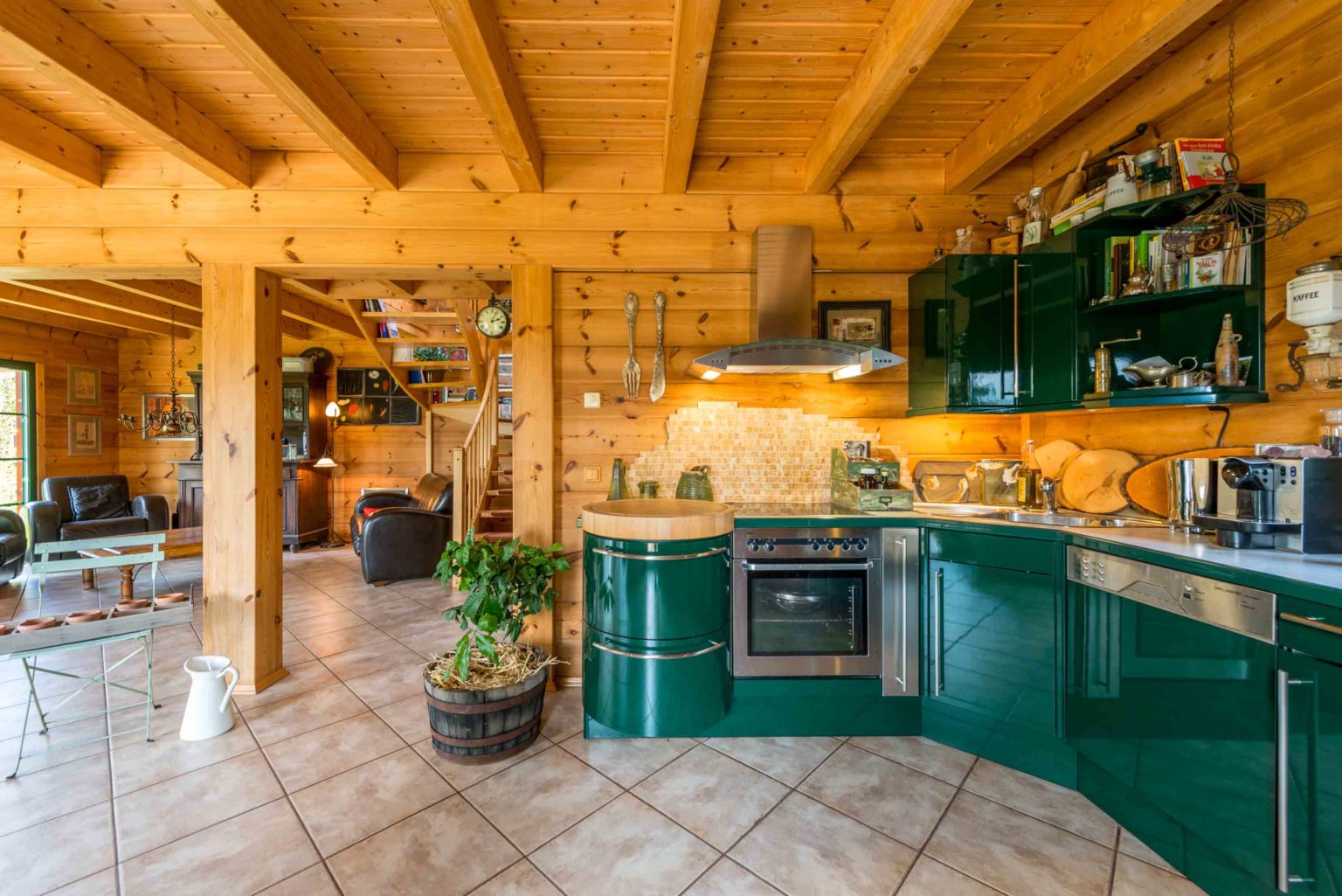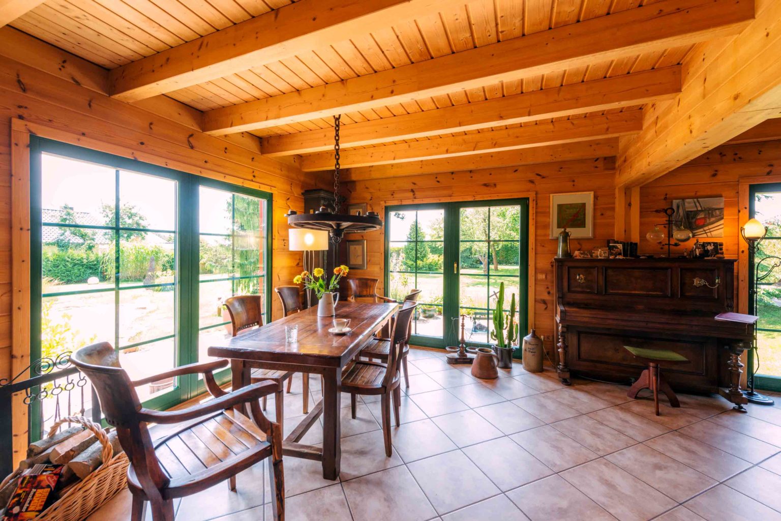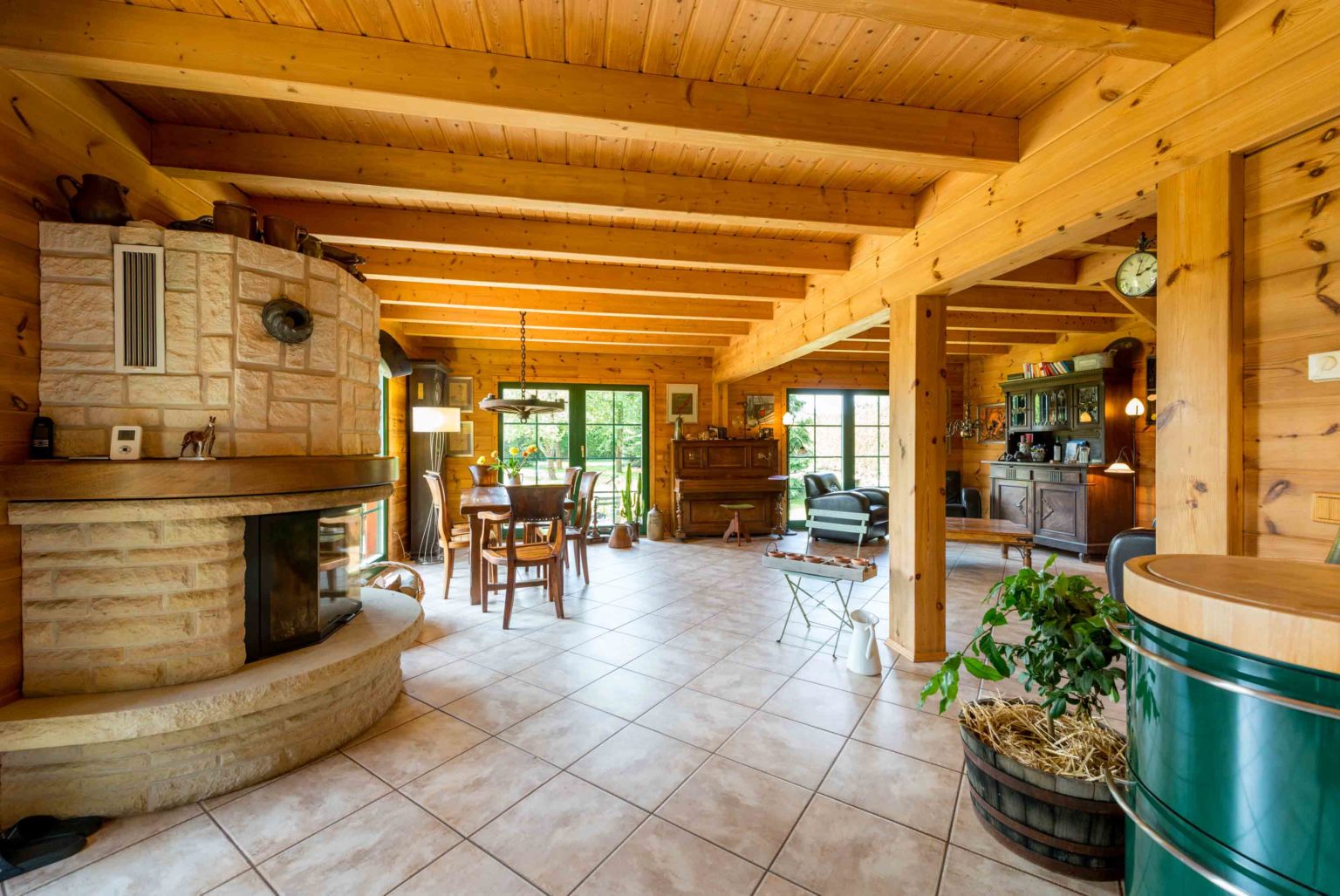 Die Außenwände ließen die Schützlers im Farbton „Pinie“ anstreichen, während die Innenwände unbehandelt blieben und im Laufe der Zeit nachgedunkelt sind. Zu den warmen Brauntönen wählten sie tannengrüne Sprossenfenster und Haustüre, sowie farbliche entsprechende Dachziegel aus Ton. Auch drinnen setzt sich das Farbkonzept fort: die zum Wohnbereich offene Küche ist dunkelgrün möbliert, die Bodenfliesen – überall einheitlich verlegt – in hellem beige-braun gehalten, das Mobiliar aus Holz und Leder in dunkelbraunen Farbtönen gewählt und die Geschosstreppe im gleichen Holzfarbton wie die Wände. Das Ambiente ist sehr wärmend, gemütlich und antik-ländlich, ohne aber in irgendeiner Weise als „drückend“ empfunden zu werden, trotz der offenen Balkendecke. Die Fläche ist einfach zu groß, als dass man sich eingeengt fühlte. Die Fußbodenheizung wird mit Gas betrieben – damals war das noch gang und gäbe. Glücklicherweise wird nicht viel Heizenergie benötigt, da die Holzwände gut dämmen, und die gefühlte Temperatur in Holzhäusern immer etwas höher ist als in Steinhäusern, wo sich die Wände meistens kalt anfühlen. Besonders gerne heizen die Schützlers mit ihrem imposanten Kaminofen, der mit Natursteinklinkern verkleidet im Wohnbereich thront, und dort seine Wärme ausstrahlt. Vom Sofa, vom Esstisch und aus der Küchenecke kann man durch seine große Glasscheibe in die lodernden Flammen blicken. Das Klima in ihrem Holzhaus empfinden die Bewohner als besonders behaglich und wohltuend, ganz so, wie sie es sich immer gewünscht hatten. Im Sommer genießt das Ehepaar seinen weitläufigen Garten und neuerdings auch den Naturteich mit kleinem Sandstrand. Wozu eigentlich noch in Urlaub fahren, fragt man sich als Außenstehender.