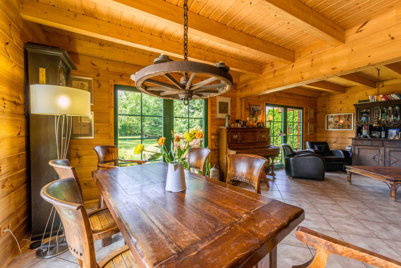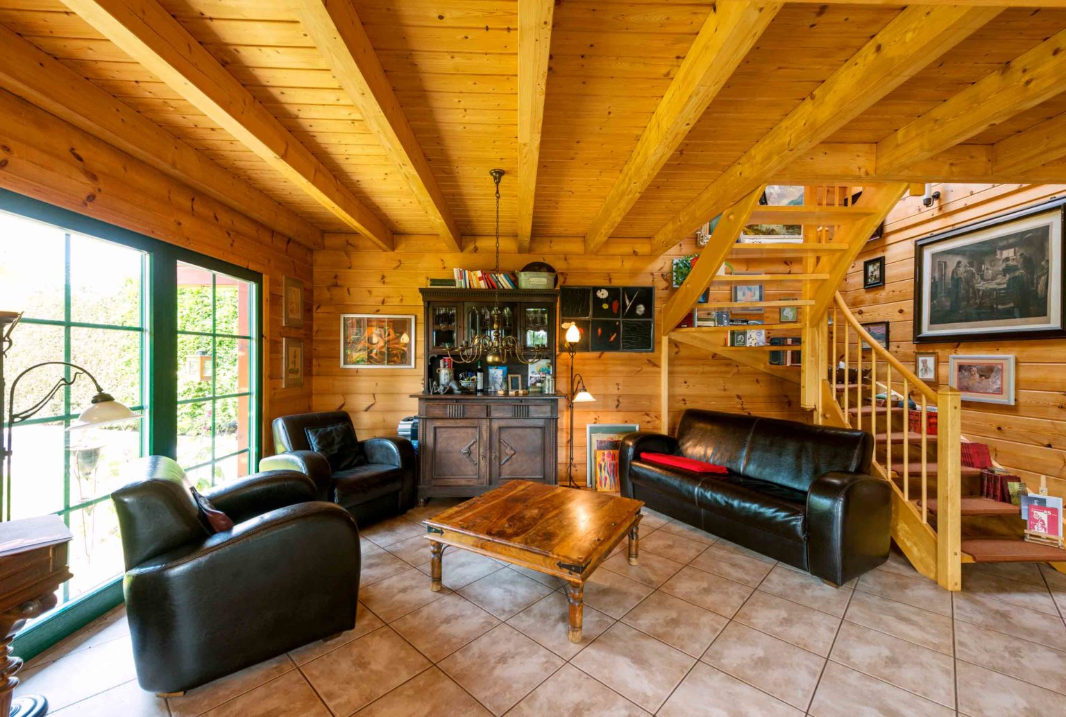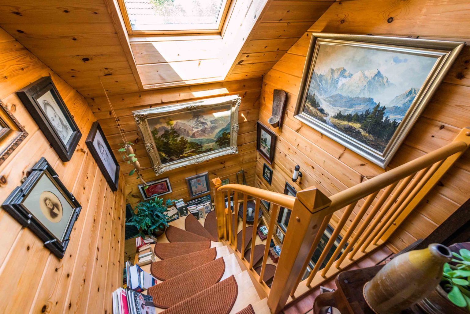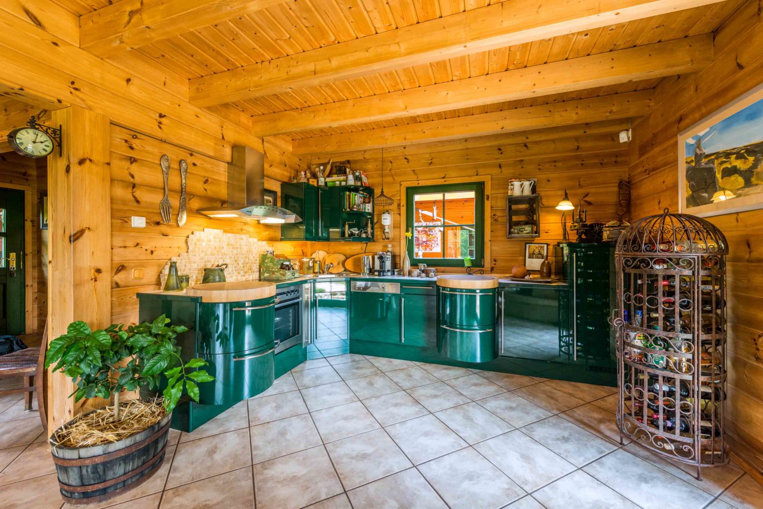 Die Außenwände ließen die Schützlers im Farbton „Pinie“ anstreichen, während die Innenwände unbehandelt blieben und im Laufe der Zeit nachgedunkelt sind. Zu den warmen Brauntönen wählten sie tannengrüne Sprossenfenster und Haustüre, sowie farbliche entsprechende Dachziegel aus Ton. Auch drinnen setzt sich das Farbkonzept fort: die zum Wohnbereich offene Küche ist dunkelgrün möbliert, die Bodenfliesen – überall einheitlich verlegt – in hellem beige-braun gehalten, das Mobiliar aus Holz und Leder in dunkelbraunen Farbtönen gewählt und die Geschosstreppe im gleichen Holzfarbton wie die Wände. Das Ambiente ist sehr wärmend, gemütlich und antik-ländlich, ohne aber in irgendeiner Weise als „drückend“ empfunden zu werden, trotz der offenen Balkendecke. Die Fläche ist einfach zu groß, als dass man sich eingeengt fühlte. Die Fußbodenheizung wird mit Gas betrieben – damals war das noch gang und gäbe. Glücklicherweise wird nicht viel Heizenergie benötigt, da die Holzwände gut dämmen, und die gefühlte Temperatur in Holzhäusern immer etwas höher ist als in Steinhäusern, wo sich die Wände meistens kalt anfühlen. Besonders gerne heizen die Schützlers mit ihrem imposanten Kaminofen, der mit Natursteinklinkern verkleidet im Wohnbereich thront, und dort seine Wärme ausstrahlt. Vom Sofa, vom Esstisch und aus der Küchenecke kann man durch seine große Glasscheibe in die lodernden Flammen blicken. Das Klima in ihrem Holzhaus empfinden die Bewohner als besonders behaglich und wohltuend, ganz so, wie sie es sich immer gewünscht hatten. Im Sommer genießt das Ehepaar seinen weitläufigen Garten und neuerdings auch den Naturteich mit kleinem Sandstrand. Wozu eigentlich noch in Urlaub fahren, fragt man sich als Außenstehender.