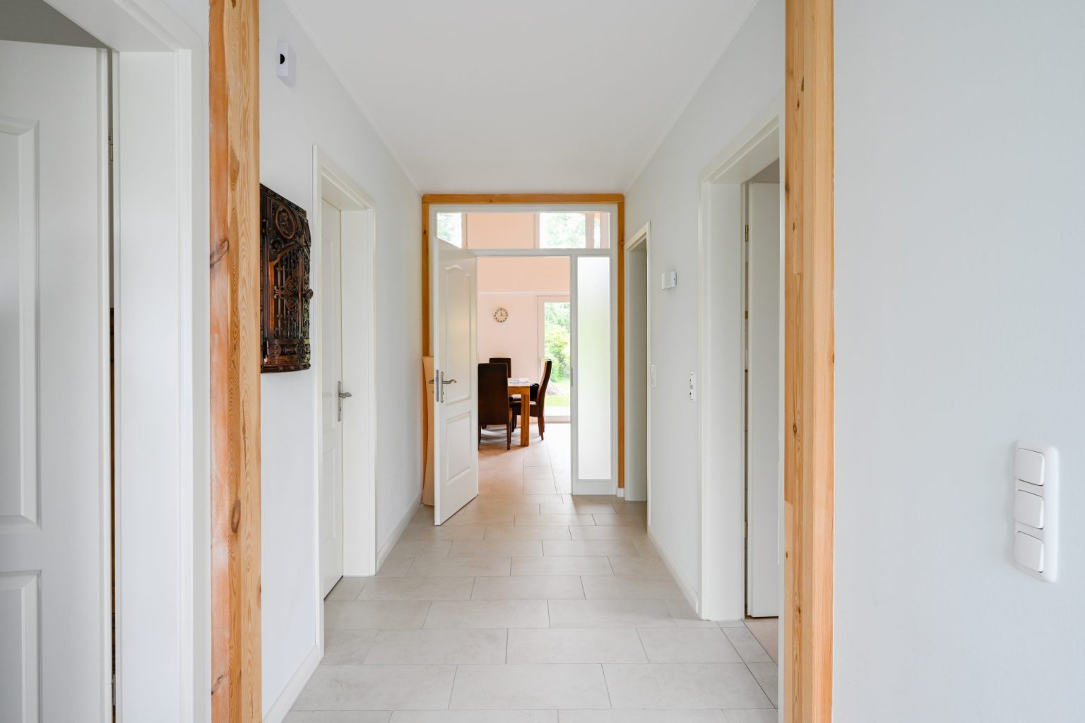 Im Haus wählte der Eigentümer Türen mit größerer Höhe als üblich, das passt schön zur Lichte der Räume (Türhöhe: 2,08m). Unterteilt ist Holzhaus „Sottrumer Klönschnack“ in einen offenen Wohnbereich mit Küche, Essbereich und Wohnzimmer, ein Schlafzimmer, ein Arbeitszimmer, ein Badezimmer und einen Hauswirtschaftsraum. Von letzterem führt die Klönschnack-Türe zum geschlossenen Carport, sodass man stets trockenen Fußes zwischen Haus und Auto pendelt und auf kurzem Weg Getränkekästen und Vorräte im Hauswirtschaftsraum verstauen kann. Die eigentliche Haustüre wird nur von Besuchern benutzt. Drinnen gehen alle Zimmer von der Diele ab, welche nicht bis zum First offen ist, sondern eine weiß gestrichene Decke besitzt, über der sich ein Dachboden befindet. Dort oben ist Abstellfläche, die der Hausherr gut brauchen kann.