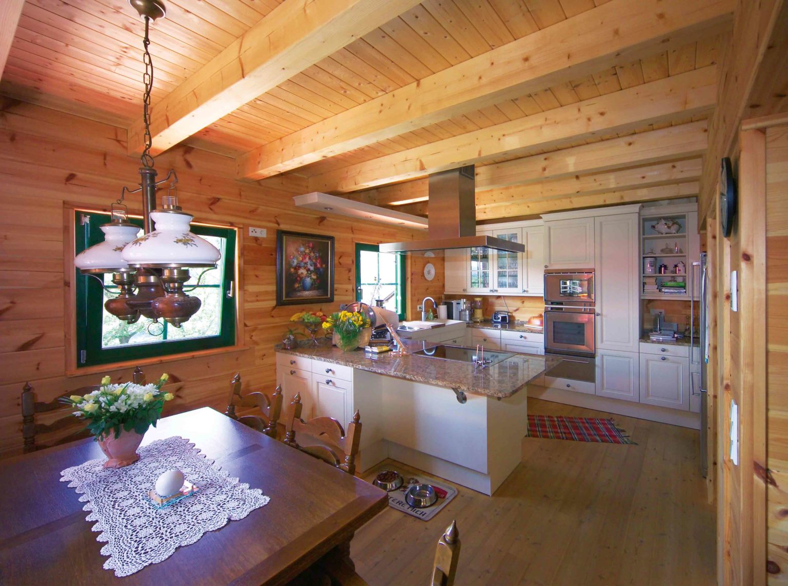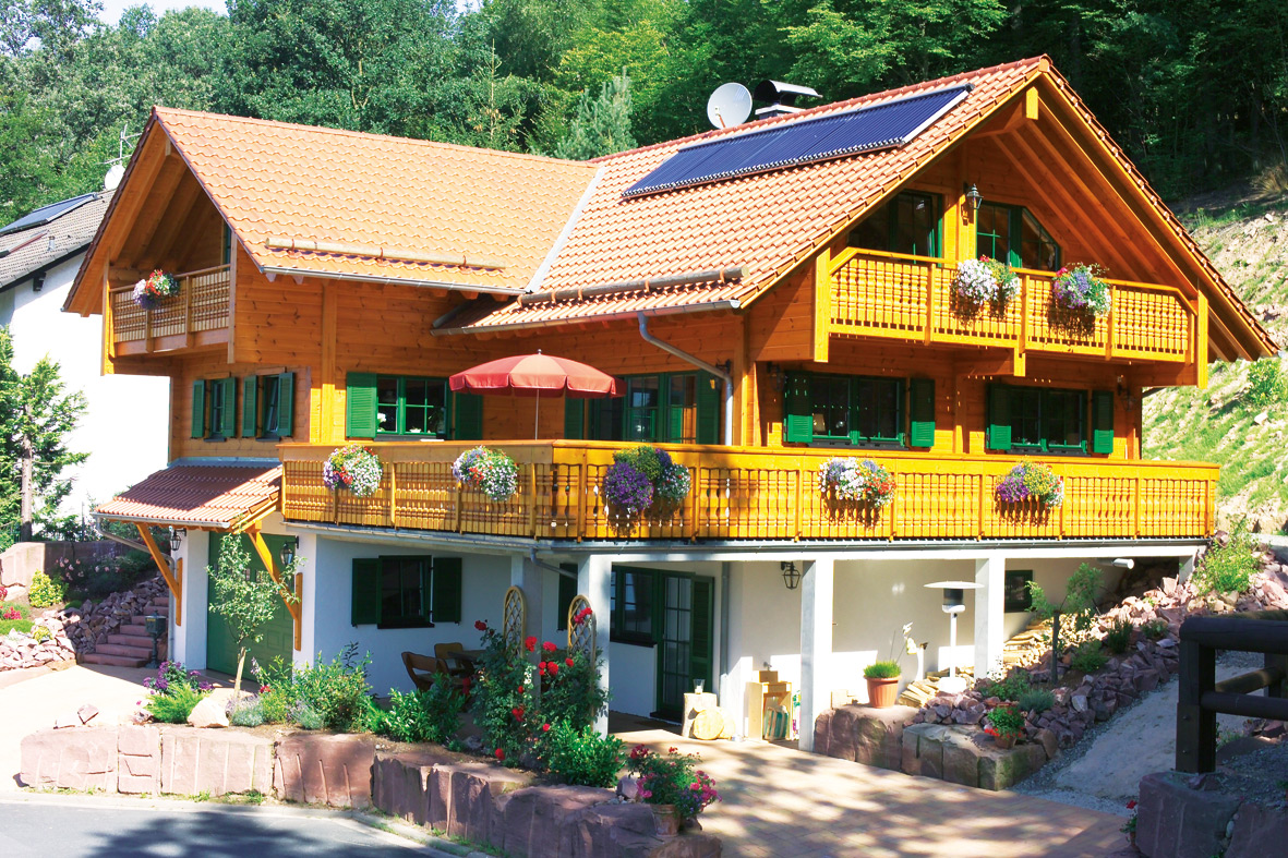 Klassische Holzhaus Architektur mit einer umlaufenden Terrasse mit geschnitzten Holzgeländern und zwei Giebelloggien. Grüne Sprossenfenster mit Klappläden fügen sich gut ins Holzhaus Bild.  So gestaltet, strahlt das Holzhaus "Spessart" schon nach außen Gemütlichkeit aus. Ein nicht zu verschwenderischer Umgang mit Glas sorgt im Holzhaus für eine wohltuende Atmosphäre. Die Holzhaus Innenräume werden gut belichtet, aber auch gegen Einblicke von außen abgeschirmt. Innerhalb des geborgenen Holzhaus Innenraums geht es offen und großzügig zu.  Der größte Teil der Erdgeschossfläche des Holzhauses wird vom Wohnbereich eingenommen. Ein geräumiger Essplatz in der Küche macht das Kochen zum geselligen Ereignis. Außerdem befindet sich im Holzhaus Erdgeschoss noch der Eingangsbereich mit Diele, Garberobe und Gäste-WC und ein Arbeitszimmer. Auch das Dachgeschoss des Holzhauses wurde mit großzügigem Federstrich geplant. Hier befinden sich ein großzügiges Kinderzimmer, ein Schlafzimmer mit begehbarem Schrank und ein komfortables Wohnbad.