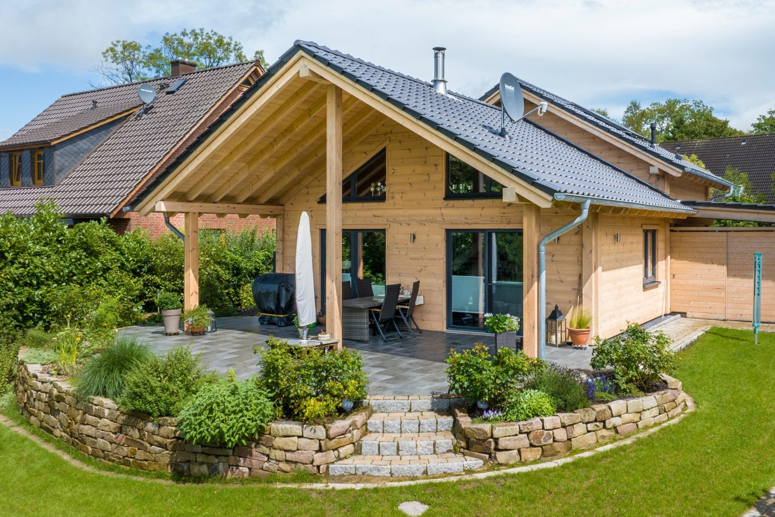 Holzhaus mit Gegenpolen, die sich ausgleichen