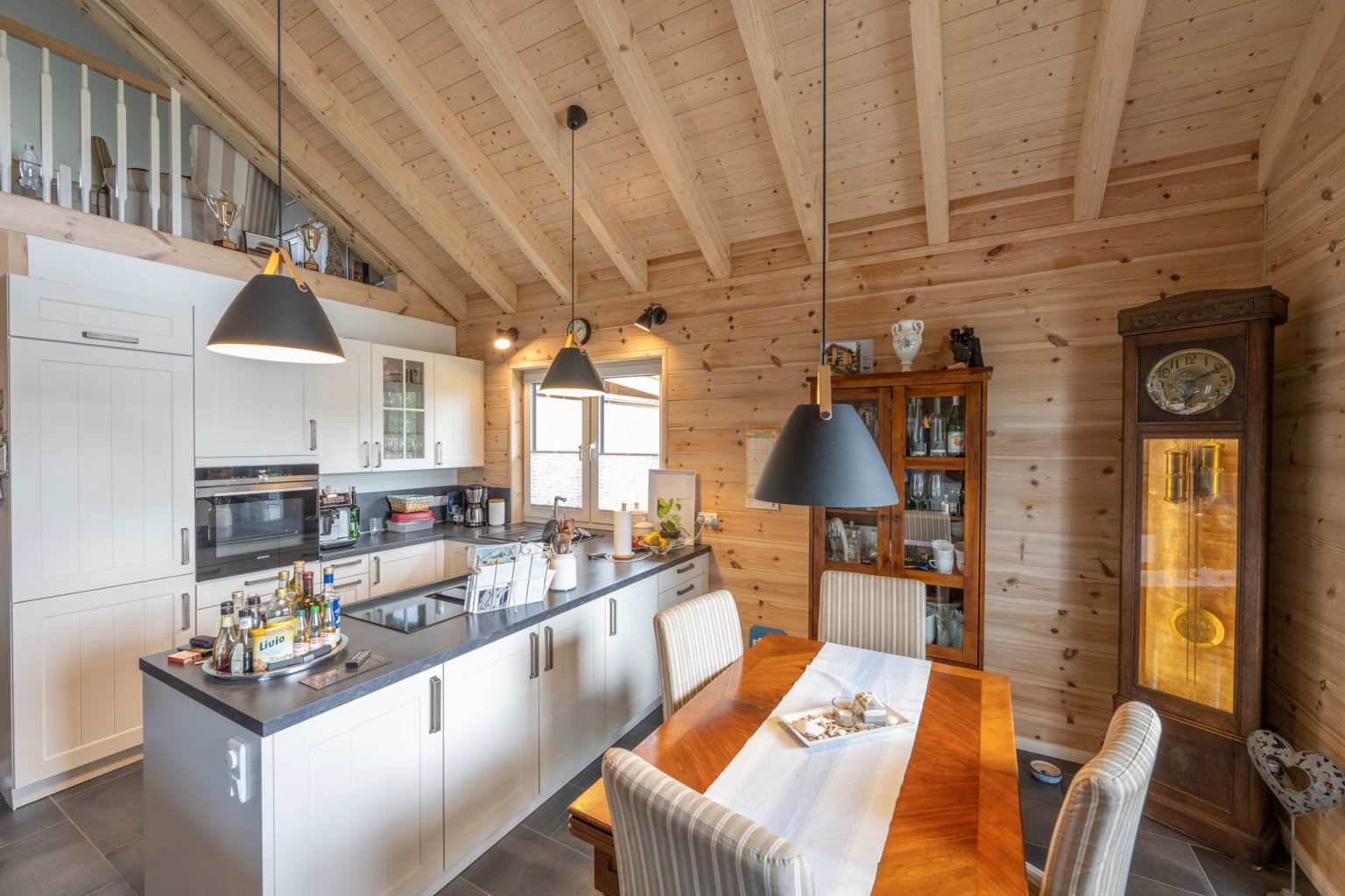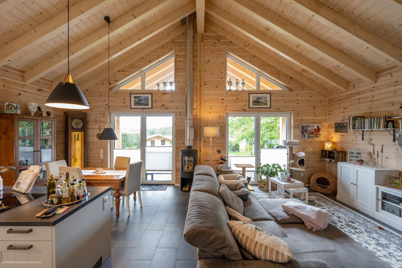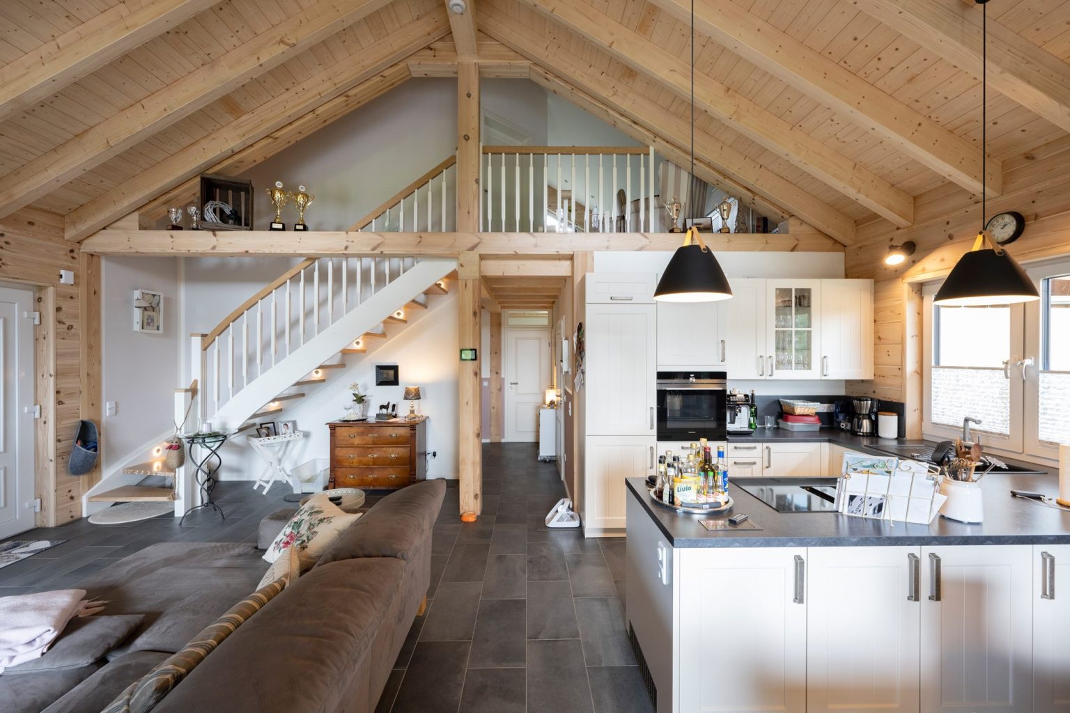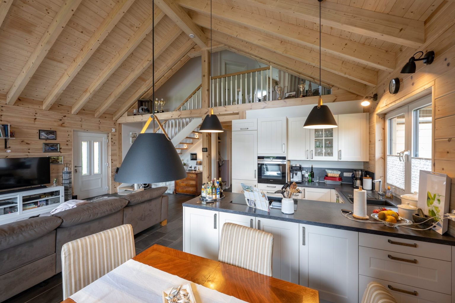 Das Holzhaus „Stader Sonne“ vereint Gegensätze, wie leicht und schwer oder hell und dunkel, die zusammen mit den Kiefernholzwänden zur Behaglichkeit des Einfamilienhauses beitragen. So sitzen zwei anthrazitfarbene Satteldächer mit unterschiedlichen Firsthöhen schwer auf zwei Kuben aus naturhellem Polarkiefernholz. Die Holzwände sind unterbrochen von vielen, teils bodentiefen Fenstern im gleichen anthrazit. Innen hingegen sind die Fenster weiß, genau wie die Haustüre außen anthrazit und innen weiß ist. Aufgenommen wird das weiß von den Trennwänden im Haus, von dem Geländer und den Wangen der Holztreppe, von den Zimmertüren und vom Küchenmobiliar. Die Böden, die Küchenarbeitsplatten und die Sofalandschaft sind dann wieder anthrazit. Das einfallende, natürliche Licht bringt den Sichtdachstuhl und die Kiefernwände zum Leuchten, wird von den weißen Flächen reflektiert und von den dunklen Flächen geschluckt. Die enorme Lichte im offenen Wohnbereich bewirkt Leichtigkeit, wo dunkle Bodenfliesen Bodenhaftung betonen.