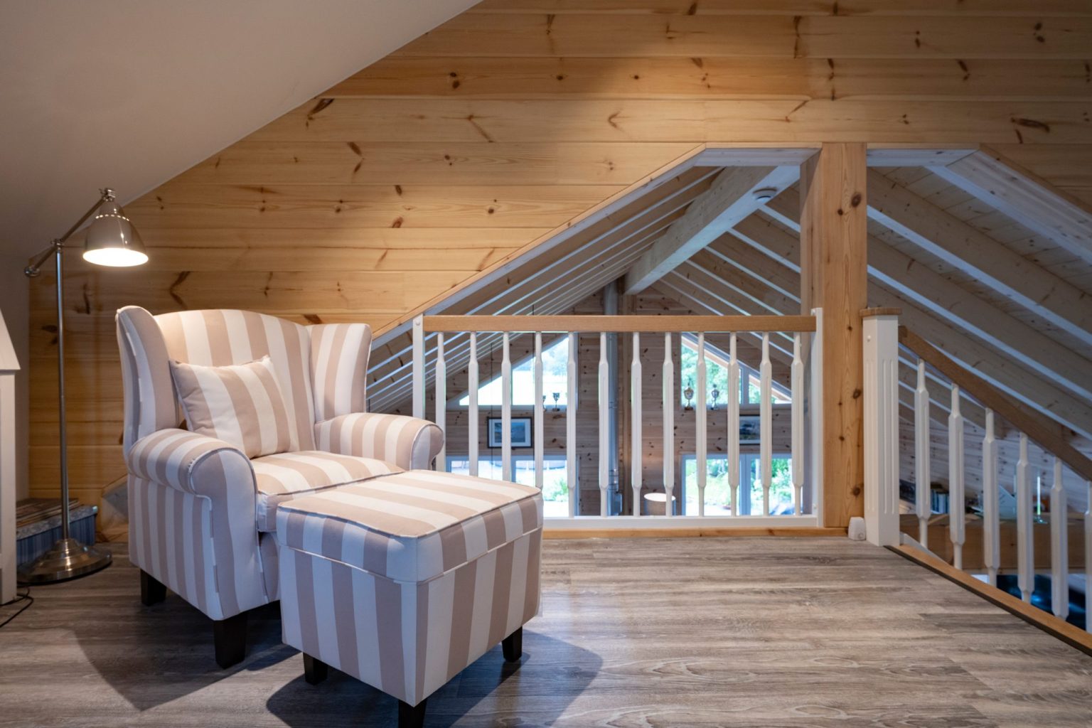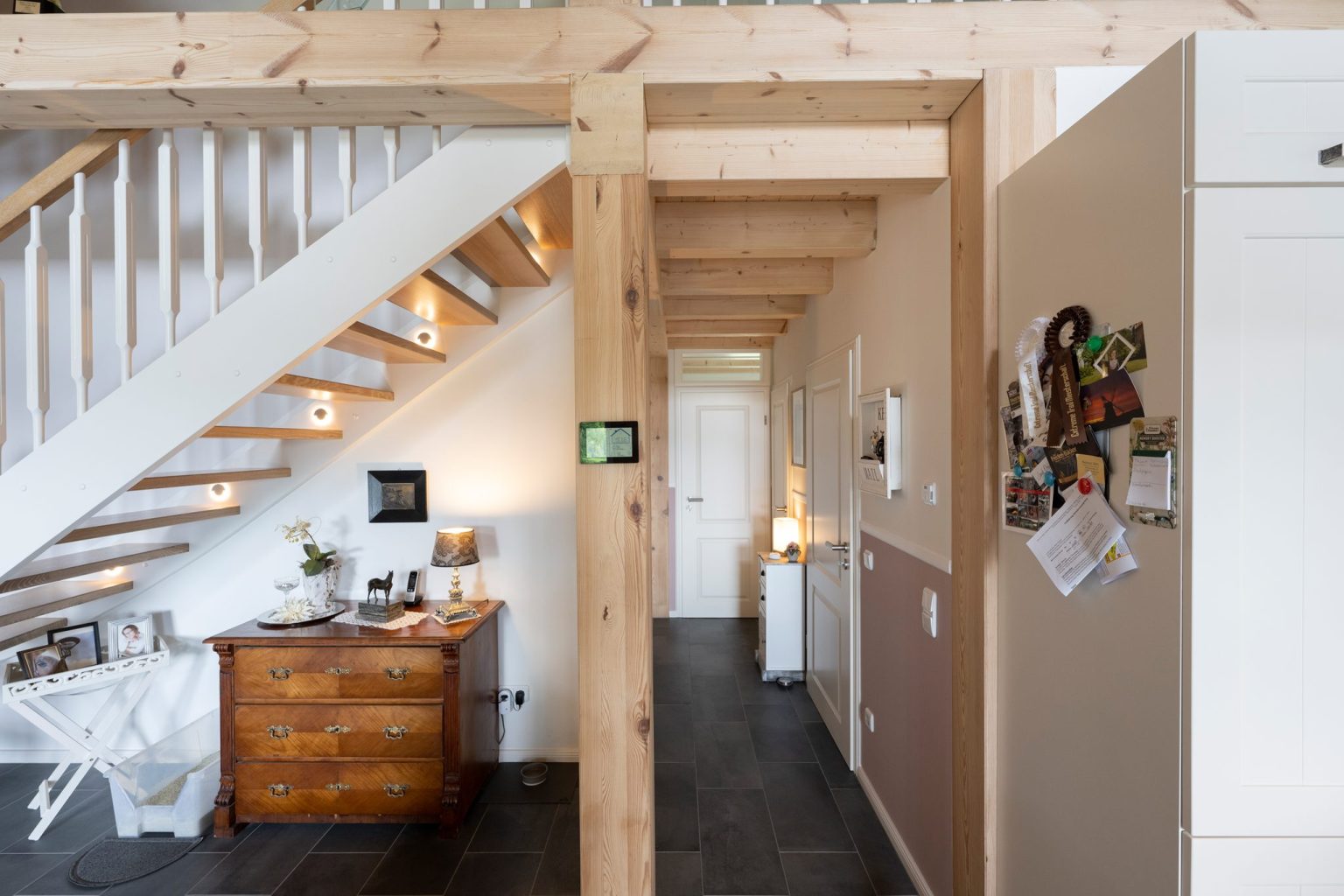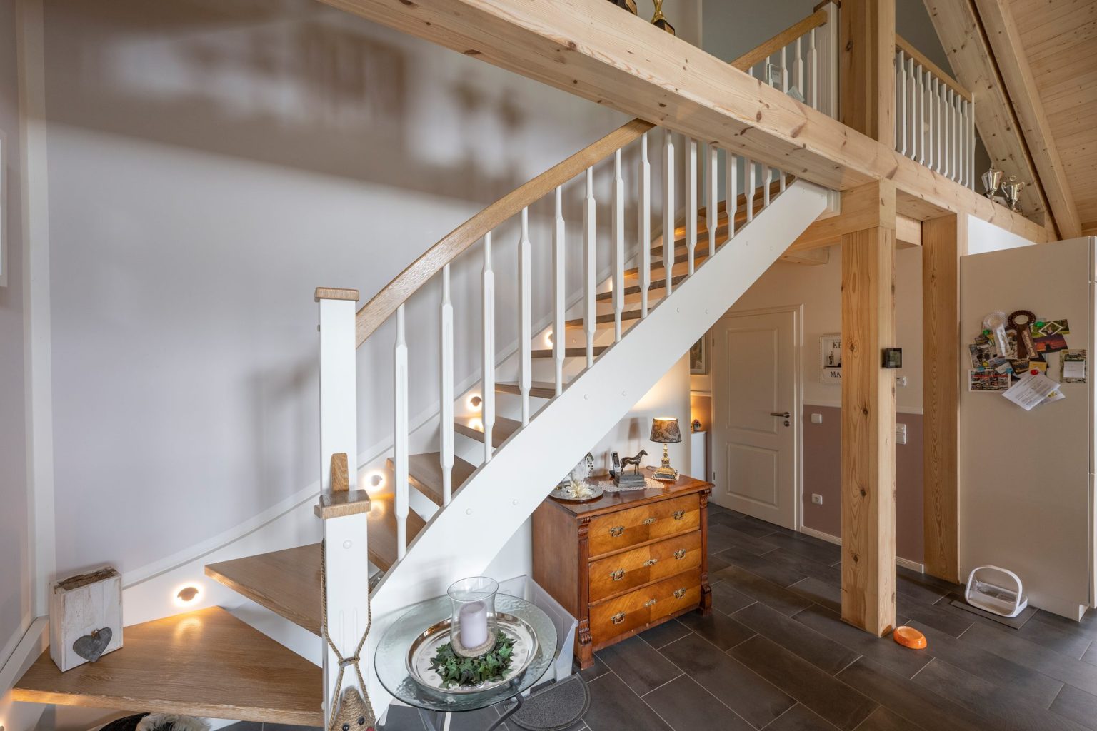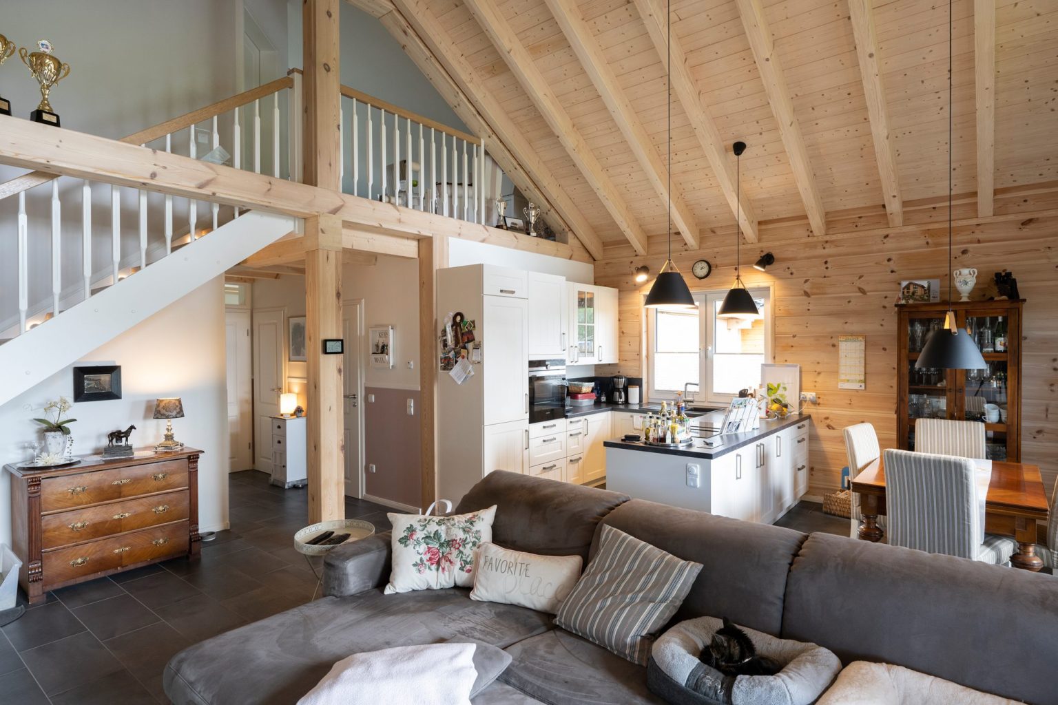 Die Hauseigentümer entschieden sich für eine Richtmeistermontage, bei der sie Holzhaus „Stader Sonne“ unter der Leitung und Vorarbeit eines Zimmermanns von Fullwood mit aufbauten. Einschließlich Innenausbau wurden sie kräftig von Familie, Freunden und Bekannten unterstützt. „Die Gewerke Heizung/Sanitär, Fenstereinbau, Elektrik, Kücheneinbau und Treppe ließen wir von Fachfirmen erledigen.“, so die Hausherrin. Das Stellen des Rohbaus inklusive Dachstuhl dauerte gerade mal drei Tage. „Die Richtmeistermontage verlief komplett problemlos.“, sagt Lars Tietjen. Den Hausentwurf hatte Fullwood auf Wunsch von ihm und seiner Frau im Vorfeld stark an ein bestehendes Kundenhaus mit zwei Gebäudehöhen angelehnt, dass den beiden in der Holzhaus Galerie auf der Website des Holzhausspezialisten besonders gut gefallen hatte. Außerdem ließen die Bauherren eigene Ideen einfließen, damit alles nach ihren individuellen Wohnbedürfnissen und Geschmack geplant wurde. „Neben einem gut funktionierendem Wohnalltag war uns größtmögliche Offenheit wichtig.“, beschreibt Anja Lange. Die gewünschte Offenheit im Raum bezieht sich dabei nicht nur auf die Wohnfläche, sondern auch auf die Lichte der Innenarchitektur. In den offenen Wohnbereich sind Küche, Esszimmer, Wohnzimmer, Treppe und Eingangsbereich integriert. Außerdem öffnet sich der Wohnbereich zu einem kleinen Flur, welcher zum Schlafzimmer, Badezimmer, Gäste-WC und Hauswirtschaftsraum führt, und ist bis zur sichtbaren Firstpfette hin offen. Oben grenzt eine Galerie an, die zum Lesen und Arbeiten genutzt wird und von der aus es in ein Kinderzimmer geht.