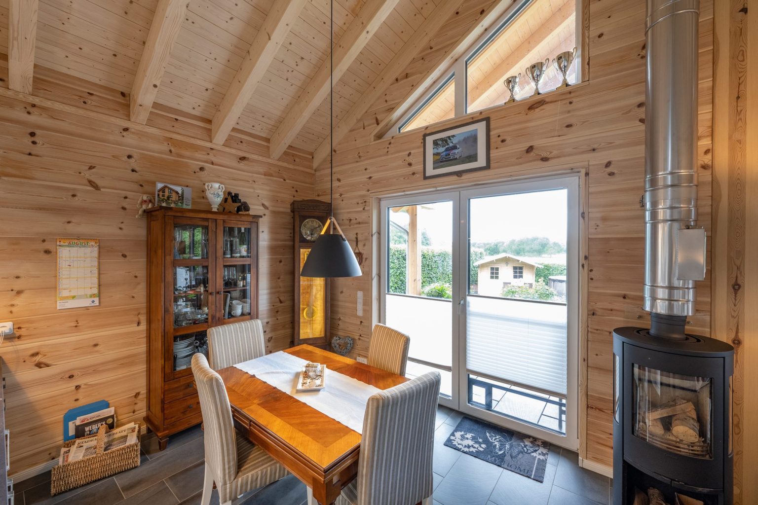 Beheizt wird Holzhaus „Stader Sonne“ mit Gas (Fußbodenheizung im ganzen Haus) und Holzscheiten (Kaminofen im Wohnbereich), unterstützt von solarer Warmwassererzeugung. Die Wände - in diesem Fall wurde mit der im Kern gedämmten Kombiblockwand gebaut - und die Dachdämmung sowie die 3-fach verglasten Fenster dämmen aber so gut, dass im Winter gar nicht so viel Heizenergie benötigt wird. Zudem bewirkt eine Umgebung aus Holz nachweislich eine 2-3 Grad höher gefühlte Temperatur, was nicht zu unterschätzen ist. Dank des 3,5 Meter großen Dachüberstandes an der zum Garten ausgerichteten Giebelseite, wird kein zusätzlicher Sonnenschutz an den Fenstern benötigt. Unter dem dort weit hervorragenden Dachüberstand befindet sich eine vor Regen und Sonne geschützte Terrasse, welche den Wohnbereich nach draußen erweitert. Die tief stehende, wärmende Wintersonne gelangt dennoch ins Haus, während die hochstehende, heiße Sommersonne abgeschirmt wird.