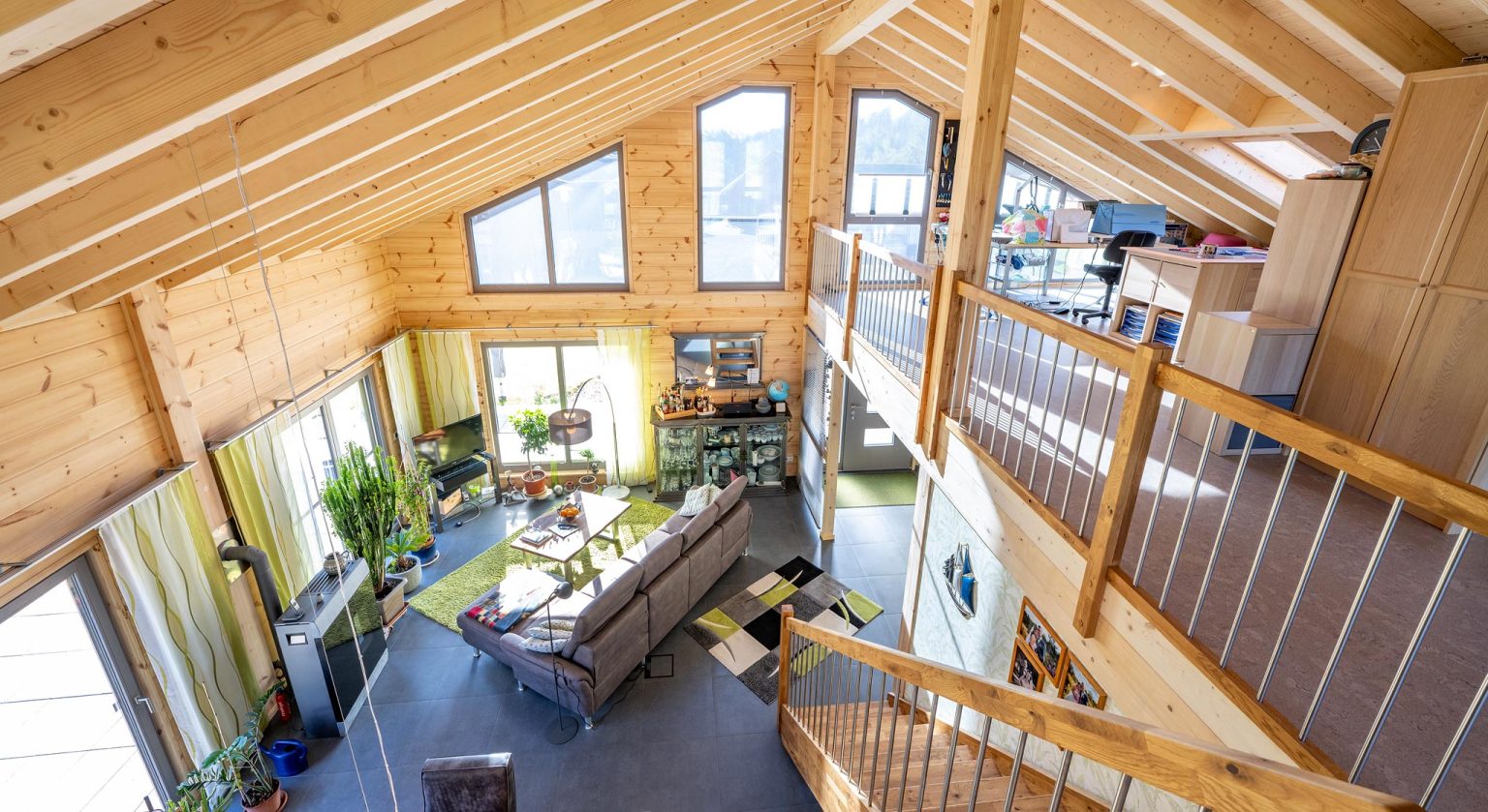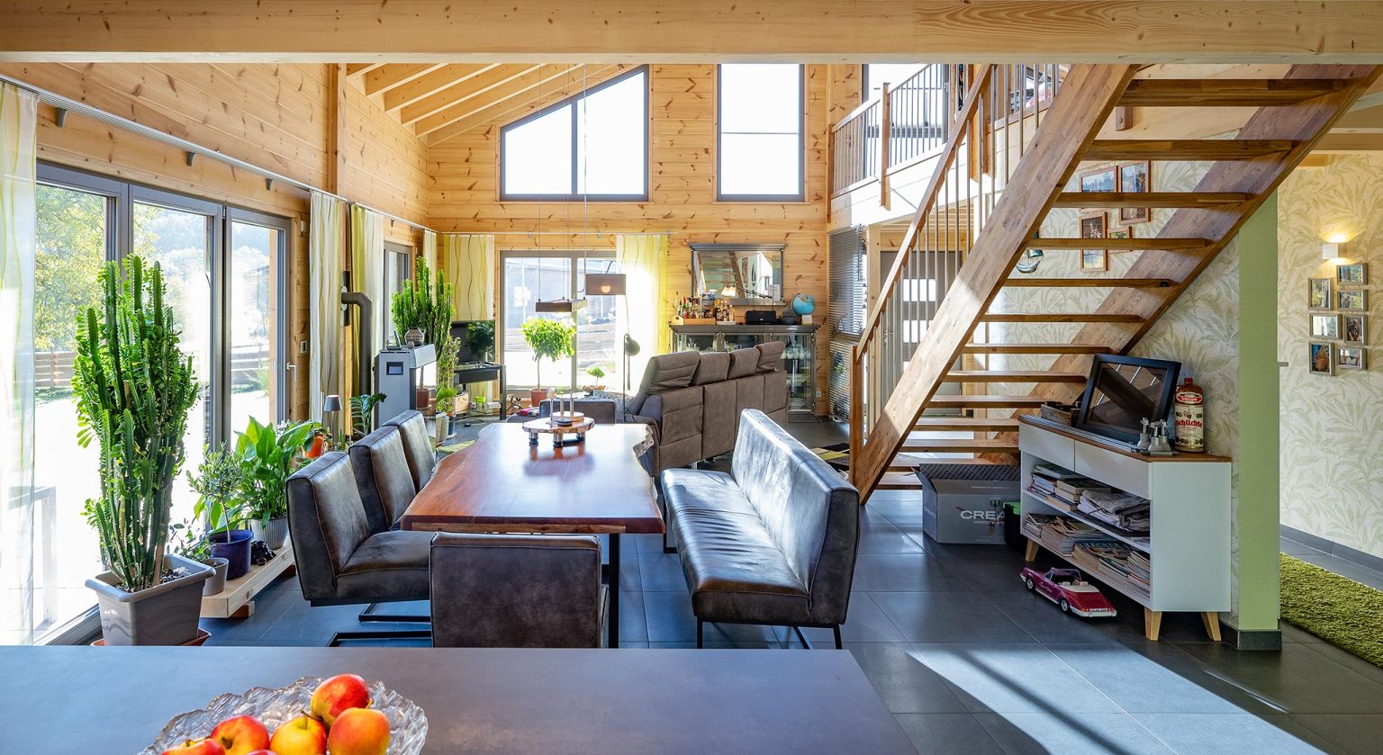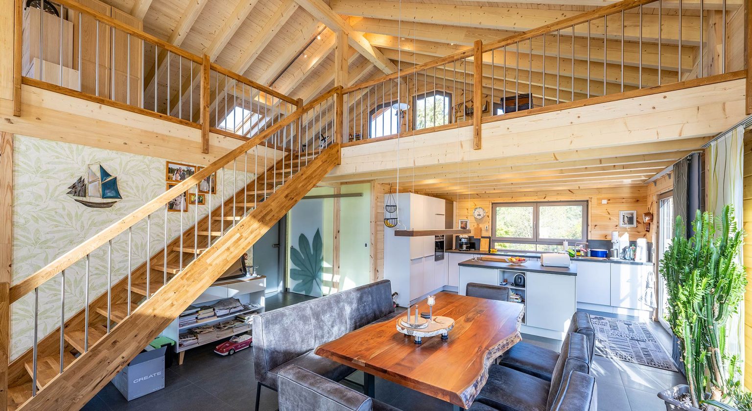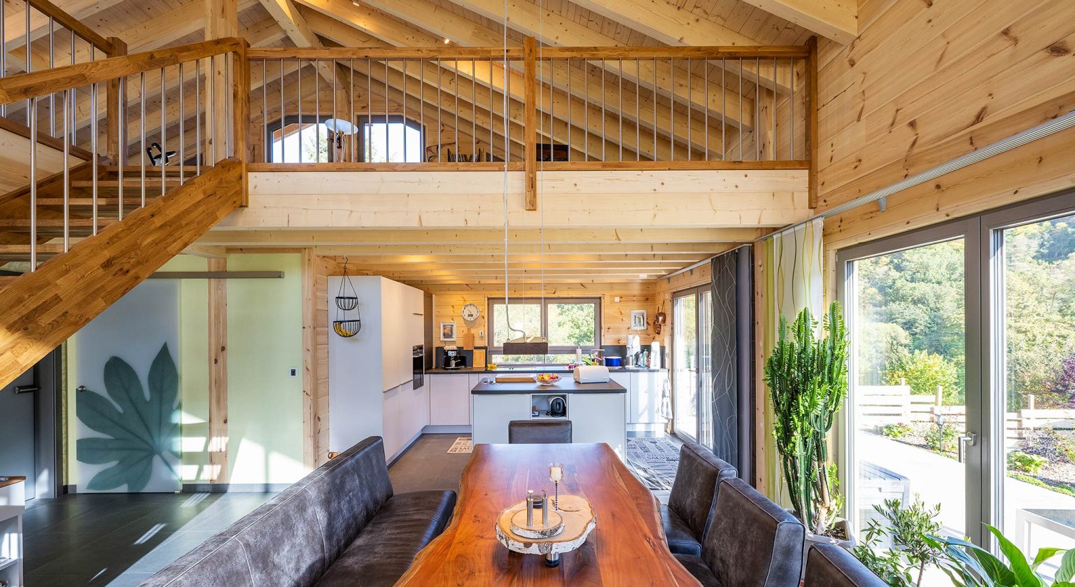 Um möglichst viel natürliches Licht ins Haus zu lassen, sind beide Giebelseiten verglast, die östliche Traufseite mit bodentiefen Fenstertüren versehen und die westliche Hälfte des Satteldachs mit zwei großen Dachfenstern ausgestattet. Der gesamte Wohnbereich im Erdgeschoss sowie die Galerie im Dachgeschoss sind daher tagsüber komplett lichtdurchflutet, ganz so, wie Roman und Gaby Papenberg es sich wünschten. „Trotz der großen Fenster benötigen wir im Sommer keine Klimaanlage und im Winter reicht unsere Fußbodenheizung mehr als aus. Das führen wir auf die guten Dämmeigenschaften der Kiefernholzwände zurück, sowie natürlich auf die gute Dachdämmung und die Wärmeschutzfenster.“, freut sich der Hauseigentümer. Er und seine Frau empfinden das Raumklima und die gesamte Atmosphäre im Haus als sehr wohltuend und angenehm und erfreuen sich überhaupt am guten Außenklima ihres Grundstücks am Waldrand. Als Heizenergielieferant wählten sie Pellets sowie unterstützend Solarthermie fürs Brauchwasser und die Fußbodenheizung. Ein kleines Balkonkraftwerk zur Stromerzeugung wurde nachträglich auf dem Gartenhäuschen montiert und eine große Regenwasserzisterne sammelt Gießwasser für den Garten.