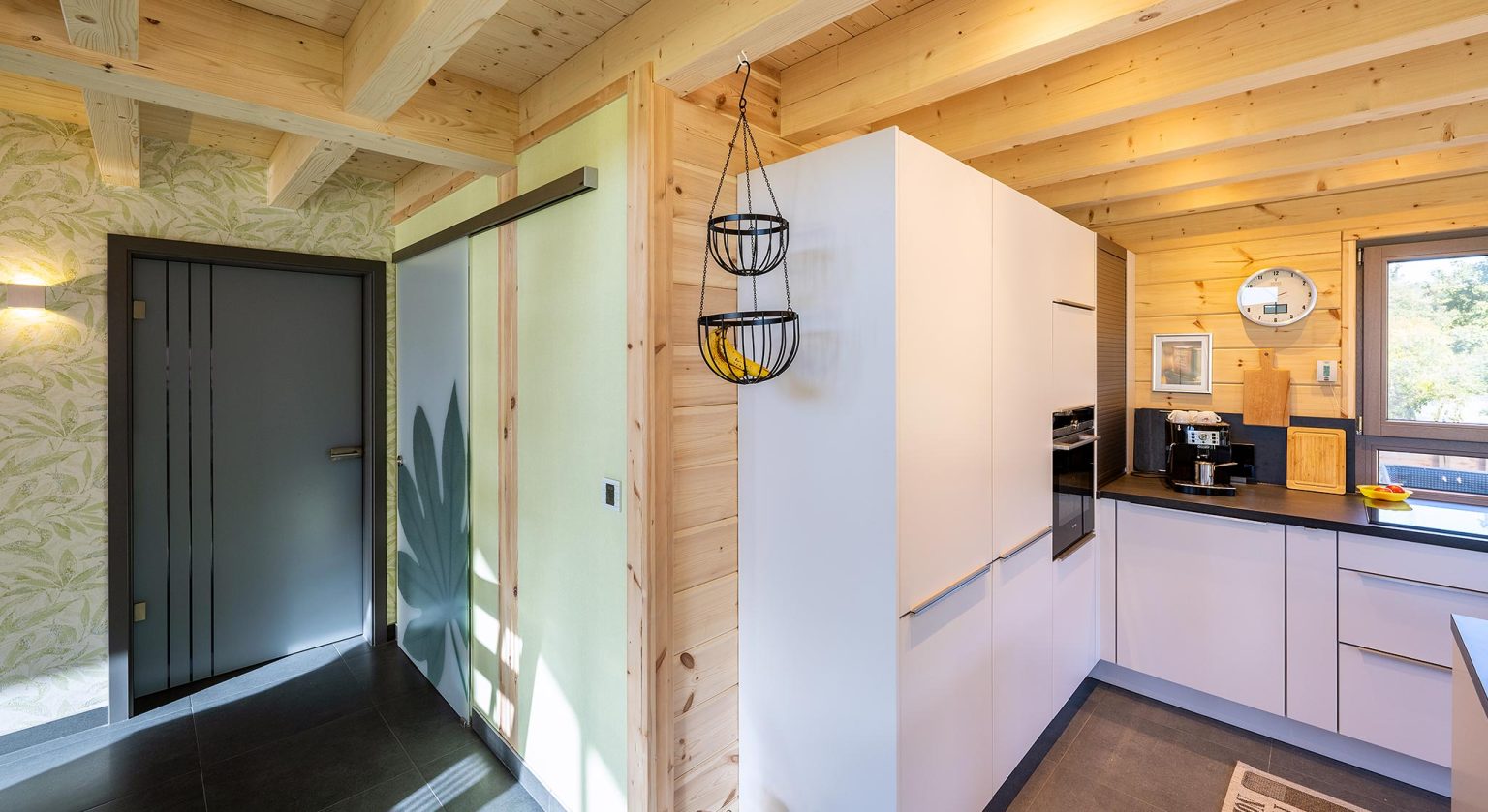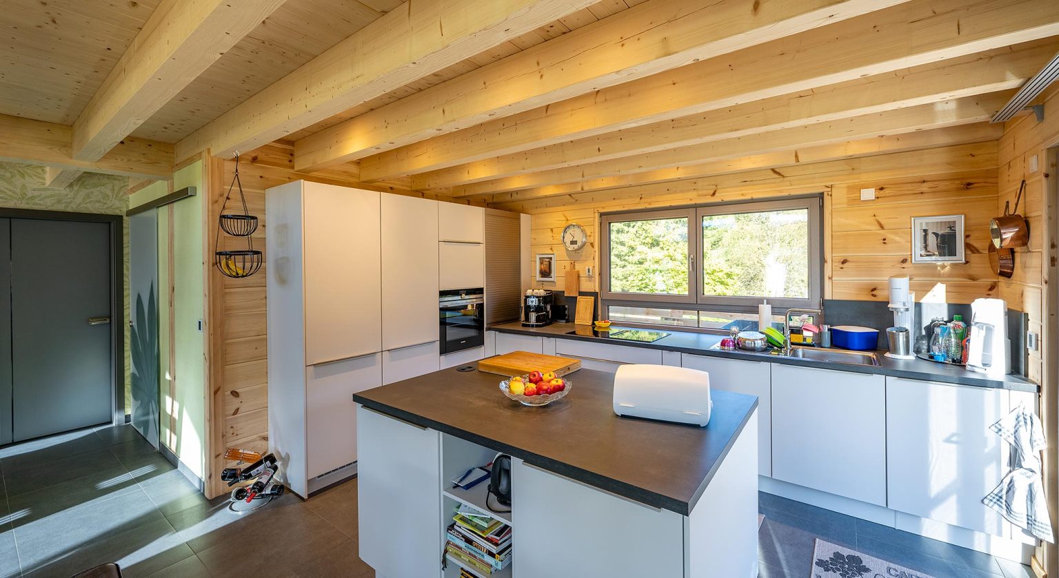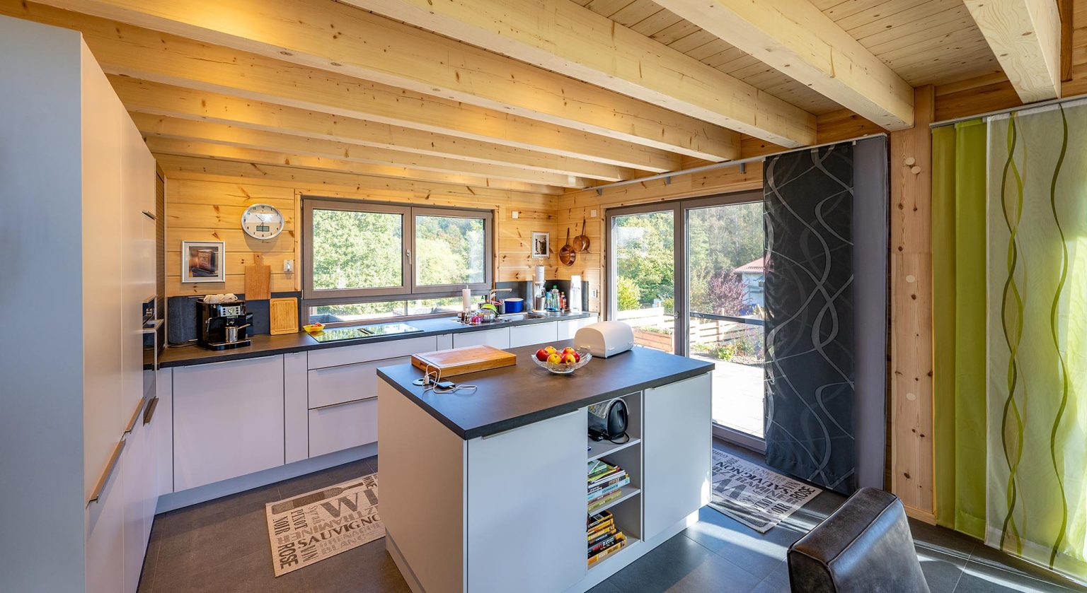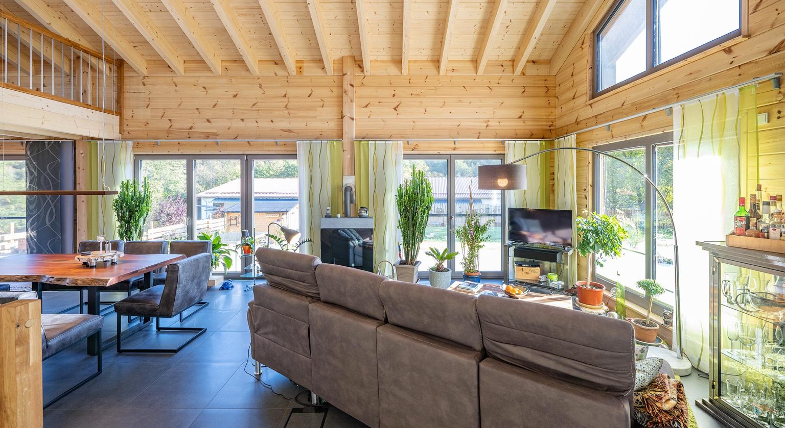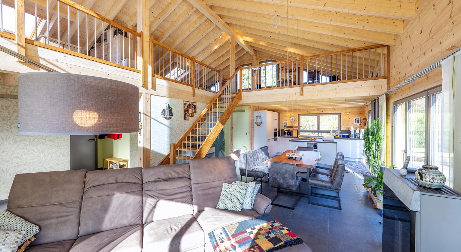 Um möglichst viel natürliches Licht ins Haus zu lassen, sind beide Giebelseiten verglast, die östliche Traufseite mit bodentiefen Fenstertüren versehen und die westliche Hälfte des Satteldachs mit zwei großen Dachfenstern ausgestattet. Der gesamte Wohnbereich im Erdgeschoss sowie die Galerie im Dachgeschoss sind daher tagsüber komplett lichtdurchflutet, ganz so, wie Roman und Gaby Papenberg es sich wünschten. „Trotz der großen Fenster benötigen wir im Sommer keine Klimaanlage und im Winter reicht unsere Fußbodenheizung mehr als aus. Das führen wir auf die guten Dämmeigenschaften der Kiefernholzwände zurück, sowie natürlich auf die gute Dachdämmung und die Wärmeschutzfenster.“, freut sich der Hauseigentümer. Er und seine Frau empfinden das Raumklima und die gesamte Atmosphäre im Haus als sehr wohltuend und angenehm und erfreuen sich überhaupt am guten Außenklima ihres Grundstücks am Waldrand. Als Heizenergielieferant wählten sie Pellets sowie unterstützend Solarthermie fürs Brauchwasser und die Fußbodenheizung. Ein kleines Balkonkraftwerk zur Stromerzeugung wurde nachträglich auf dem Gartenhäuschen montiert und eine große Regenwasserzisterne sammelt Gießwasser für den Garten.