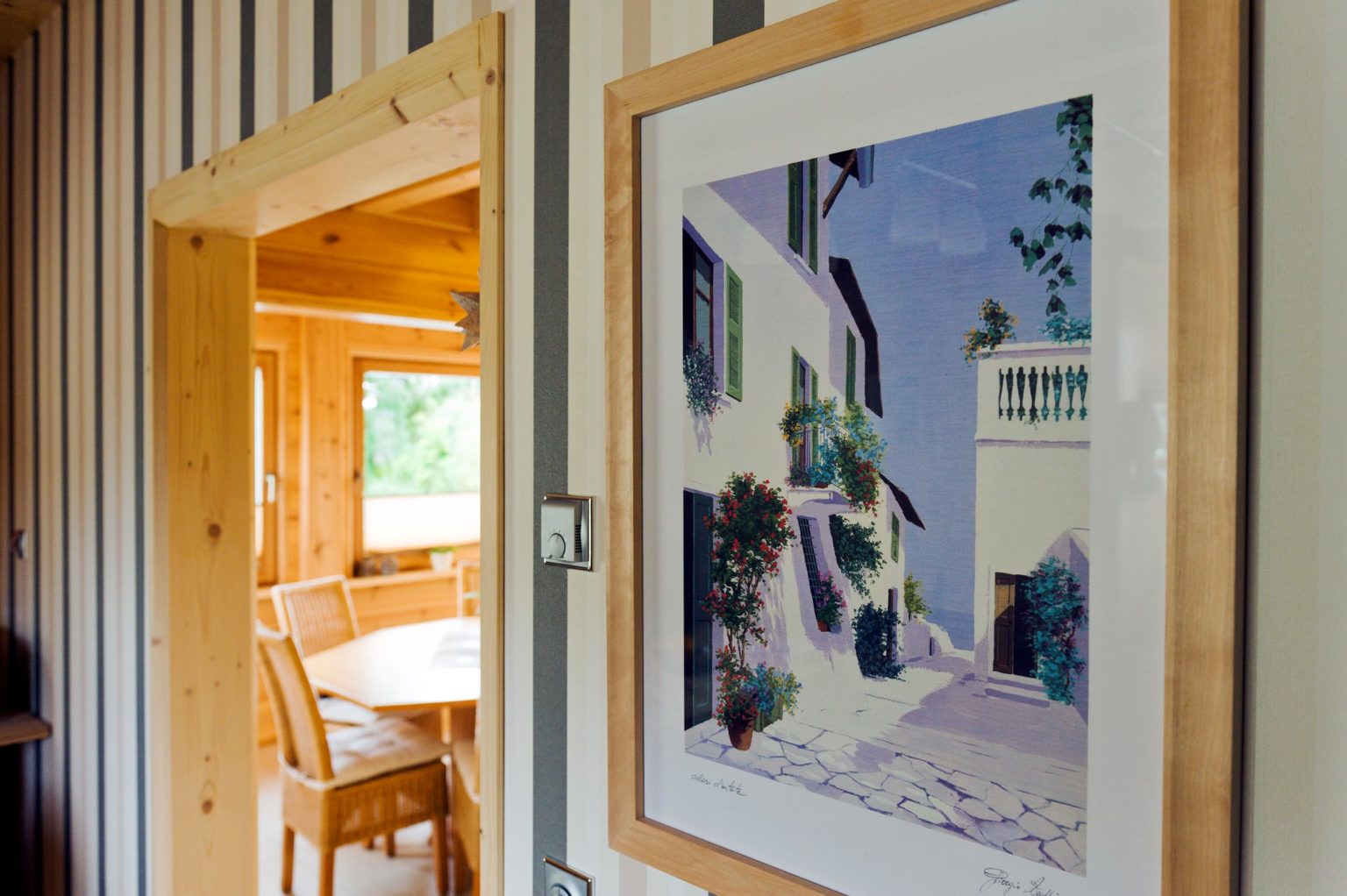 Der Hausherr packte bei der Montage der im Werk gefertigten Wandelemente selbst mit an. Dabei wurde er von einem erfahrenen Richtmeister des Holzhausspezialisten angeleitet. Nach nur zwei harten Arbeitstagen standen die Außenwände und der Zimmermannsdachstuhl war fertig, danach wurden die Fenster, ebenfalls aus Holz, eingebaut; das Dach eingedeckt und der gesamte Innenausbau (Trennwände, Böden, Sanitäranlagen, Elektrik) erledigt. Sämtliche Arbeiten machte der handwerklich versierte Hausbesitzer selbst. Beim Außenanstrich (gegen Nachdunkeln und Vergrauen) und beim Auftragen des UV-Schutzes drinnen half seine Frau ebenfalls mit. Für den Innenausbau - beispielsweise Fußböden, Aufdachdämmung, Fenster und Farben - verwendeten die Hauseigentümer ebenfalls hauptsächlich natürliche Materialien, die zum wohltuenden Raumklima beitragen.