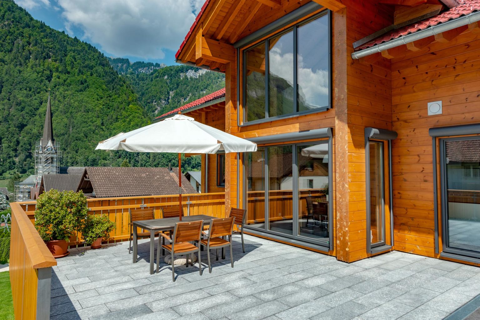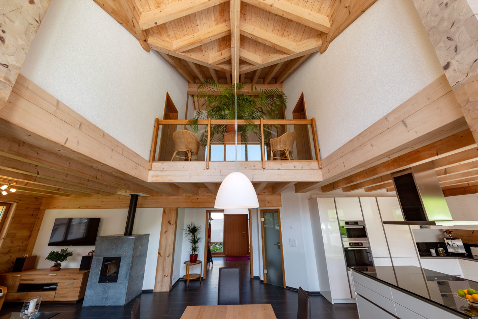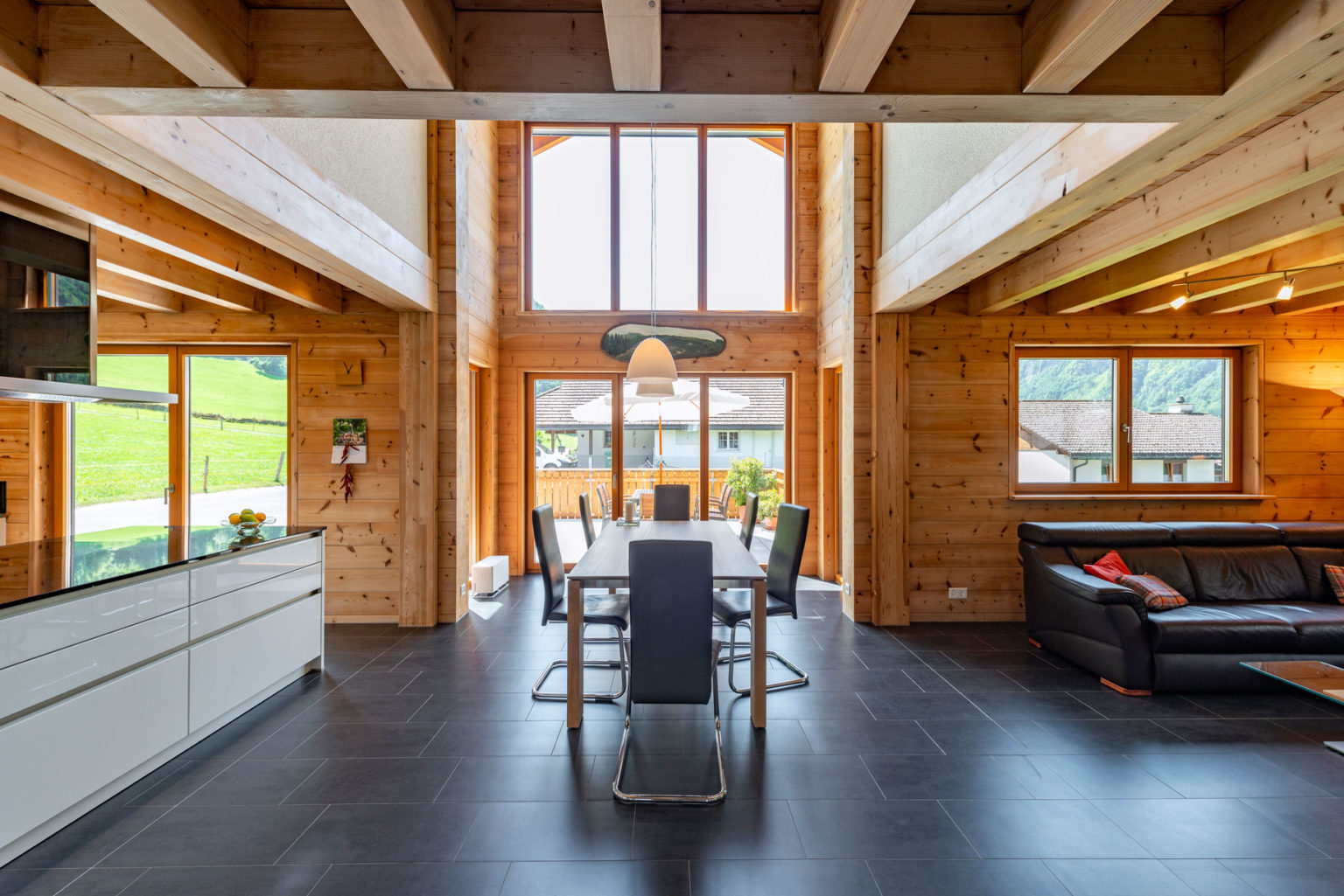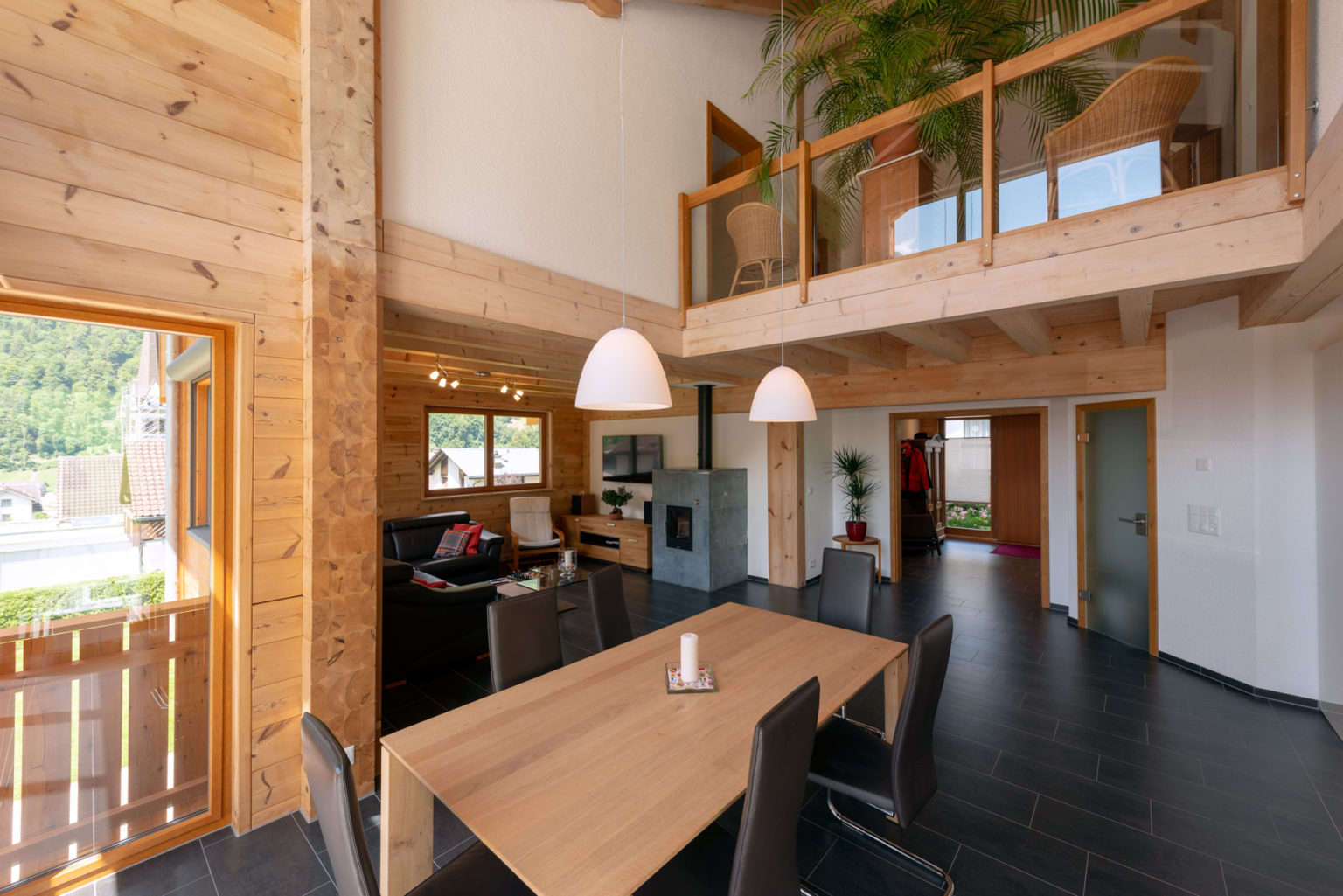 An der Südseite ist dem quaderförmigen Baukörper ein zweigeschossiges Zwerchhaus mit kleinem Satteldach vorgebaut. Es ist fast vollständig bodentief verglast, so dass reichlich natürliches Licht in den offenen Wohnbereich hineingelangt. Überhaupt besitzt Holzhaus „Tödiblick“ rundum viele große Fenster, damit es drinnen schön hell ist. Einige weiß verputzte Trennwände (Ständerbau) unterstreichen das helle, lichtverwöhnte Ambiente, so dass das Erdgeschoss durchaus seinen durchgängig anthrazit gefliesten Fußboden verträgt. „Wir haben die Holzwände innen mit UV-Schutz lasiert, damit sie nicht dunkler werden. Draußen bekamen sie einen Schutzanstrich gegen Vergrauung.“, erzählt der Eigentümer von Holzhaus „Tödiblick“. „Außerdem haben wir für die Fenster eine Kombination aus Holz (innen) und Aluminium (außen) gewählt und Rollläden angebracht.“ Eine Treppe aus Eichenholz und Edelstahl führt hinauf ins Dachgeschoss. Dort sind die Böden der Galerie, des Schlafzimmers und der beiden Kinderzimmer mit fußwarmen Eichendielen verkleidet, was Hausschuhe überflüssig macht. Des Weiteren gibt es ein großes Wohnbad und eine Sauna auf dieser Etage (beide gefliest), es bleibt also kein Wunsch offen. Von der Galerie blickt man hinab in den Wohnbereich oder geradeaus durch die großen Erkerfenster direkt auf die Spitze des Tödis. In besagtem Kellergeschoss gibt es neben dem Technikraum und einer Diele eine Einliegerwohnung, die vermietet ist. Sie besitzt eine eigene Gartenterrasse, wo sich auch der Wohnungseingang befindet. Das Eigentümerpaar genießt das großzügige, weitläufige Raumgefühl in seinem Holzhaus. Dank der Massivholzwände ist es dennoch überall sehr behaglich und sogar wohngesund.