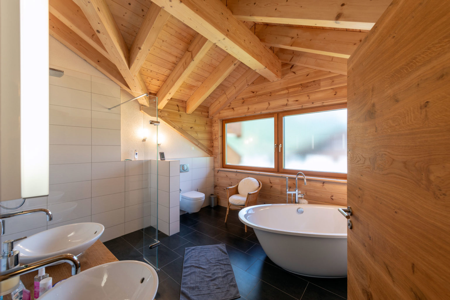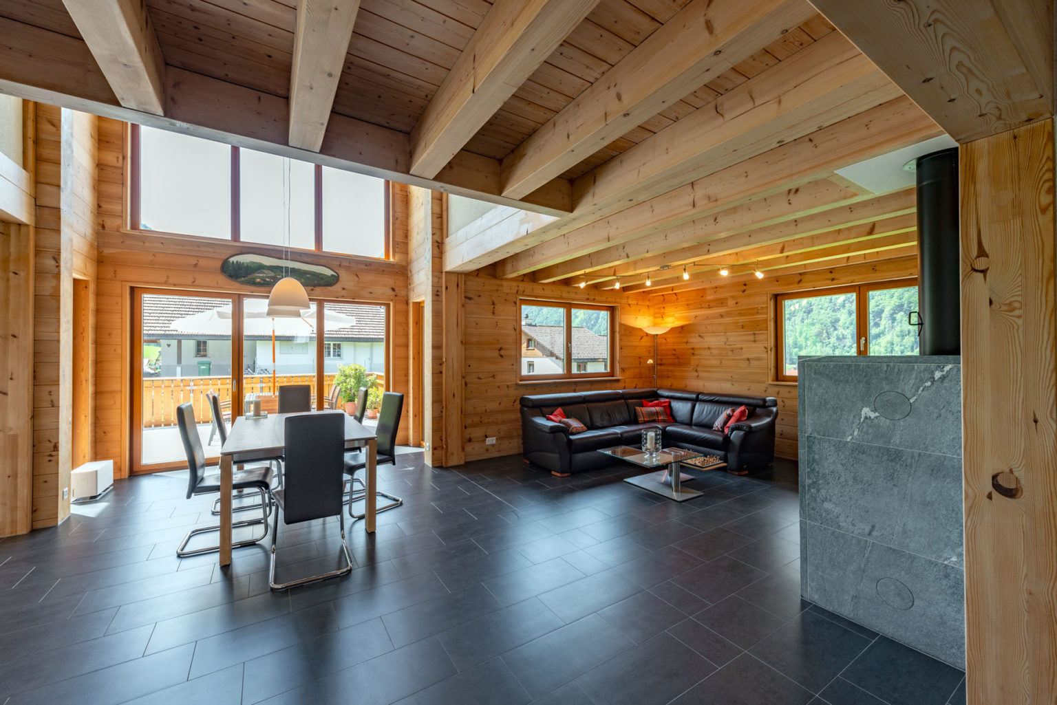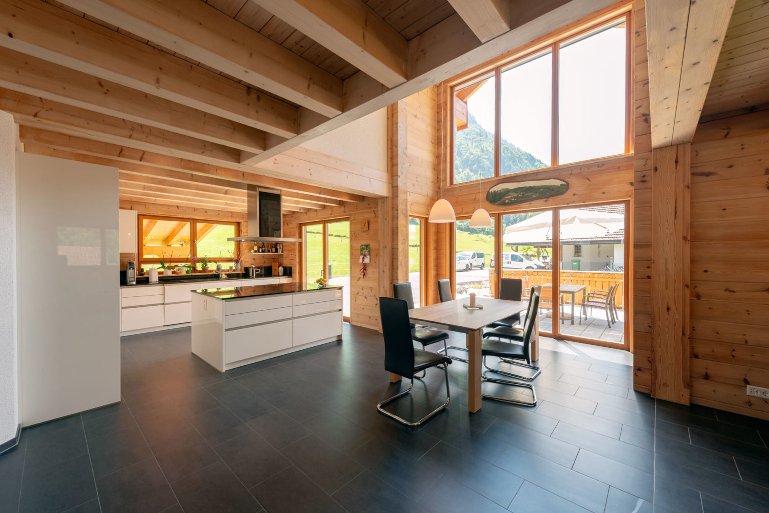 An der Südseite ist dem quaderförmigen Baukörper ein zweigeschossiges Zwerchhaus mit kleinem Satteldach vorgebaut. Es ist fast vollständig bodentief verglast, so dass reichlich natürliches Licht in den offenen Wohnbereich hineingelangt. Überhaupt besitzt Holzhaus „Tödiblick“ rundum viele große Fenster, damit es drinnen schön hell ist. Einige weiß verputzte Trennwände (Ständerbau) unterstreichen das helle, lichtverwöhnte Ambiente, so dass das Erdgeschoss durchaus seinen durchgängig anthrazit gefliesten Fußboden verträgt. „Wir haben die Holzwände innen mit UV-Schutz lasiert, damit sie nicht dunkler werden. Draußen bekamen sie einen Schutzanstrich gegen Vergrauung.“, erzählt der Eigentümer von Holzhaus „Tödiblick“. „Außerdem haben wir für die Fenster eine Kombination aus Holz (innen) und Aluminium (außen) gewählt und Rollläden angebracht.“ Eine Treppe aus Eichenholz und Edelstahl führt hinauf ins Dachgeschoss. Dort sind die Böden der Galerie, des Schlafzimmers und der beiden Kinderzimmer mit fußwarmen Eichendielen verkleidet, was Hausschuhe überflüssig macht. Des Weiteren gibt es ein großes Wohnbad und eine Sauna auf dieser Etage (beide gefliest), es bleibt also kein Wunsch offen. Von der Galerie blickt man hinab in den Wohnbereich oder geradeaus durch die großen Erkerfenster direkt auf die Spitze des Tödis. In besagtem Kellergeschoss gibt es neben dem Technikraum und einer Diele eine Einliegerwohnung, die vermietet ist. Sie besitzt eine eigene Gartenterrasse, wo sich auch der Wohnungseingang befindet. Das Eigentümerpaar genießt das großzügige, weitläufige Raumgefühl in seinem Holzhaus. Dank der Massivholzwände ist es dennoch überall sehr behaglich und sogar wohngesund.