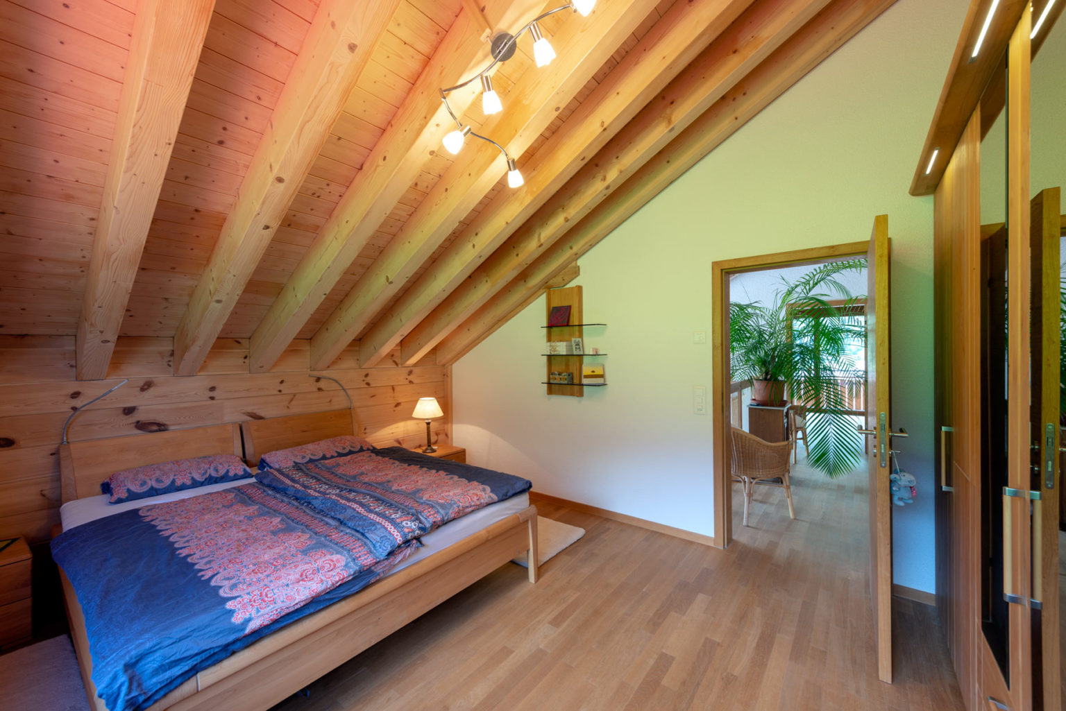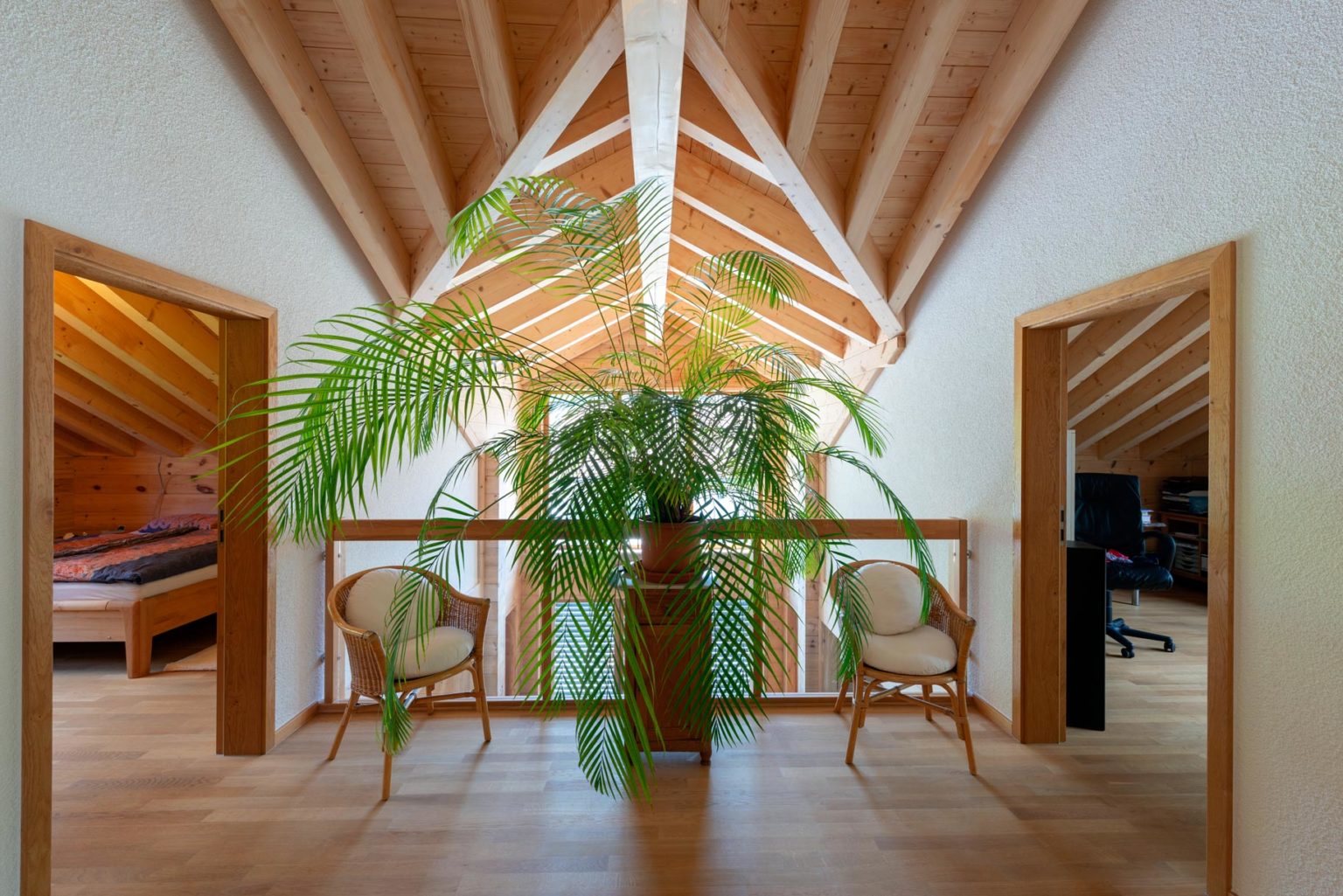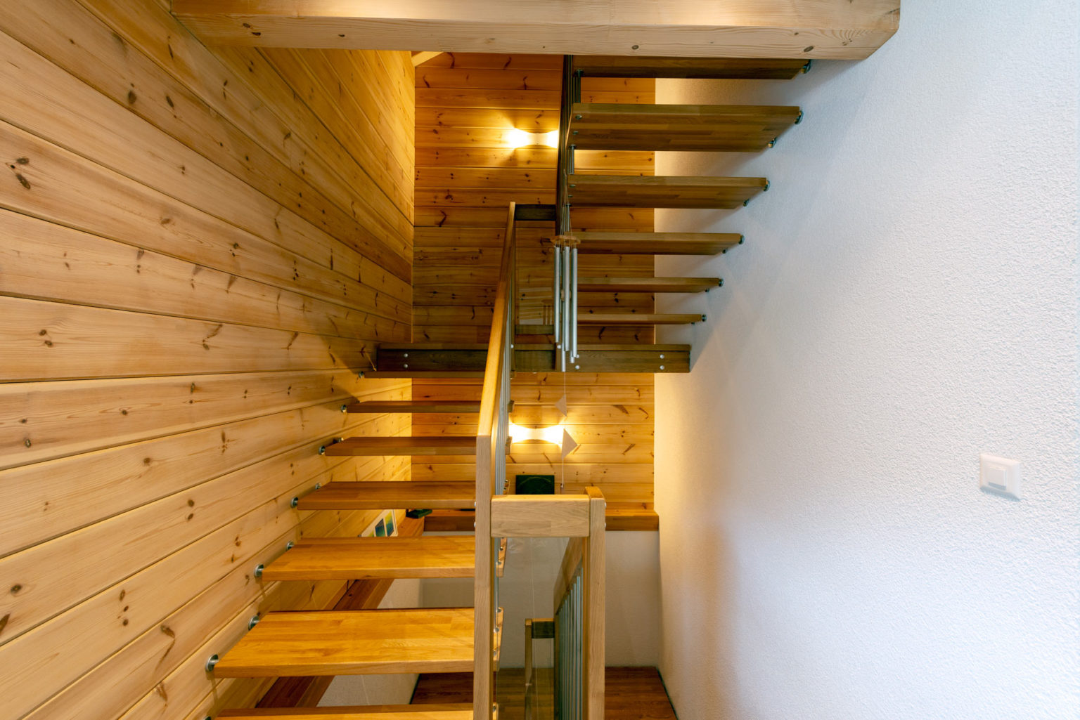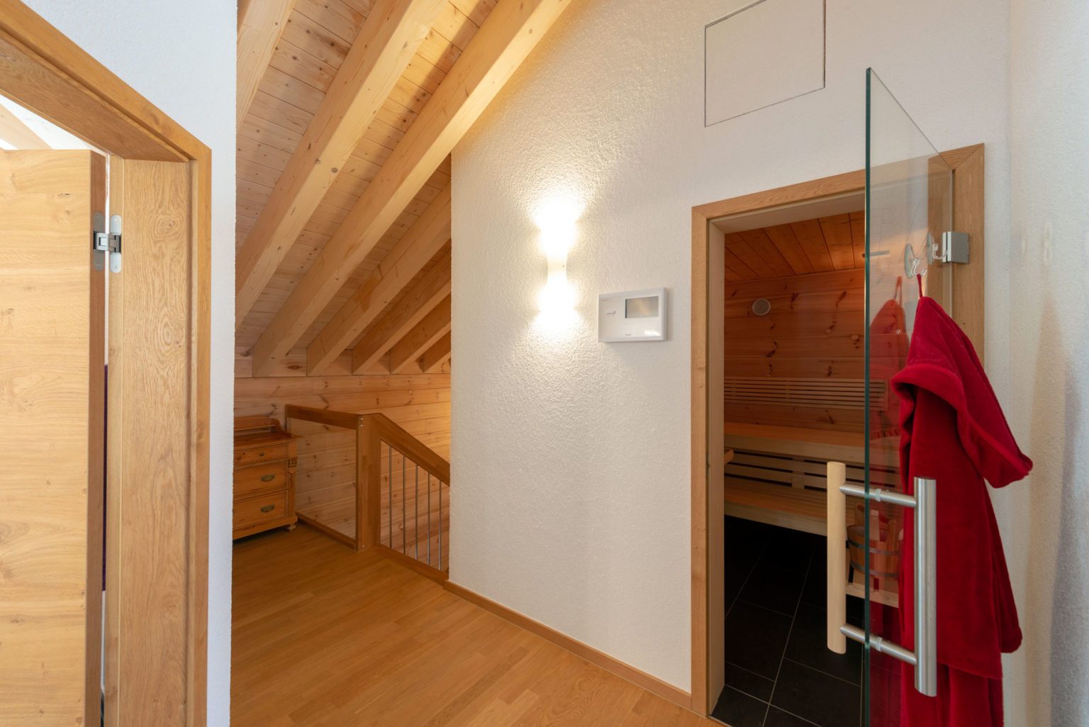 An der Südseite ist dem quaderförmigen Baukörper ein zweigeschossiges Zwerchhaus mit kleinem Satteldach vorgebaut. Es ist fast vollständig bodentief verglast, so dass reichlich natürliches Licht in den offenen Wohnbereich hineingelangt. Überhaupt besitzt Holzhaus „Tödiblick“ rundum viele große Fenster, damit es drinnen schön hell ist. Einige weiß verputzte Trennwände (Ständerbau) unterstreichen das helle, lichtverwöhnte Ambiente, so dass das Erdgeschoss durchaus seinen durchgängig anthrazit gefliesten Fußboden verträgt. „Wir haben die Holzwände innen mit UV-Schutz lasiert, damit sie nicht dunkler werden. Draußen bekamen sie einen Schutzanstrich gegen Vergrauung.“, erzählt der Eigentümer von Holzhaus „Tödiblick“. „Außerdem haben wir für die Fenster eine Kombination aus Holz (innen) und Aluminium (außen) gewählt und Rollläden angebracht.“ Eine Treppe aus Eichenholz und Edelstahl führt hinauf ins Dachgeschoss. Dort sind die Böden der Galerie, des Schlafzimmers und der beiden Kinderzimmer mit fußwarmen Eichendielen verkleidet, was Hausschuhe überflüssig macht. Des Weiteren gibt es ein großes Wohnbad und eine Sauna auf dieser Etage (beide gefliest), es bleibt also kein Wunsch offen. Von der Galerie blickt man hinab in den Wohnbereich oder geradeaus durch die großen Erkerfenster direkt auf die Spitze des Tödis. In besagtem Kellergeschoss gibt es neben dem Technikraum und einer Diele eine Einliegerwohnung, die vermietet ist. Sie besitzt eine eigene Gartenterrasse, wo sich auch der Wohnungseingang befindet. Das Eigentümerpaar genießt das großzügige, weitläufige Raumgefühl in seinem Holzhaus. Dank der Massivholzwände ist es dennoch überall sehr behaglich und sogar wohngesund.