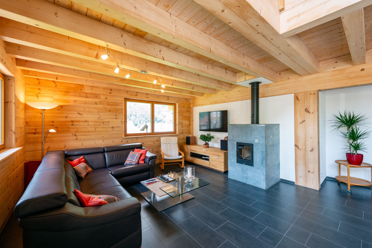 „Ursprünglich hatte ich ein etwas kleineres Haus geplant, wollte es dann aber doch größer haben.“, sagt der Hausherr. Der Eingang befindet sich an der Nordseite, aus Straßensicht ist das hinter dem Haus. Von dort gelangt man in eine sehr große Diele mit Treppenhaus und Zugängen zum Wohnbereich, in ein großes Gästezimmer und in eine Gäste-Dusche/WC. Die Diele ist zum Wohnbereich hin offen, genau wie der Wohnbereich selbst. Hier befinden sich Sofalandschaft, Esszimmer und Küche in einem weitläufigen Raum. Nahe der Küche führt eine Tür zum fensterlosen Hauswirtschaftsraum. Ein imposanter Specksteinofen aus Graubünden speichert 24 Stunden lang Wärme und gibt diese an den Wohnbereich ab, allerdings dauert es acht Stunden, bis er richtig durchwärmt ist. „Wir haben hier lange Winter, die hart sein können, deshalb wäre der Specksteinofen zu umständlich bei zwei berufstätigen Personen. Er dient der Gemütlichkeit. Ansonsten beheizen wir unsere Fußbodenheizung mittels einer modernen Luftwärmepumpe.“, erklärt der Hausbesitzer. Die langen Winter sind auch der Grund für die großzügige Diele: Hier müssen in der schneereichen Jahreszeit viele Sachen unterkommen, von Winterschuhen über Skiklamotten bis hin zu Schneeschuhen. Außerdem passt zu einem großzügigen Haus nun mal eine ebensolche Eingangshalle besser.